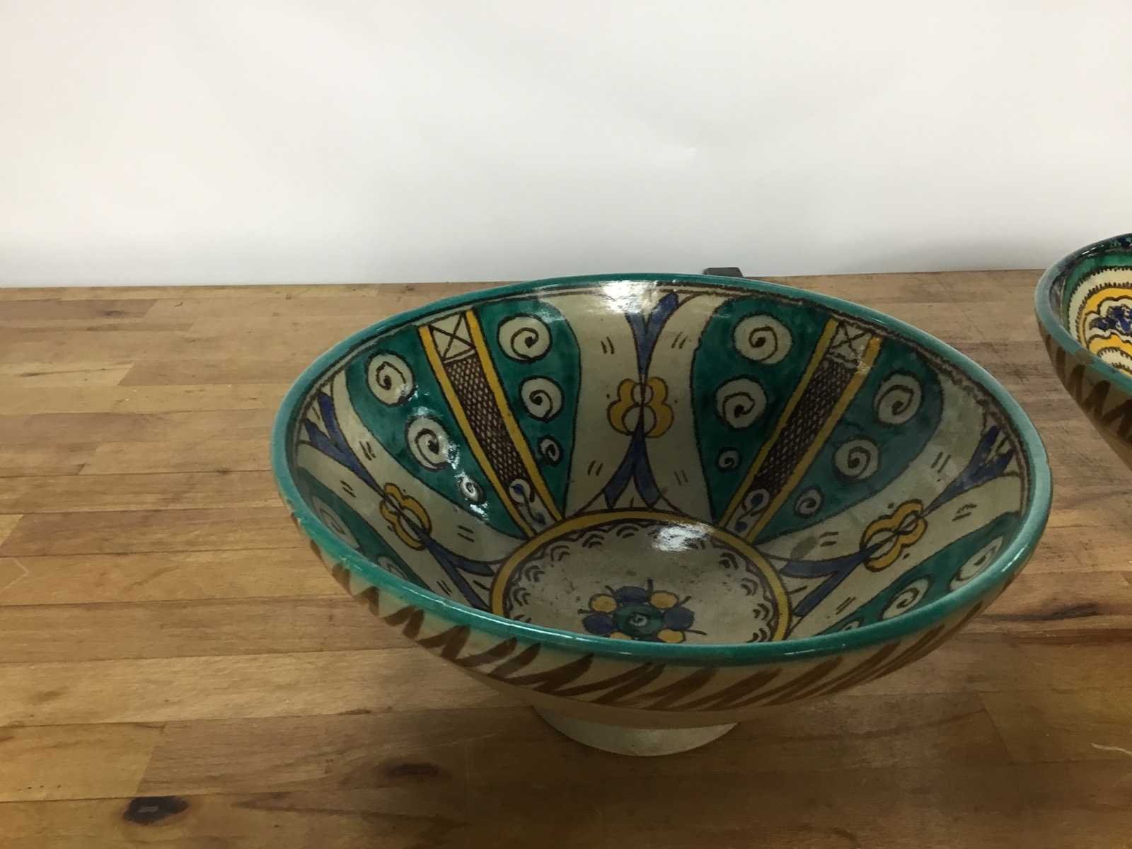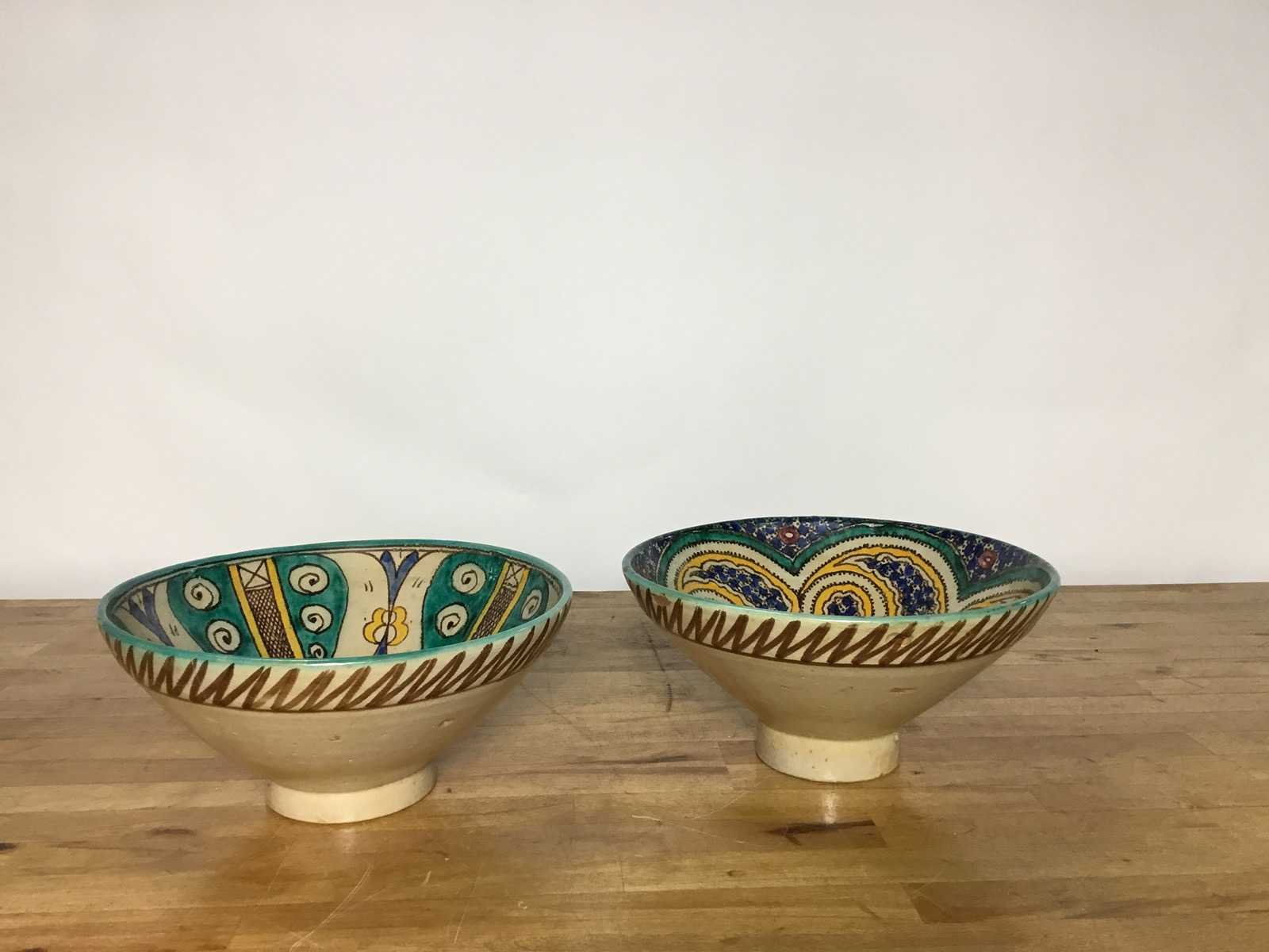 De traditionele, handgemaakte Marokkaanse polychrome kom, waarschijnlijk uit Fez. Materiaal: Handgeschilderd aardewerk. Ontwerp: Kenmerkend door complexe geometrische en bloemmotieven in felle kleuren zoals blauw, groen en geel. Product type: Marokkaanse polychrome kom Lengte: 29cm Hoogte: 14cm