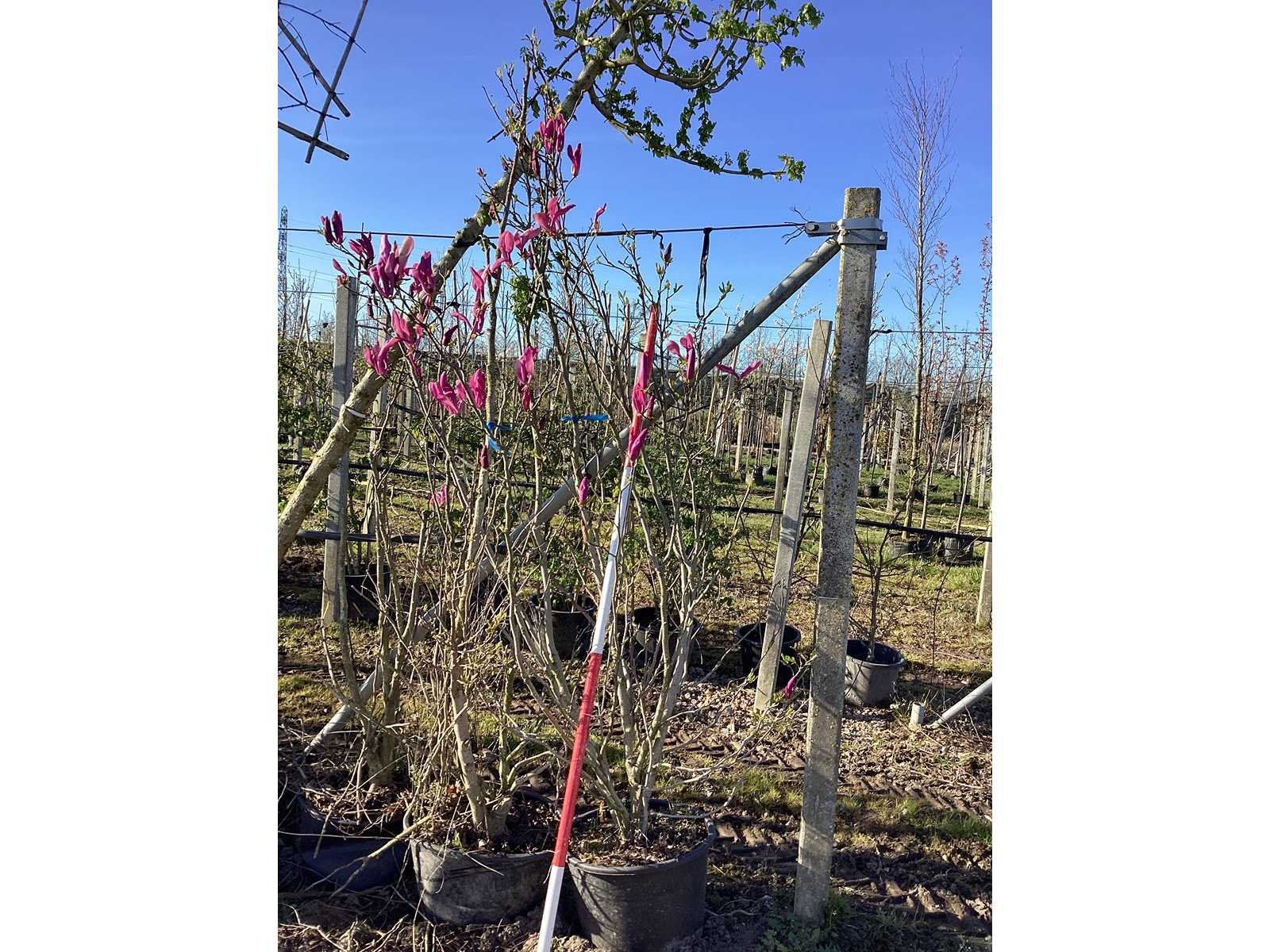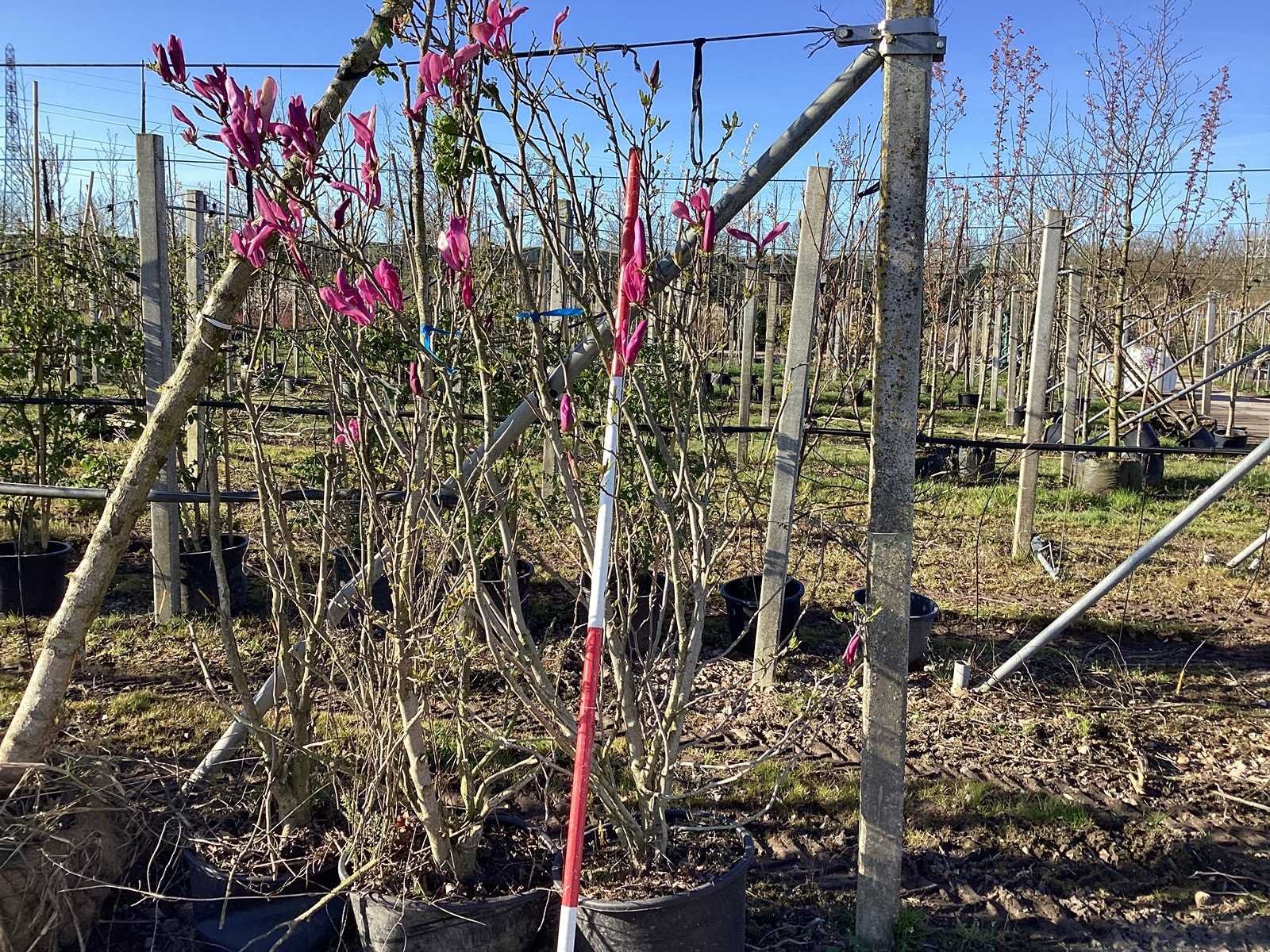 De kavels worden door ons verzameld en klaargelegd voor transport; Wilt u gebruik maken van de bezorgservice neem dan contact op via het emailadres arina@groviatrees.com. Voor overige vragen bel 0645641495 of 0633049344 Type: Valse Tulpenboom Latijnse benaming: Magnolia susan Hoogte ca.: 200cm In pot: true Stamdikte: 15cm