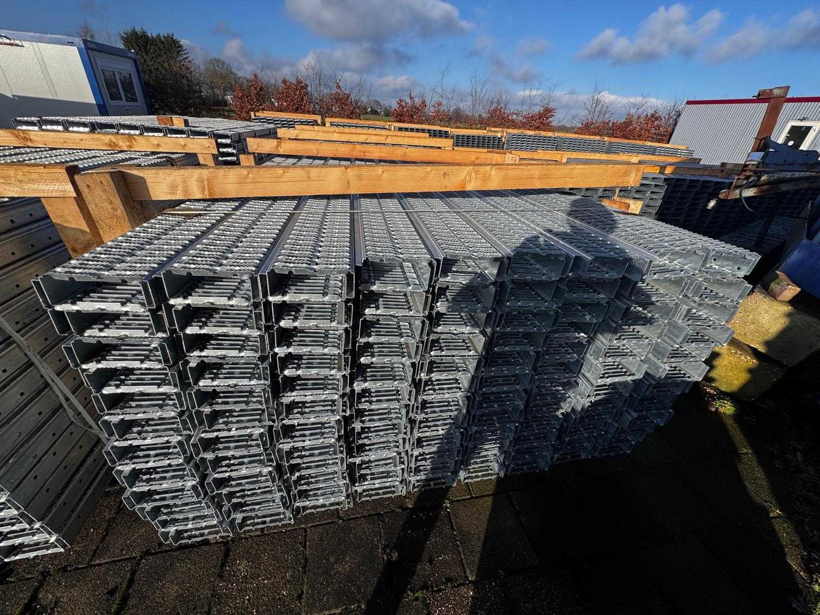 4 ton gestapelde gegalvaniseerde stalen vloerpanelen gebruikt voor industriële bouwvloeren. De panelen zijn netjes op een houten pallet geplaatst, klaar voor installatie of transport. Deze elementen worden doorgaans gebruikt als dragende componenten in mezzanines, fabrieksvloeren of verhoogde platforms, en bieden sterke en duurzame ondersteuning voor zware industriële toepassingen. Op de achtergrond zijn verschillende grote transportkisten te zien in een magazijnomgeving. Per paneel: LANG- 3M HOOGTE - 75MM BREEDTE - 0,20M GEWICHT - 18,4 KG Afmeting l: 3000mm Afmeting b: 2350mm