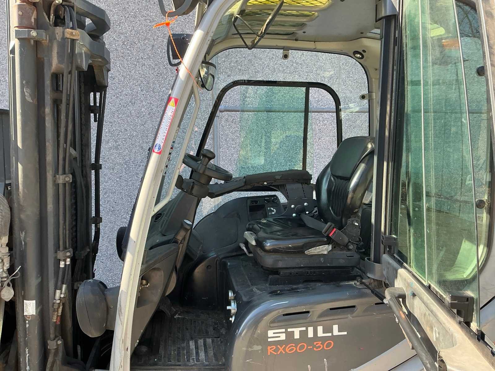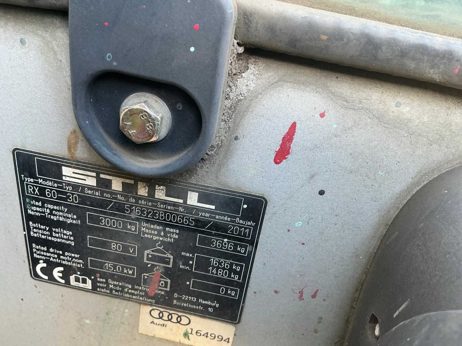 Geen oplader Merk: Still Type: RX60-30 Bouwjaar: 2011 Serienummer: 516323b00665 Brandstof: Elektrisch Mast: Triple Soort band: Volrubberbanden Aantal wielen: 4 Afgelezen urenstand: 5959 Eigen gewicht: 3696kg Lepellengte: 1600mm Totale afmeting L: 2400mm Totale afmeting Breedte: 1300mm Totale afmeting Hoogte: 2300mm