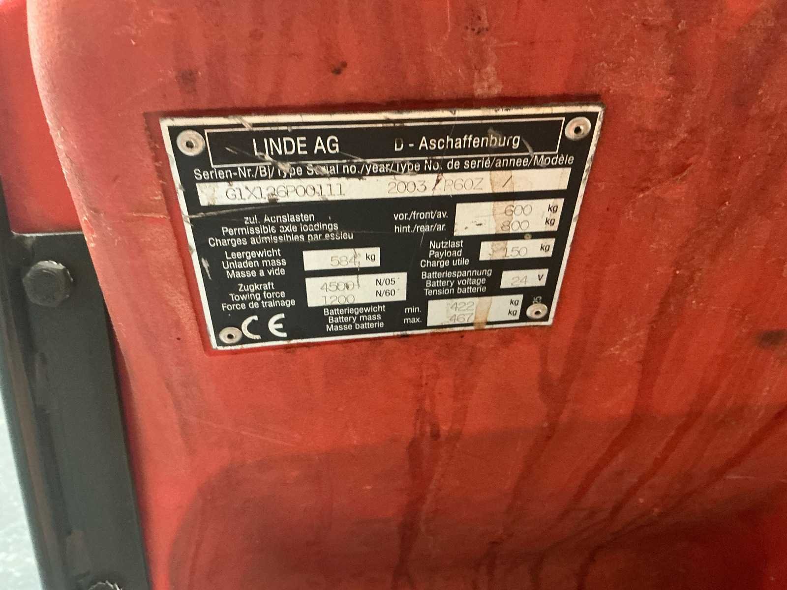 Uurtelling ca. 126:38; gewicht zonder accu 584 kg; trekkracht 4500 N/05 1200 N/60; batterijgewicht minimaal 422 kg, maximaal 467 kg; batterijspanning 24V; Capaciteit: 150 kg Geen oplader Merk: Linde Type: P60Z Bouwjaar: 2003 Serienummer: G1X126P00111 Totale afmeting L: 2000mm Totale afmeting Breedte: 1050mm Totale afmeting Hoogte: 1500mm