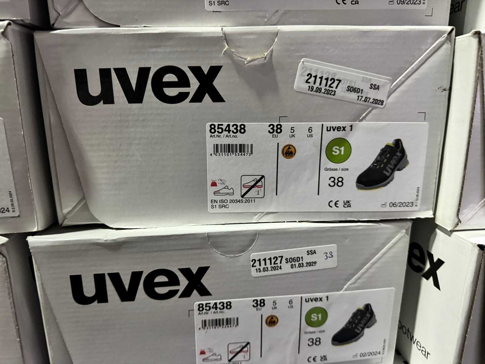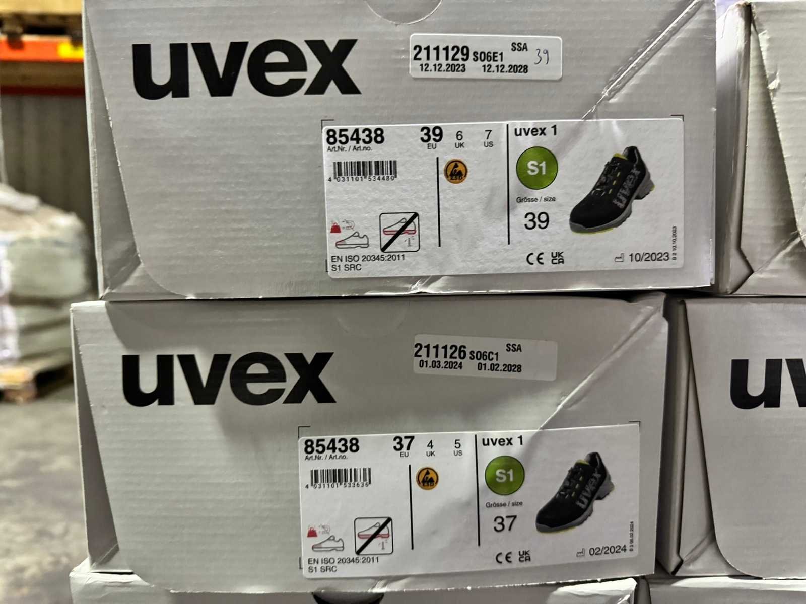 Maten: 50,49,47,46,45,44,40,39,38,37,36 Niet gebruikt in de doos Op pallet en readz om op te halen. Merk: Uvex Model: 1 Product type: S1