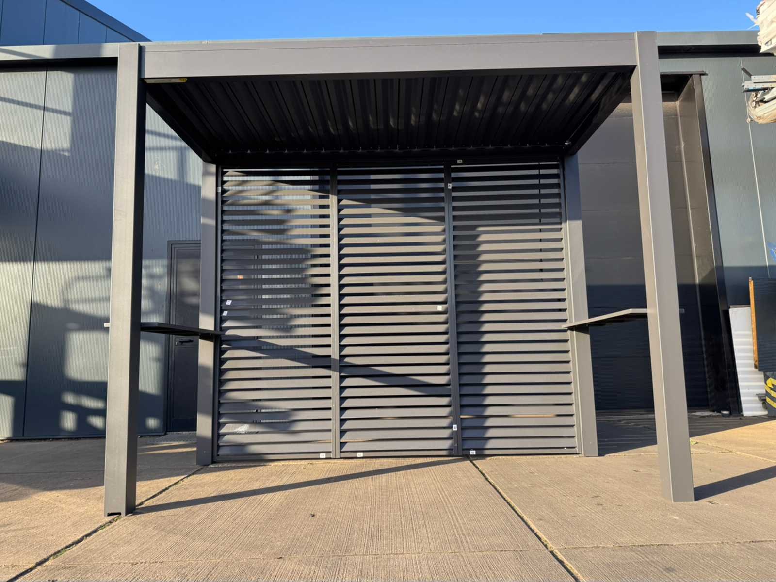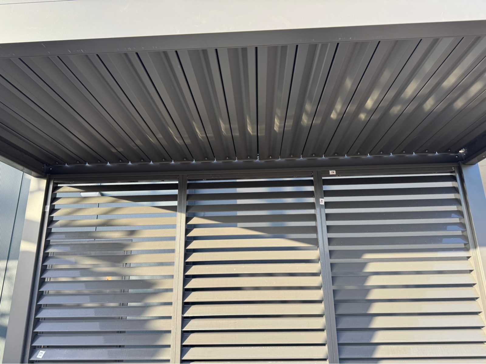 Ongebruikt; gedemonteerd geleverd in dozen; uiteraard inclusief al het benodigde klein materiaal zoals schroeven e.d; diepte is ca 1520mm; lamellen in het dak zijn open en dicht te doen dmv een handmatige slinger Lengte: 300cm Breedte: 152cm Hoogte: 255cm Materiaal: Aluminium