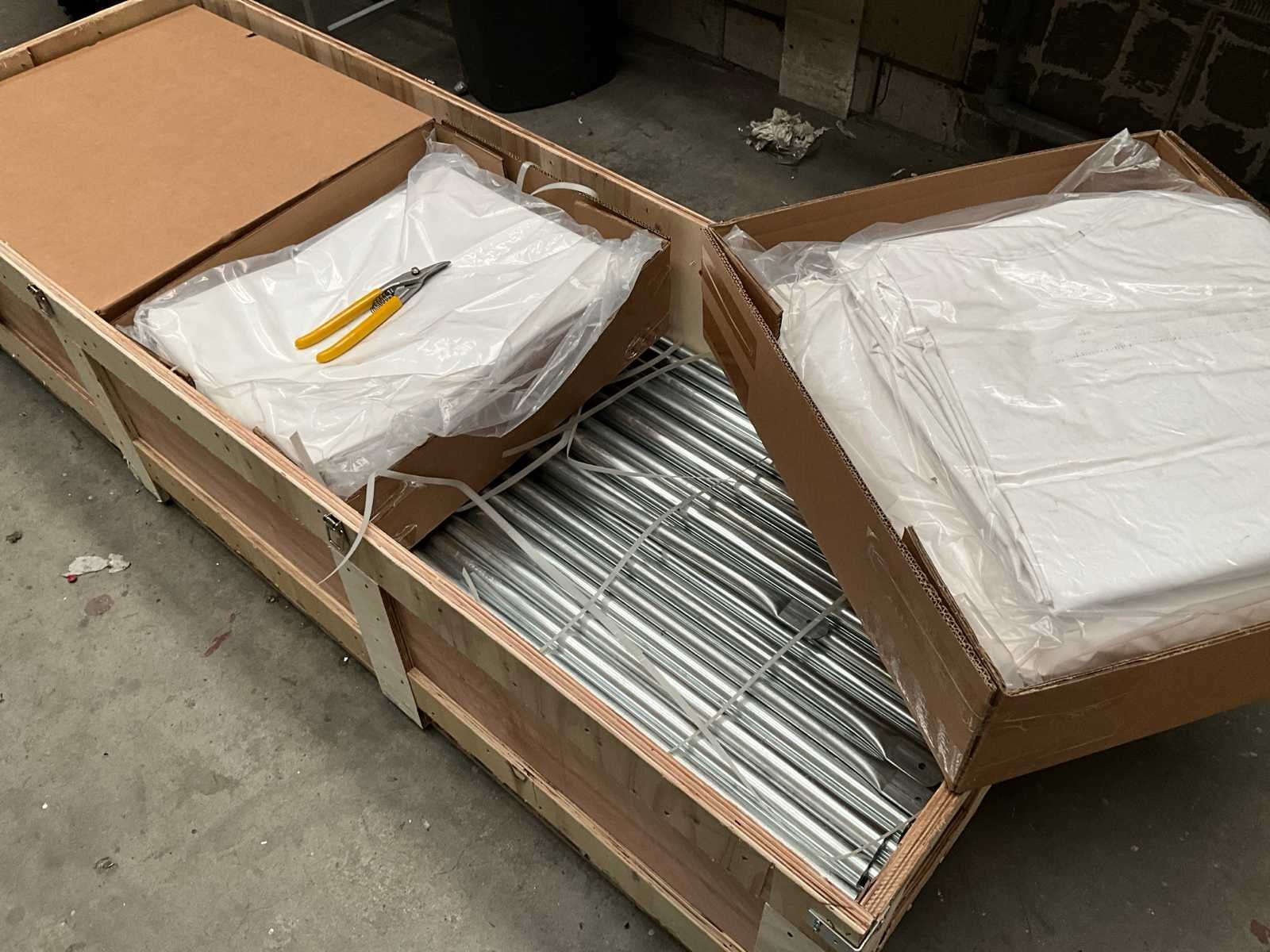 Professioneel gegalvaniseerd frame, 38mm x 1mm dik, gording 25 x 0.8 mm, 380 gram pvc zeil wit, ongebruikt in krat Model: 10x5x2.9 meter Kleur: wit Lengte: 1000cm Breedte: 500cm Hoogte: 290cm