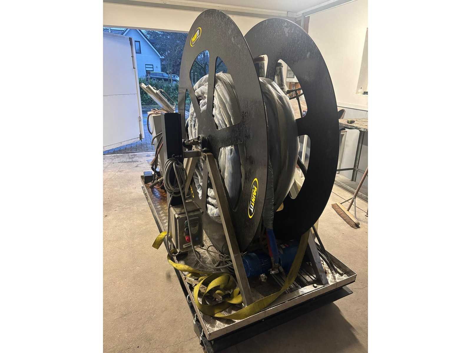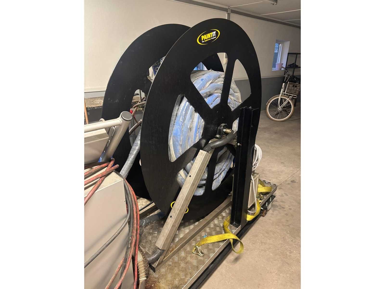 Complete Graco Reactor E-XP2 hotspray set voor polyurea toepassingen. Inclusief opvoerpompen, spuiten en een elektrisch bediende haspel. Het geheel is gemonteerd op een verrijdbaar frame. Merk: Graco Type: Reactor E-XP2 Hotspray set