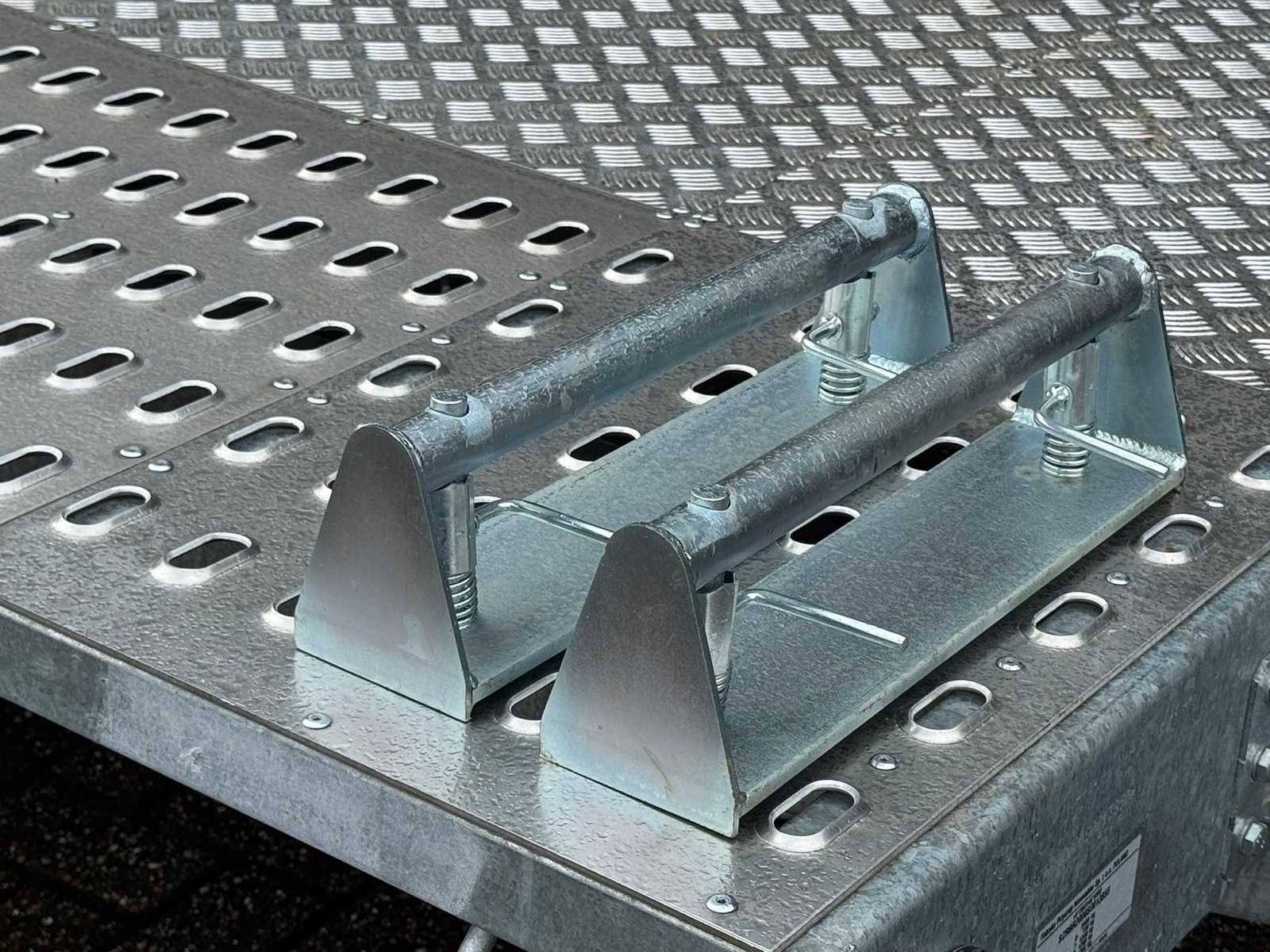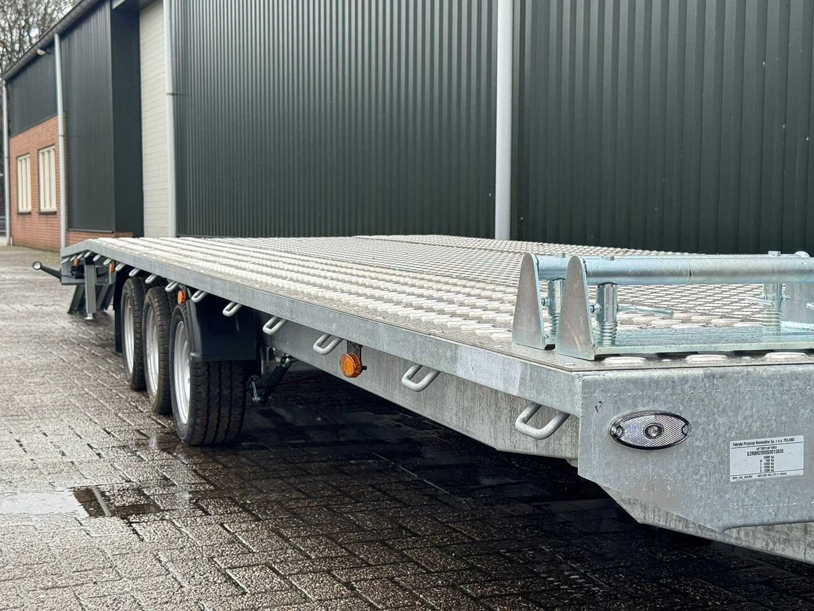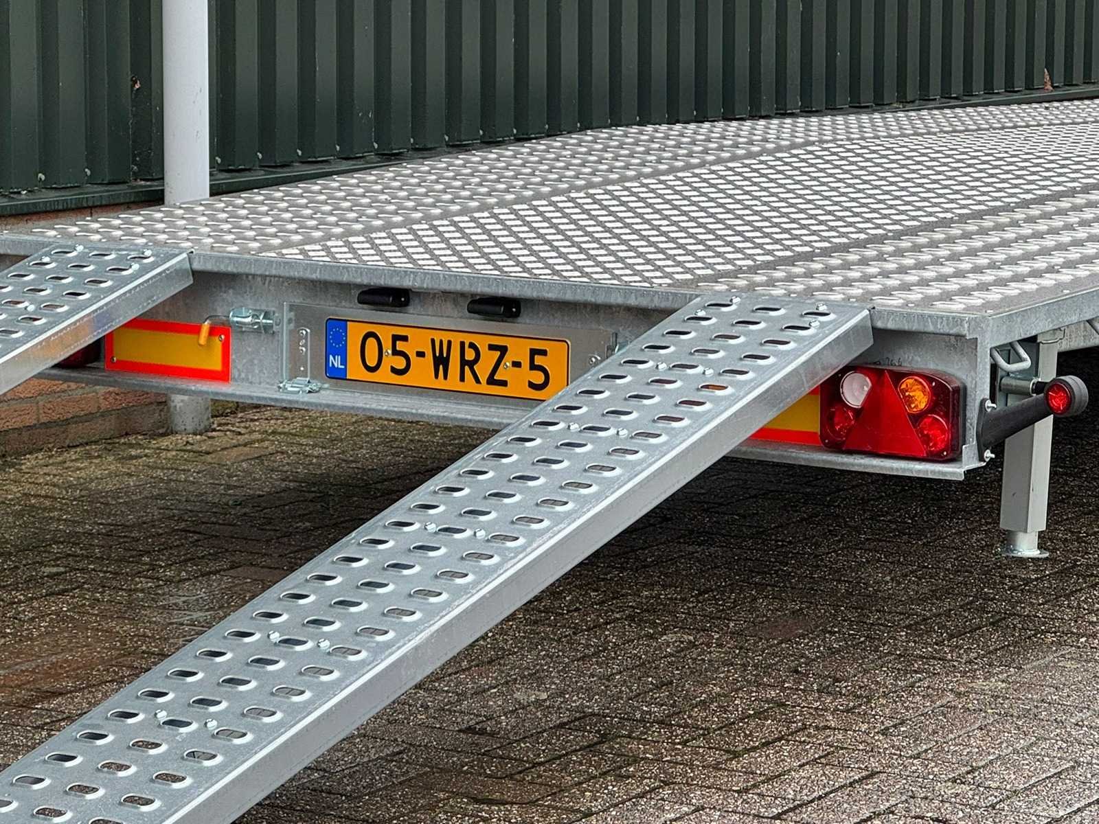Laadvloer lengte 808 cm Laadvloer breedte 210 cm Laadvloer hoogte 64 cm Oprijdhoogte 50 cm Totale lengte 955 cm Bruto gewicht 3500 kg Kogeldruk 150 kg Leeg gewicht 990 kg Netto laadvermogen 2660 kg Bandenmaat 195/50/13 inch uitgevoerd met: AL-KO assen, 3 x 1350 kg AL-KO wielkeggen AL-KO schokbrekers AL-KO V-dissel AL-KO koppeling Achteruitrijautomaat Veiligheidsindicator op koppeling Winterhoff neuswiel Reservewiel + montagebeugel op dissel Lier op liersteun Oprijplaten 2 meter in slede Volbad gegalvaniseerd chassis Aluminium Lohr gaten vloer Aluminium traanplaat in het midden Sjorogen aan zijkant van de laadvloer 13-polige stekker LED contourverlichting Heldere achterlichtunits Mistlampen Achteruitrijverlichting Merk: Niewiadow Type: Autotransporter Bouwjaar: 2026 Aantal assen: 3 Ledig gewicht: 990kg Laadvermogen: 2510kg Datum eerste toelating (NL): 17-02-2026 Kenteken: 05-WRZ-5 Nationaliteit documenten: NL