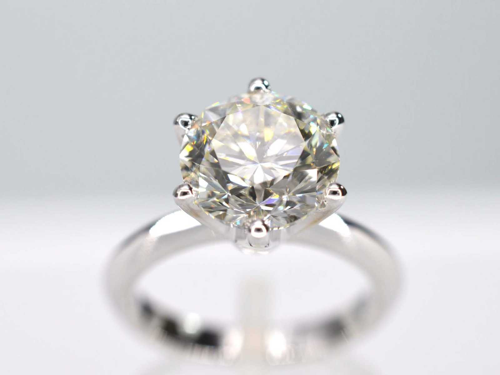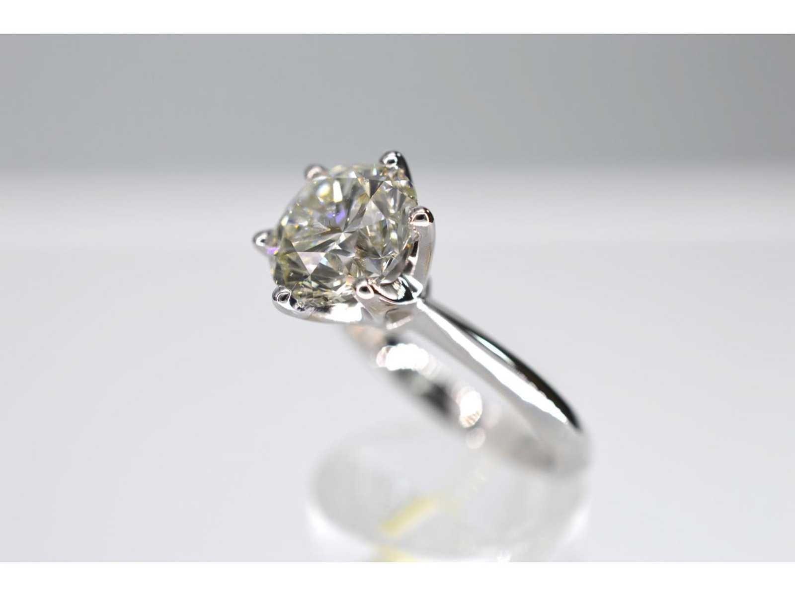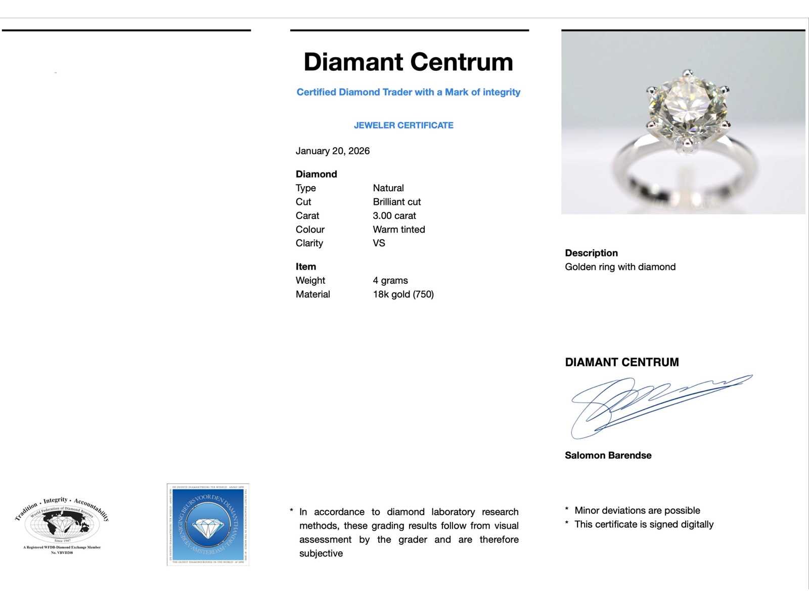 Samenvatting van gegevens Witgouden ring met een grote briljant geslepen diamant van 3.00 carat Diamant: Natuurlijk; Aantal: 1 stuk; Slijpvorm: Briljant geslepen; Gewicht (carat): 3.00 carat; Kleur: Warm getint; Zuiverheid: VS; Juweel: Ring; Gewicht: 4 gram; Ringmaat (op maat gemaakt*): 53 (17 mm); Materiaal: 18K goud (750); Conditie: Nieuw; Verpakking: Luxe sieradendoos; Toelichting: De kwaliteit is overgenomen van het rapport behorend bij item. De waardebepaling is een beoordeling van een gecertificeerde diamantair, gebaseerd op consumentenprijzen.; Consumentenprijs: € 45.938,- Within 14 days Materiaal: Goud Voornaamste diamant: Natuurlijk Gewicht diamant: 3.00ct Totaal gewicht: 4g Keurmerk: 750 Lage schatting: 36750€ Hoge schatting: 45938€ Kleur diamant: Warm getint Slijpvorm diamant: Briljant geslepen Zuiverheidsgraad diamant: VS