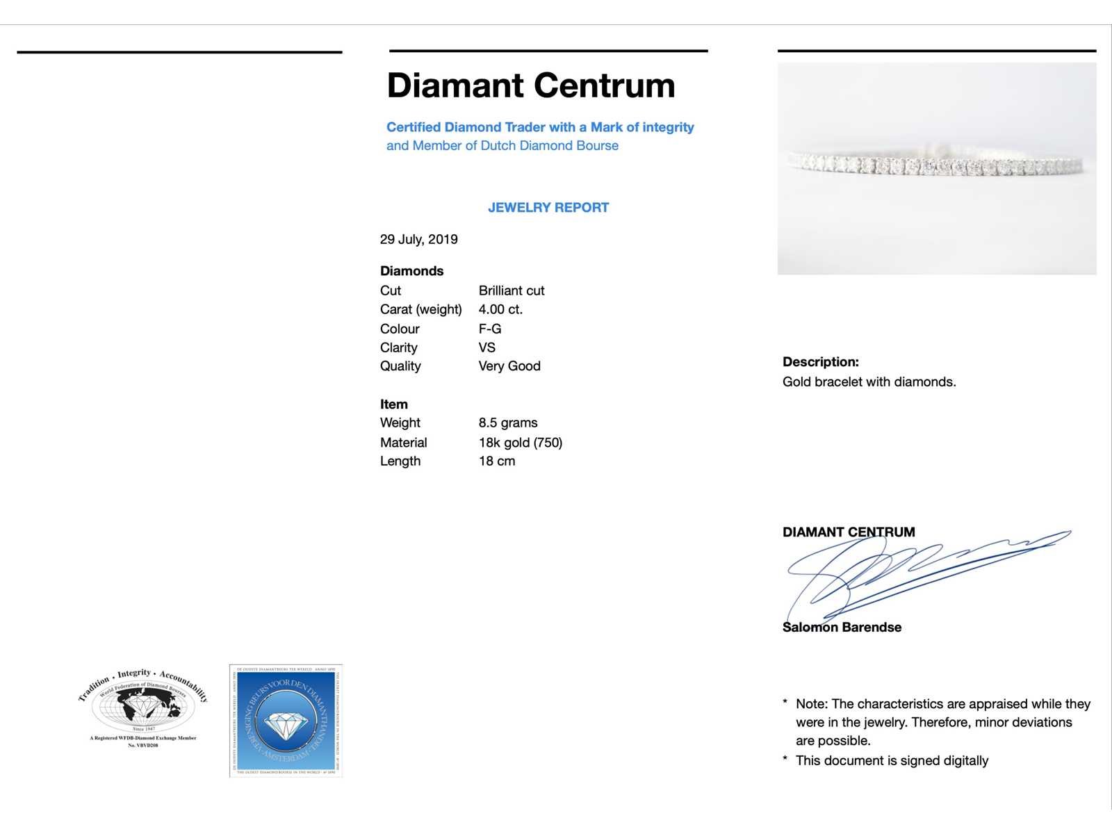 Samenvatting van gegevens Witgouden tennisarmband met 4.00 carat diamanten Diamant: Natuurlijk; Slijpvorm: Briljant geslepen; Gewicht (carat): 4.00 carat; Kleur: F-G; Zuiverheid: VS; Slijpkwaliteit: Excellent; Juweel: Armband; Gewicht: 8.5 gram; Afmetingen/lengte: 17-18 cm; Materiaal: 18K goud (750); Conditie: Nieuw; Verpakking: Luxe sieradendoos; Toelichting: De kwaliteit is overgenomen van het rapport behorend bij item. De waardebepaling is een beoordeling van een gecertificeerde diamantair, gebaseerd op consumentenprijzen.; Consumentenprijs: € 21.000,- Within 14 days Materiaal: Goud Voornaamste diamant: Natuurlijk Kleur diamant: F-G Gewicht diamant: 4.00ct Slijpvorm diamant: Briljant geslepen Slijpkwaliteit diamant: Excellent Zuiverheidsgraad diamant: VS Totaal gewicht: 8.5g Keurmerk: 750 Lage schatting: 16800€ Hoge schatting: 21000€