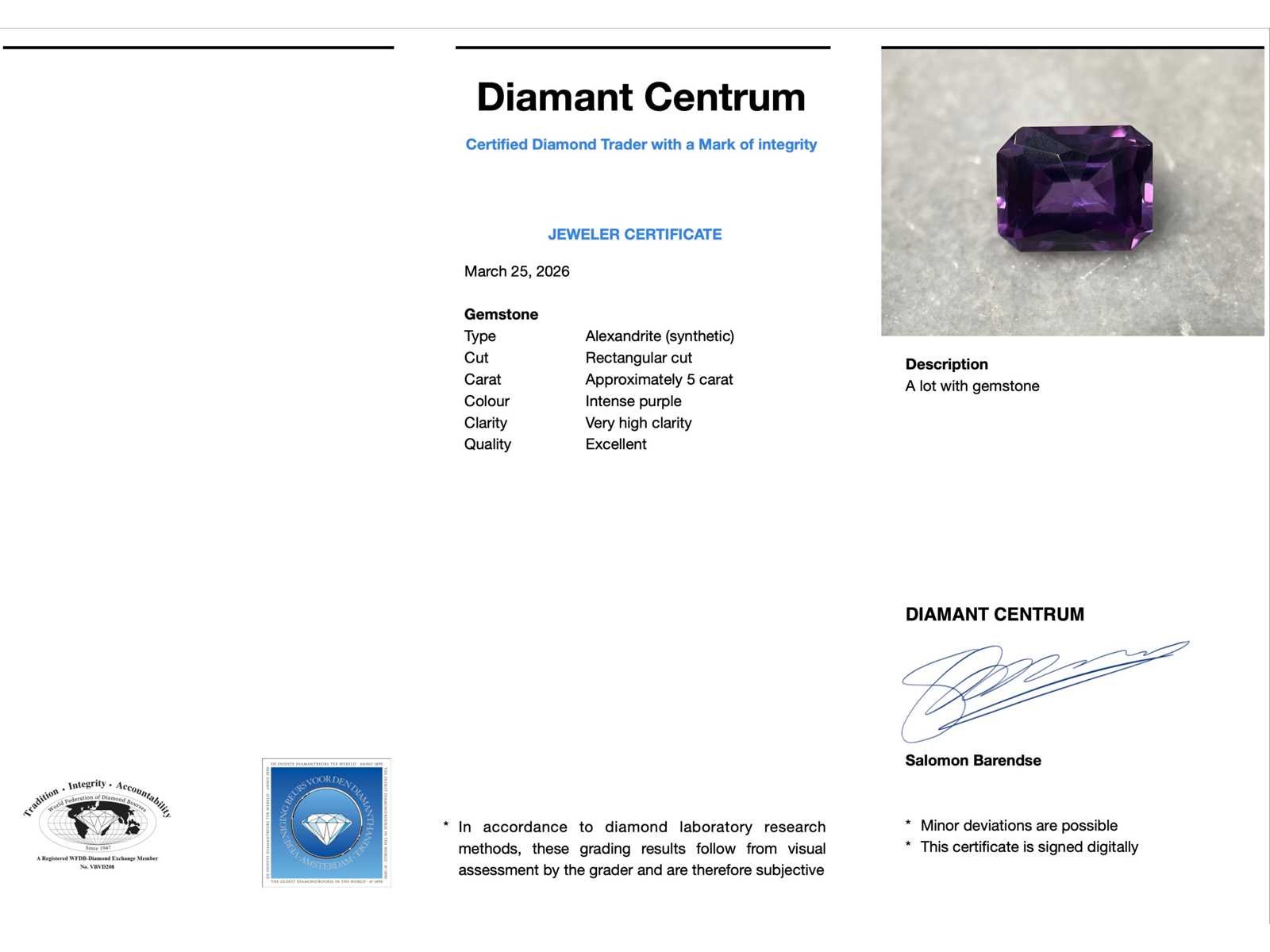 Samenvatting van gegevens Alexandriet - ca. 5 carat paarse alexandriet Edelsteen: Alexandriet (synthetisch); Aantal: 1 stuk; Slijpvorm: Langwerpig geslepen; Gewicht (carat): ca. 5 carat; Kleur: Intens paars; Zuiverheid: Zeer hoog zuiverheidsgraad; Slijpkwaliteit: Excellent; Conditie: Nieuw; Verpakking: Edelsteendoos; Toelichting: De kwaliteit is overgenomen van het rapport behorend bij item. De waardebepaling is een beoordeling van een gecertificeerde diamantair, gebaseerd op consumentenprijzen.; Consumentenprijs: € 1.180,- Within 14 days Edelsteen: Alexandriet (synthetisch) Kleur edelsteen: Intens paars Slijpvorm edelsteen: Langwerpig geslepen Slijpkwaliteit edelsteen: Excellent Zuiverheidsgraad edelsteen: Zeer hoog zuiverheidsgraad Lage schatting: 944€ Hoge schatting: 1180€