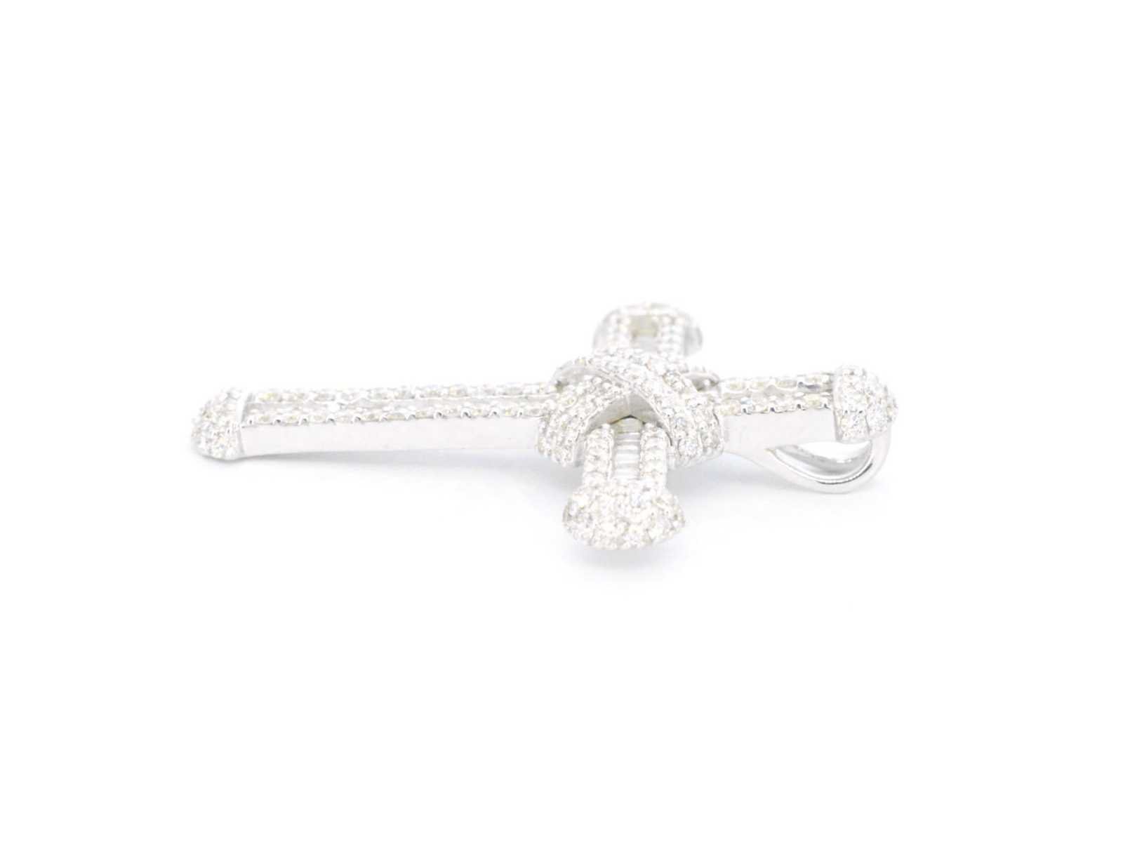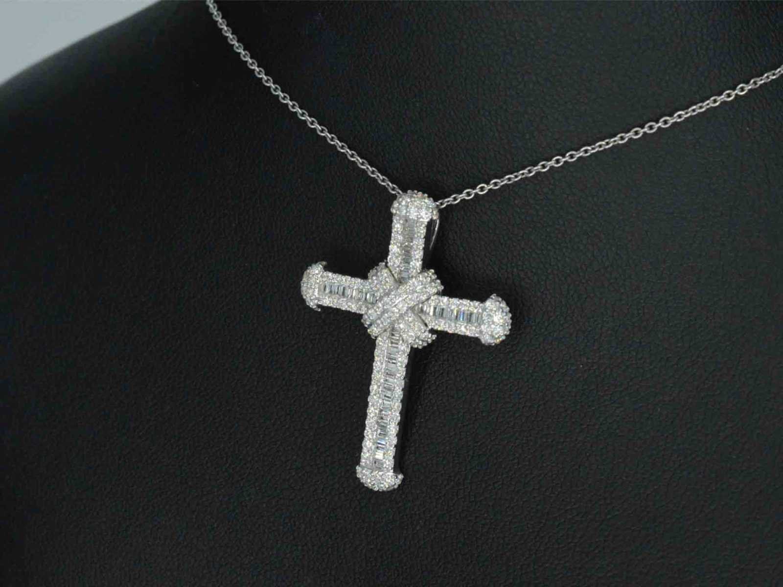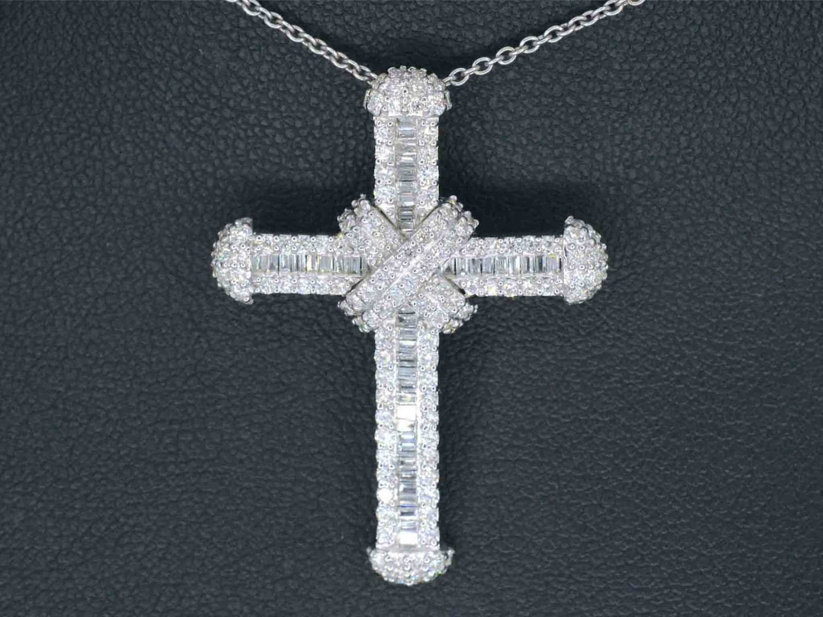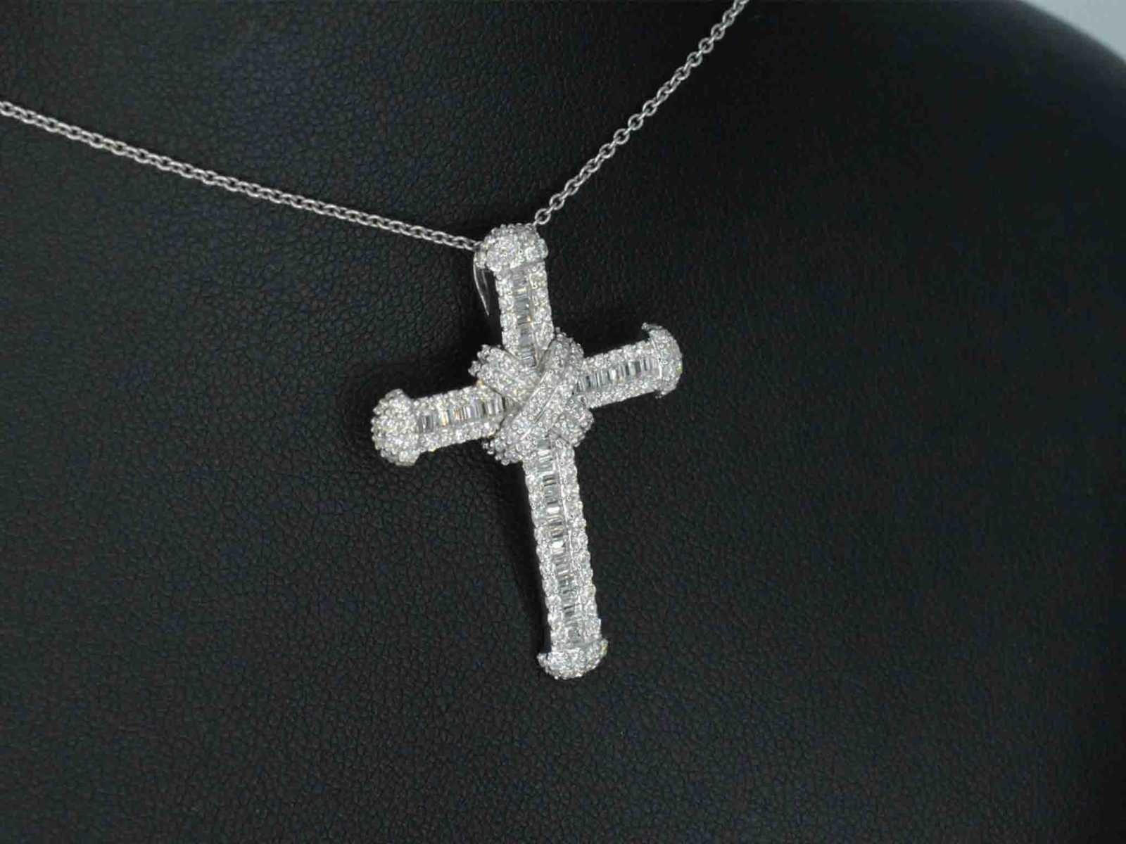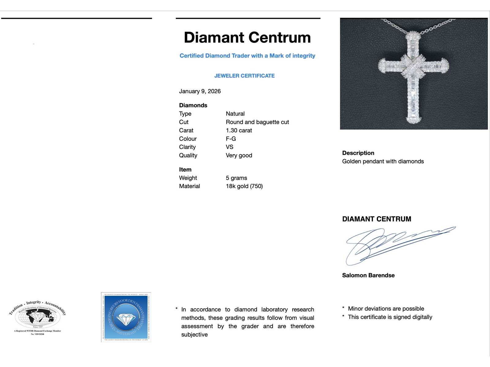 Samenvatting van gegevens Witgouden kruishanger met diamanten Diamant: Natuurlijk; Aantal: 181 stuks; Slijpvorm: Round en baguette geslepen; Gewicht (carat): 1.30 carat; Kleur: F-G; Zuiverheid: VS; Slijpkwaliteit: Zeer mooi; Juweel: Hanger (excl. ketting); Gewicht: 5 gram; Afmetingen/lengte: 3.3 cm; Materiaal: 18k karaat (750); Conditie: Nieuw; Verpakking: Luxe sieradendoos; Toelichting: De kwaliteit is overgenomen van het rapport behorend bij item. De waardebepaling is een beoordeling van een gecertificeerde diamantair, gebaseerd op consumentenprijzen.; Consumentenprijs: € 8.540,- Within 14 days Voornaamste diamant: Natuurlijk Kleur diamant: F-G Gewicht diamant: 1.30ct Slijpvorm diamant: Round en baguette geslepen Slijpkwaliteit diamant: Zeer mooi Zuiverheidsgraad diamant: VS Totaal gewicht: 5g Keurmerk: 750 Lage schatting: 6832€ Hoge schatting: 8540€