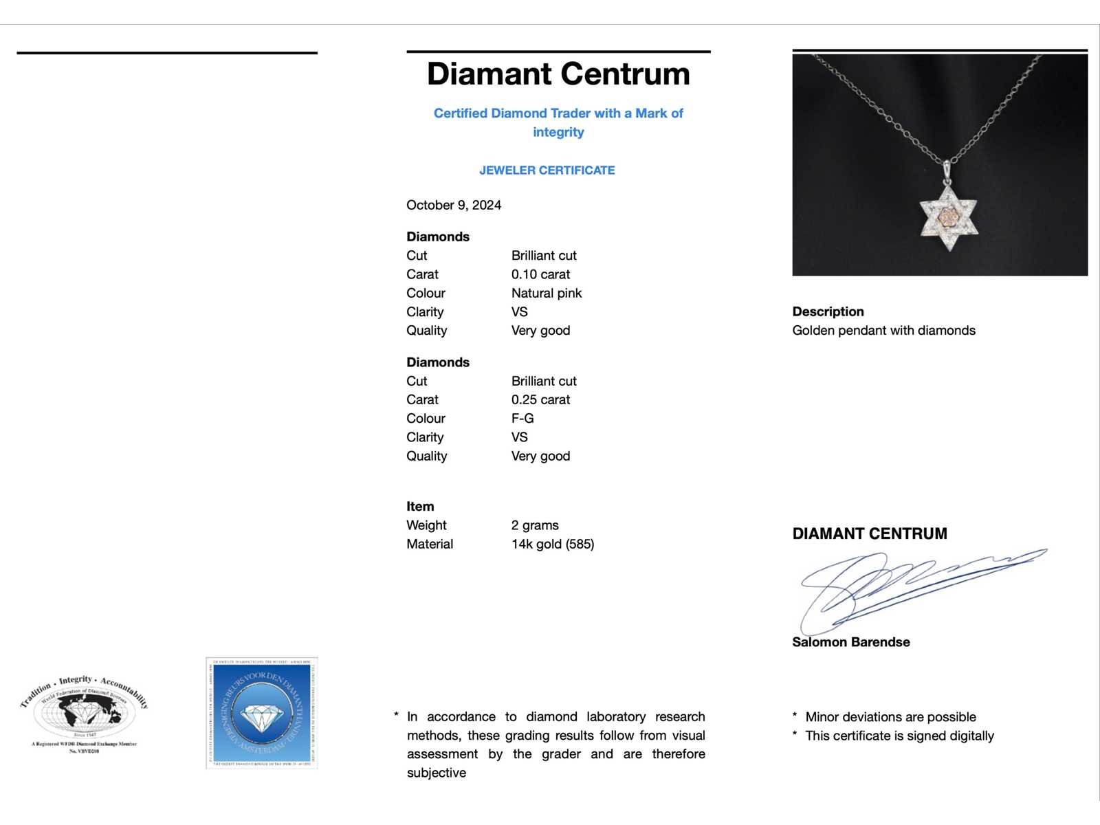 Samenvatting van gegevens Davidster hanger met natuurlijke roze en witte diamanten van hoge kwaliteit Diamant: Natuurlijk; Aantal: 7 stuks; Slijpvorm: Briljant geslepen; Gewicht (carat): 0.10 carat; Kleur: Natuurlijke roze; Zuiverheid: VS; Slijpkwaliteit: Zeer mooi; Diamant (secundair): Natuurlijk; Aantal diamanten: 54 stuks; Slijpvorm: Briljant geslepen; Gewicht (carat): 0.25 carat; Kleur: F-G; Zuiverheid: VS; Slijpkwaliteit: Very good; Juweel: Hanger (excl. ketting); Gewicht: 2 gram; Afmetingen/lengte: 2.1 x 1.5 cm; Materiaal: 14 karaat (585); Conditie: Nieuw; Verpakking: Luxe sieradendoos; Toelichting: De kwaliteit is overgenomen van het rapport behorend bij item. De waardebepaling is een beoordeling van een gecertificeerde diamantair, gebaseerd op consumentenprijzen.; Consumentenprijs: € 2.450,- Within 14 days Voornaamste diamant: Natuurlijk Kleur diamant: Natuurlijke roze Gewicht diamant: 0.10ct Slijpvorm diamant: Briljant geslepen Slijpkwaliteit diamant: Zeer mooi Zuiverheidsgraad diamant: VS Totaal gewicht: 2g Keurmerk: 585 Lage schatting: 1960€ Hoge schatting: 2450€
