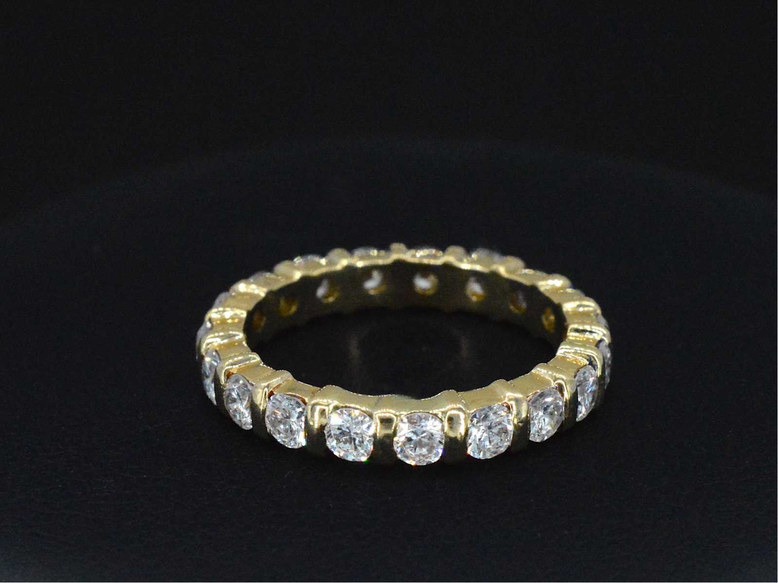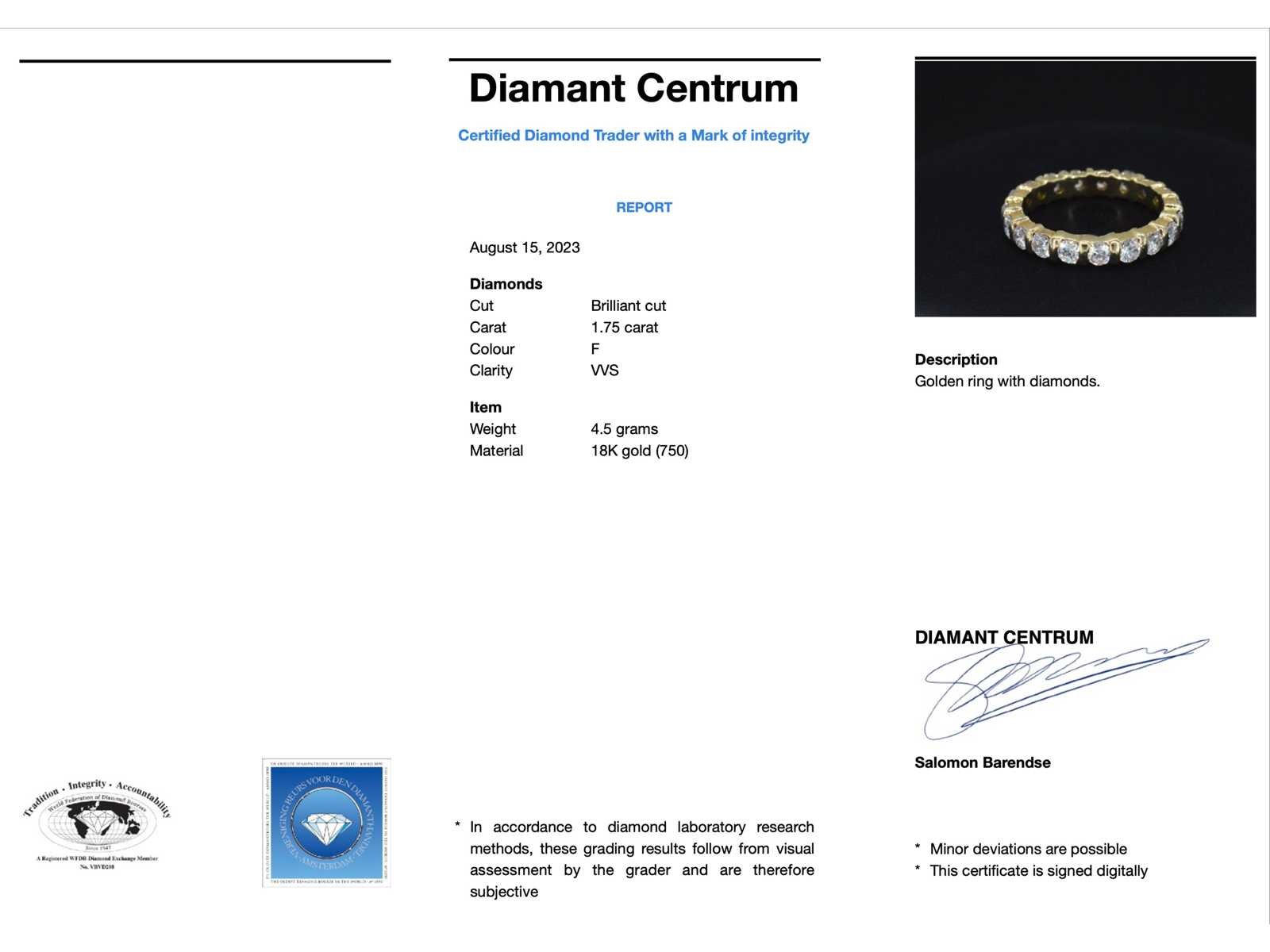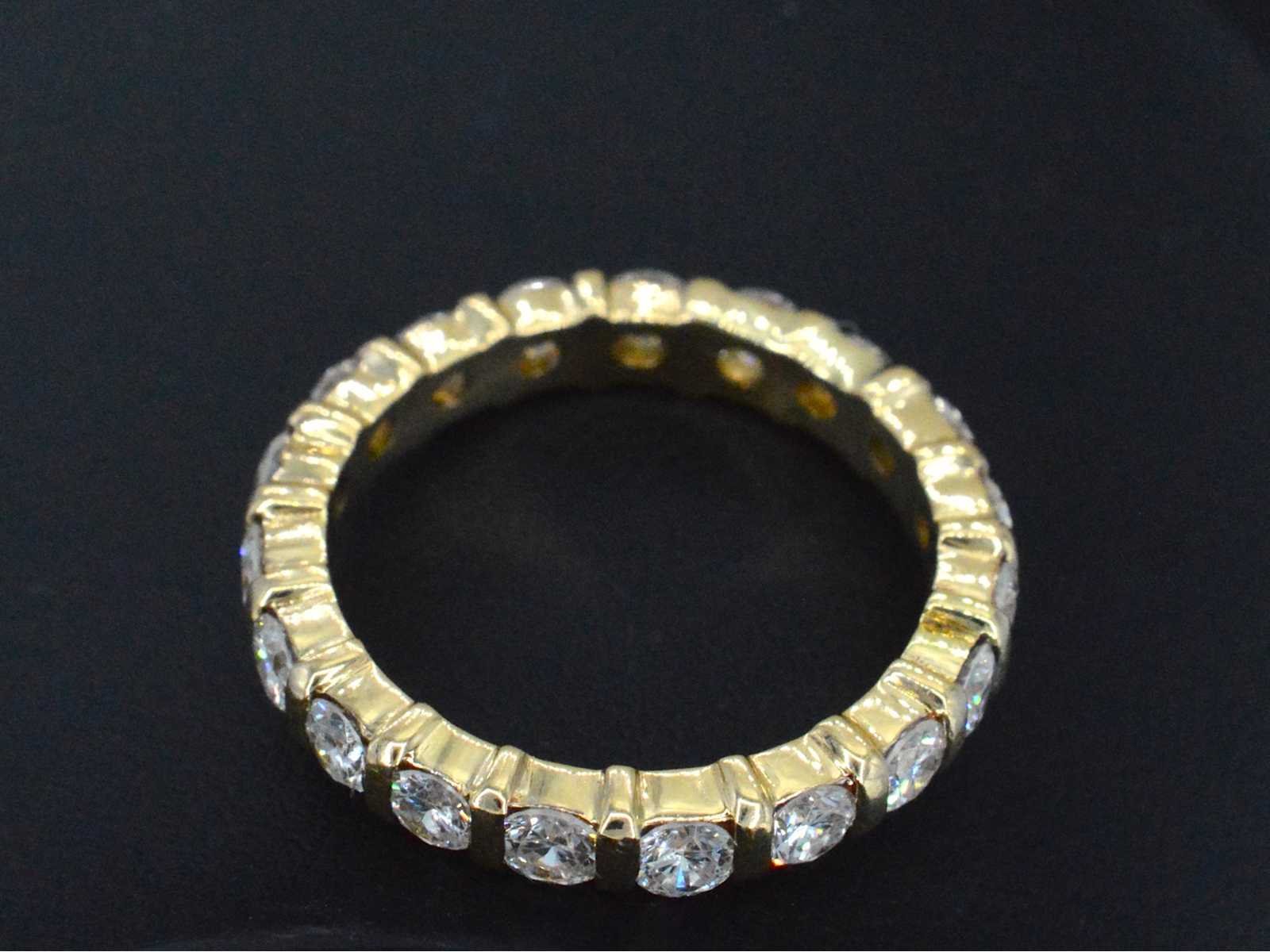Samenvatting van gegevens Gouden alliance ring met diamanten Diamant: Natuurlijk; Aantal: 19 stuks; Slijpvorm: Briljant geslepen; Gewicht (carat): 1.75 carat; Kleur: F; Zuiverheid: VVS; Juweel: Ring; Gewicht: 4.5 gram; Ringmaat (op maat gemaakt*): 54 (17.25 mm); Materiaal: 18k goud (750); Conditie: vintage; Verpakking: Luxe sieradendoos; Toelichting: De kwaliteit is overgenomen van het rapport behorend bij item. De waardebepaling is een beoordeling van een gecertificeerde diamantair, gebaseerd op consumentenprijzen.; Consumentenprijs: € 11.550,- Within 14 days Materiaal: Goud Voornaamste diamant: Natuurlijk Gewicht diamant: 1.75ct Totaal gewicht: 4.5g Keurmerk: 750 Lage schatting: 9240€ Hoge schatting: 11550€ Kleur diamant: F Slijpvorm diamant: Briljant geslepen Zuiverheidsgraad diamant: VVS