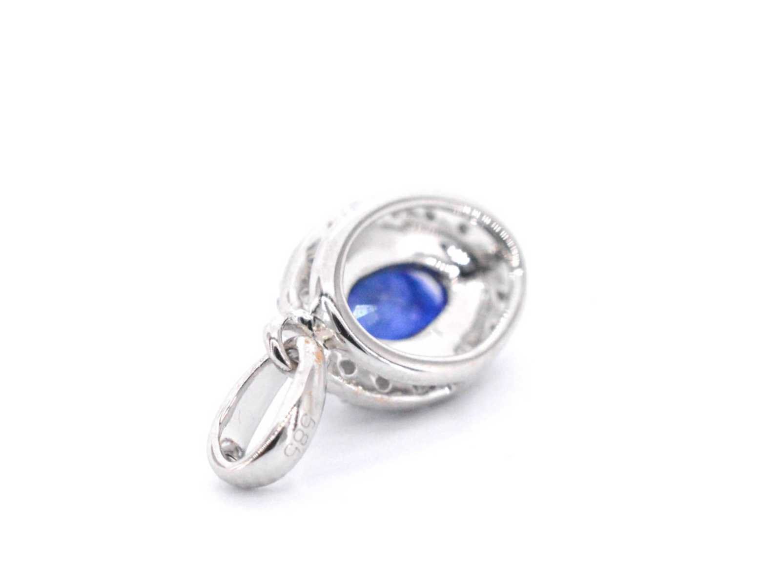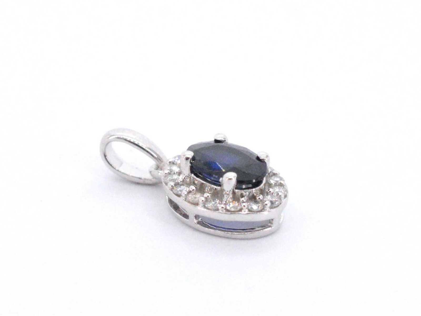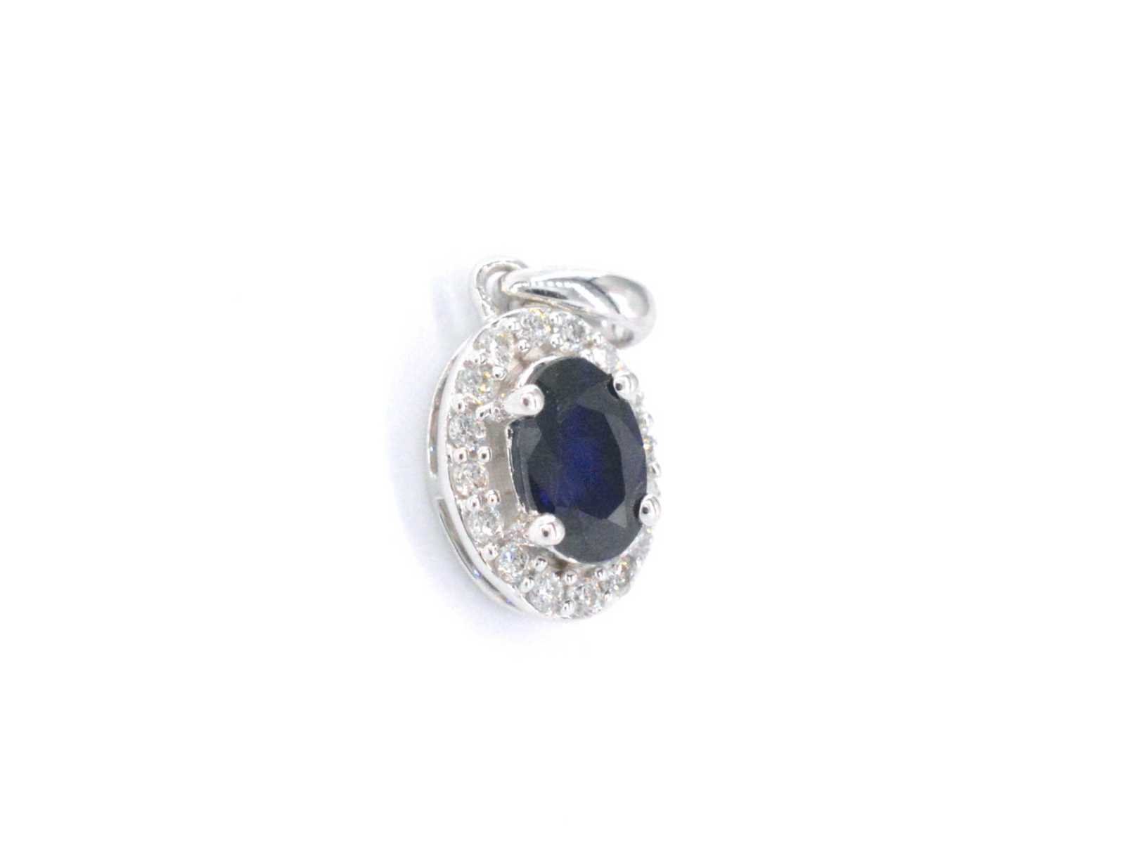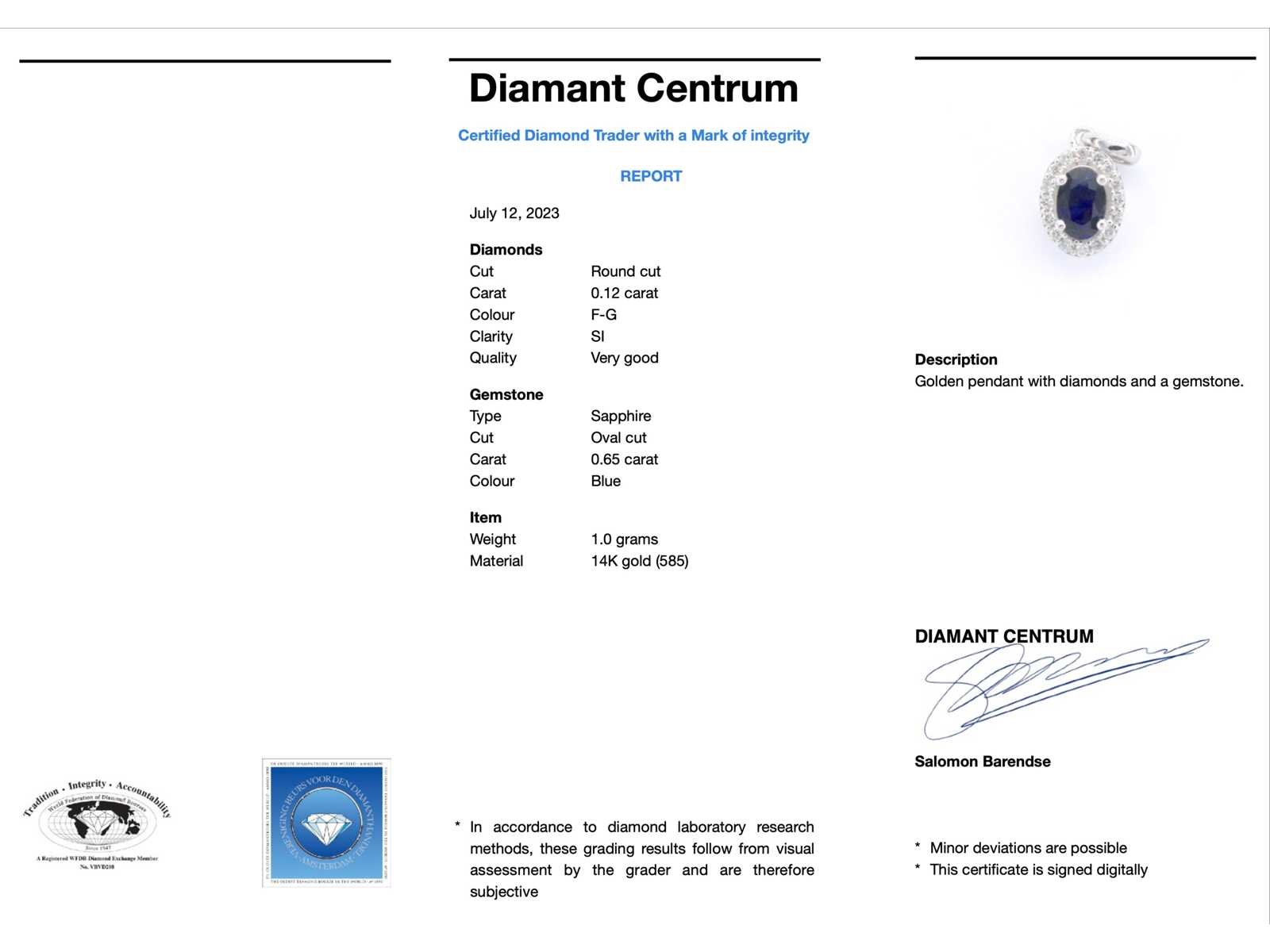Samenvatting van gegevens Witgouden entourage hanger met diamanten en saffier Diamant: Natuurlijk; Slijpvorm: Briljant geslepen; Gewicht (carat): 0.12 carat; Kleur: F-G; Zuiverheid: SI; Slijpkwaliteit: Zeer mooi; Edelsteen: Saffier; Slijpvorm: Ovaal; Gewicht (carat): 0.65 carat; Juweel: Hanger (excl. ketting); Gewicht: 1 gram; Afmetingen/lengte: 15 x 7 mm; Materiaal: 14k goud (585); Conditie: Nieuw; Verpakking: Luxe sieradendoos; Toelichting: De kwaliteit is overgenomen van het rapport behorend bij item. De waardebepaling is een beoordeling van een gecertificeerde diamantair, gebaseerd op consumentenprijzen.; Consumentenprijs: € 1.015,- Within 14 days Materiaal: Goud Voornaamste diamant: Natuurlijk Kleur diamant: F-G Gewicht diamant: 0.12ct Slijpvorm diamant: Briljant geslepen Slijpkwaliteit diamant: Zeer mooi Zuiverheidsgraad diamant: SI Edelsteen: Saffier Slijpvorm edelsteen: Ovaal Totaal gewicht: 1g Keurmerk: 585 Lage schatting: 812€ Hoge schatting: 1015€