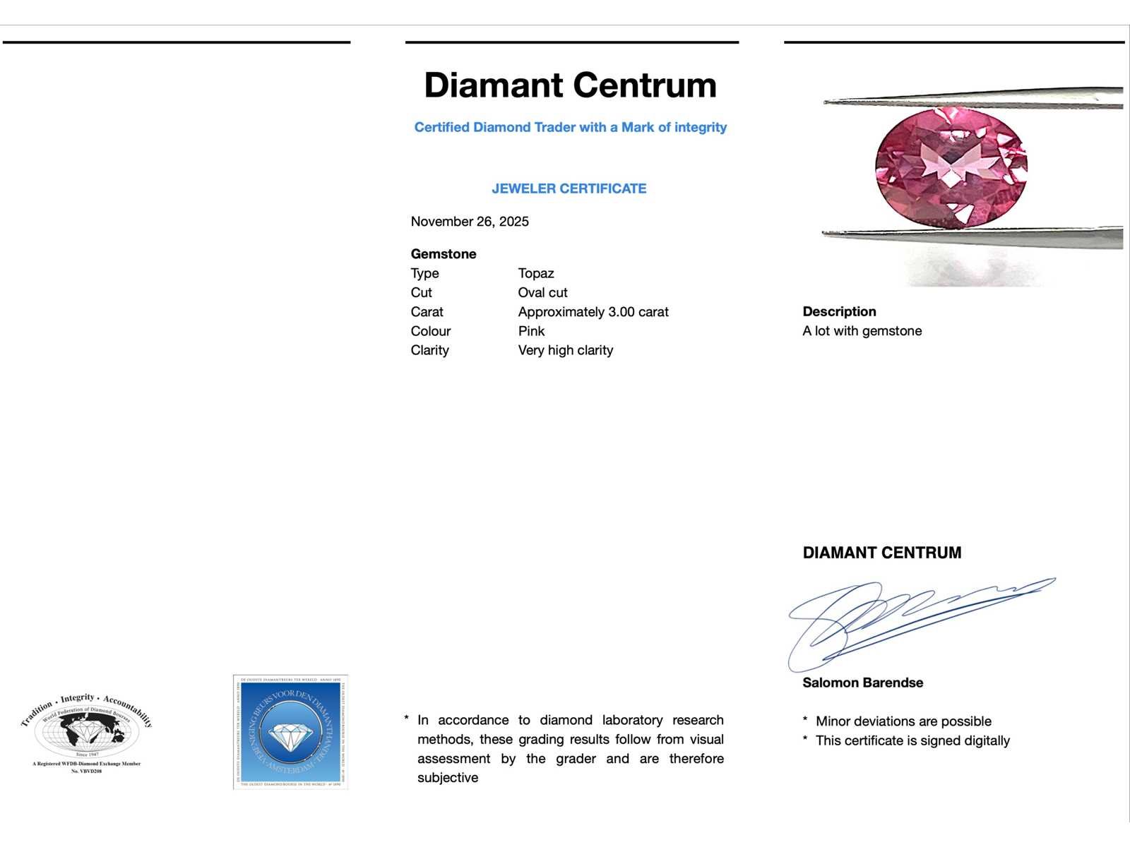 Samenvatting van gegevens Topaas - circa 3.00 carat pink topaas Edelsteen: Topaas; Aantal: 1 stuk; Slijpvorm: Ovaal geslepen; Gewicht (carat): circa 3.00 carat; Kleur: Roze; Zuiverheid: Zeer hoge zuiverheidsgraad; Conditie: Nieuw; Verpakking: Edelsteendoos; Toelichting: De waardebepaling is een beoordeling van een gecertificeerde diamantair, gebaseerd op consumentenprijzen.; Consumentenprijs: € 350,- Within 14 days Edelsteen: Topaas Kleur edelsteen: Roze Slijpvorm edelsteen: Ovaal geslepen Zuiverheidsgraad edelsteen: Zeer hoge zuiverheidsgraad Lage schatting: 280€ Hoge schatting: 350€