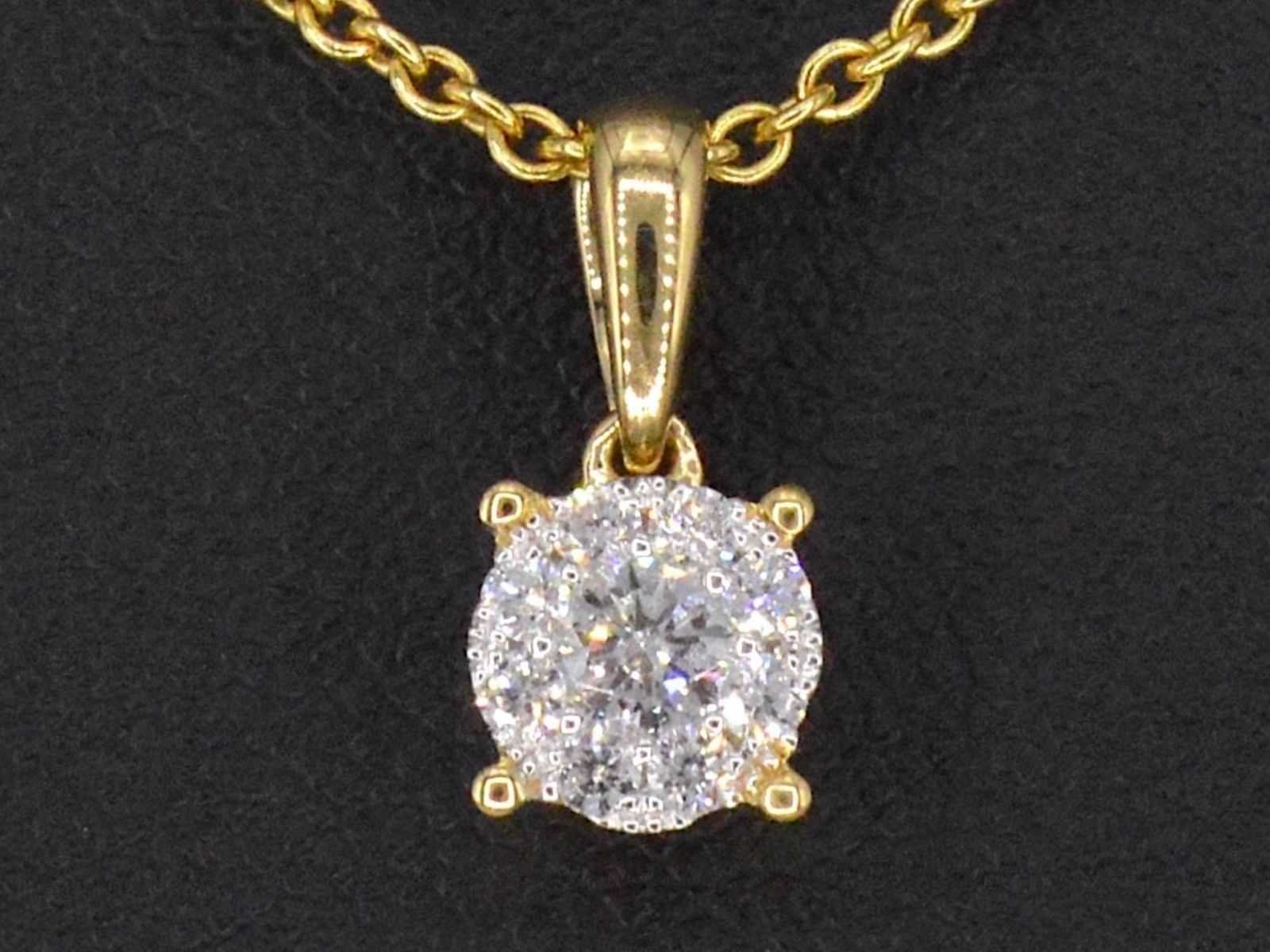 Samenvatting van gegevens Gouden entourage hanger met briljant geslepen diamanten Diamant: Natuurlijk; Slijpvorm: Briljant geslepen; Gewicht (carat): 0.40 carat; Kleur: F-G; Zuiverheid: VS; Slijpkwaliteit: Zeer mooi; Juweel: Hanger (excl. ketting); Gewicht: 0.7 gram; Materiaal: 18K goud (750); Conditie: Nieuw; Verpakking: Luxe sieradendoos; Toelichting: De kwaliteit is overgenomen van het rapport behorend bij item. De waardebepaling is een beoordeling van een gecertificeerde diamantair, gebaseerd op consumentenprijzen.; Consumentenprijs: € 3.098,- Within 14 days Materiaal: Goud Voornaamste diamant: Natuurlijk Kleur diamant: F-G Gewicht diamant: 0.40ct Slijpvorm diamant: Briljant geslepen Slijpkwaliteit diamant: Zeer mooi Zuiverheidsgraad diamant: VS Totaal gewicht: 0.7g Keurmerk: 750 Lage schatting: 2478€ Hoge schatting: 3098€