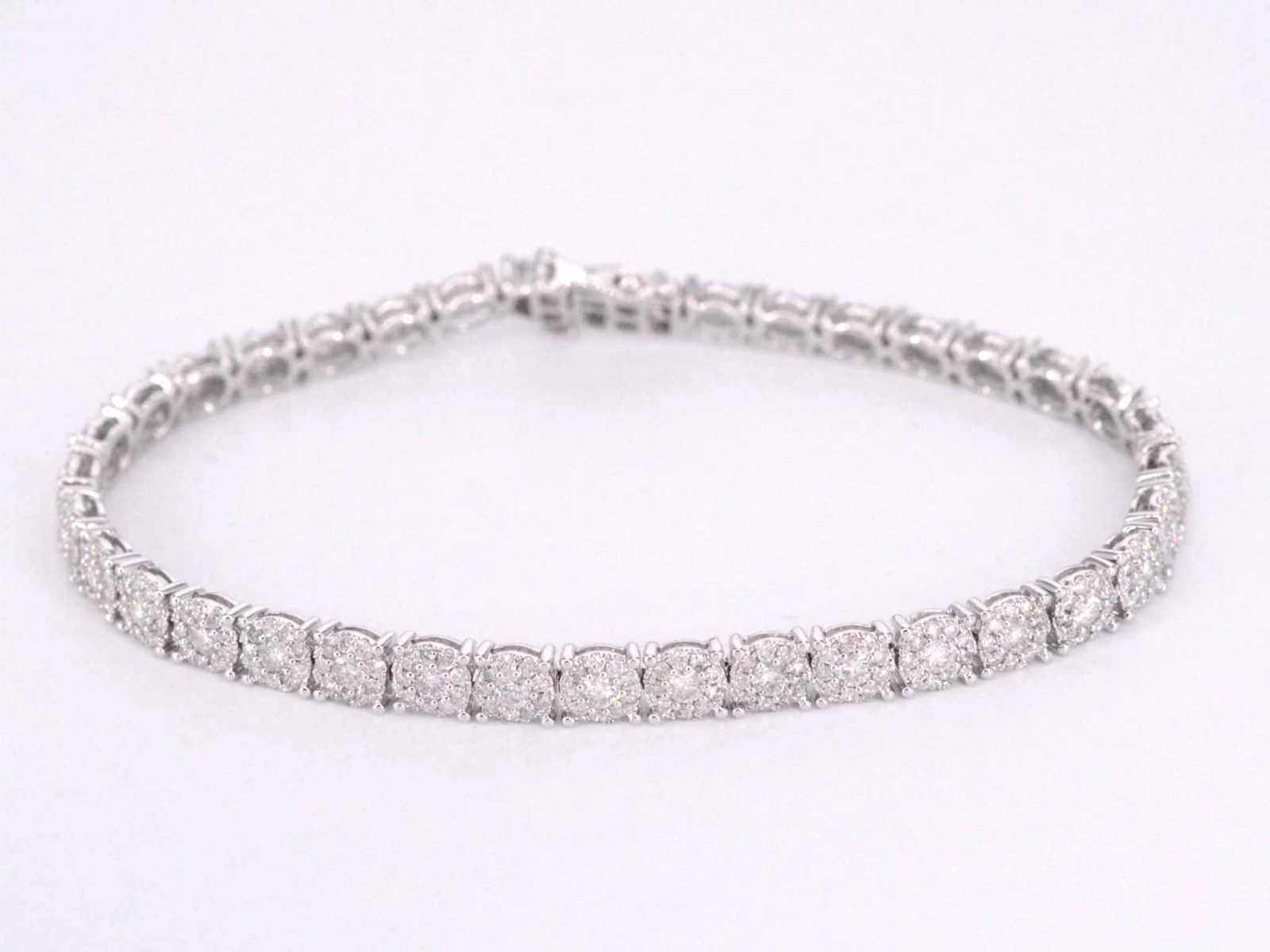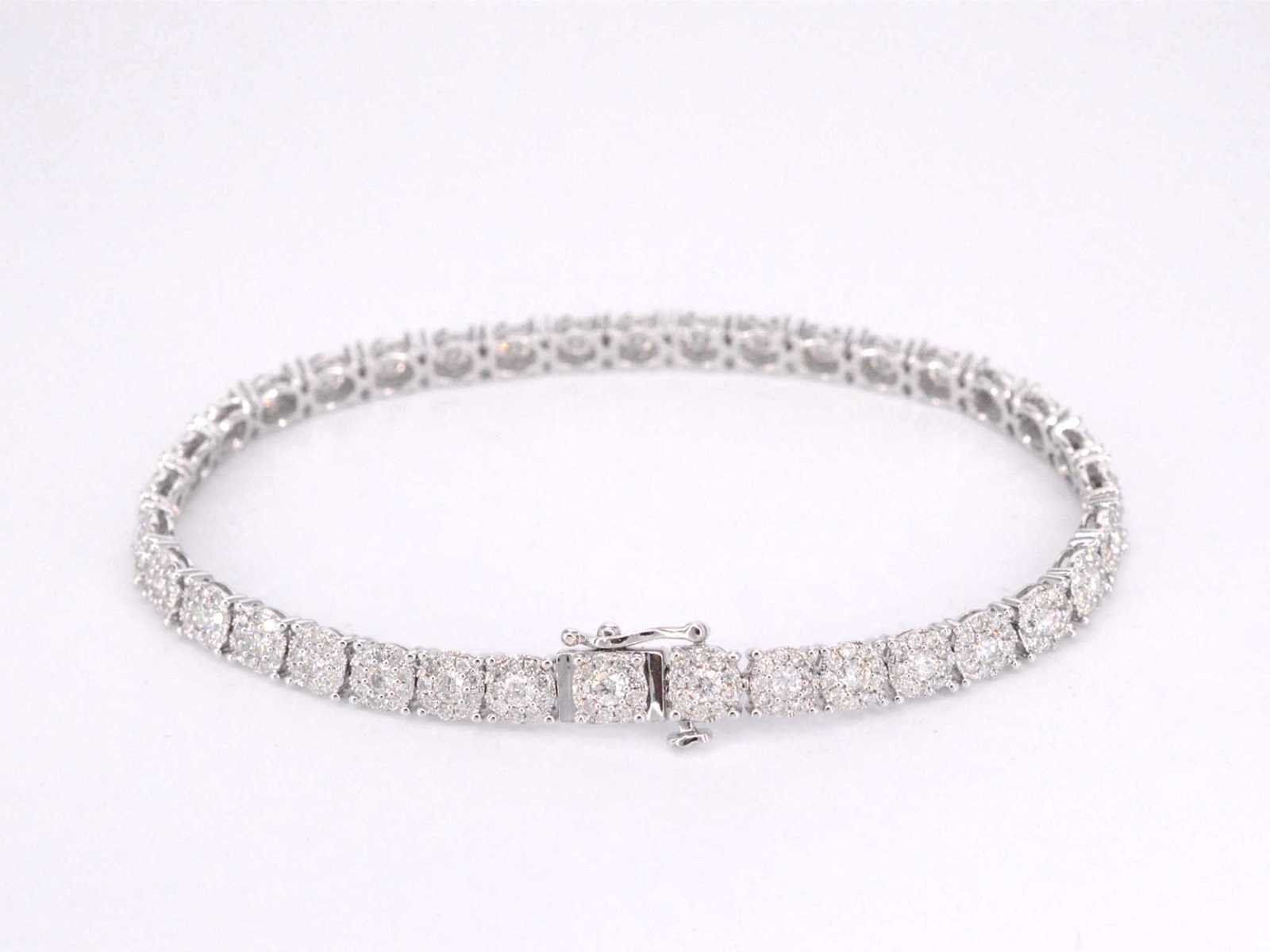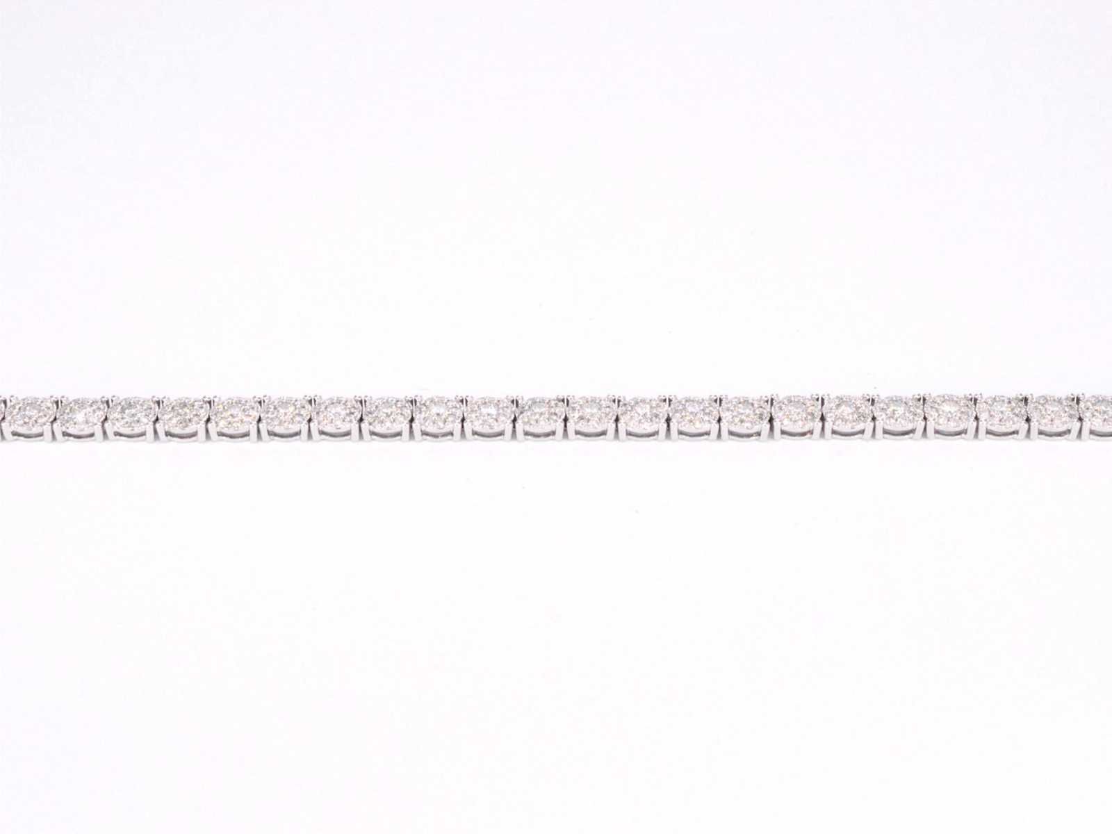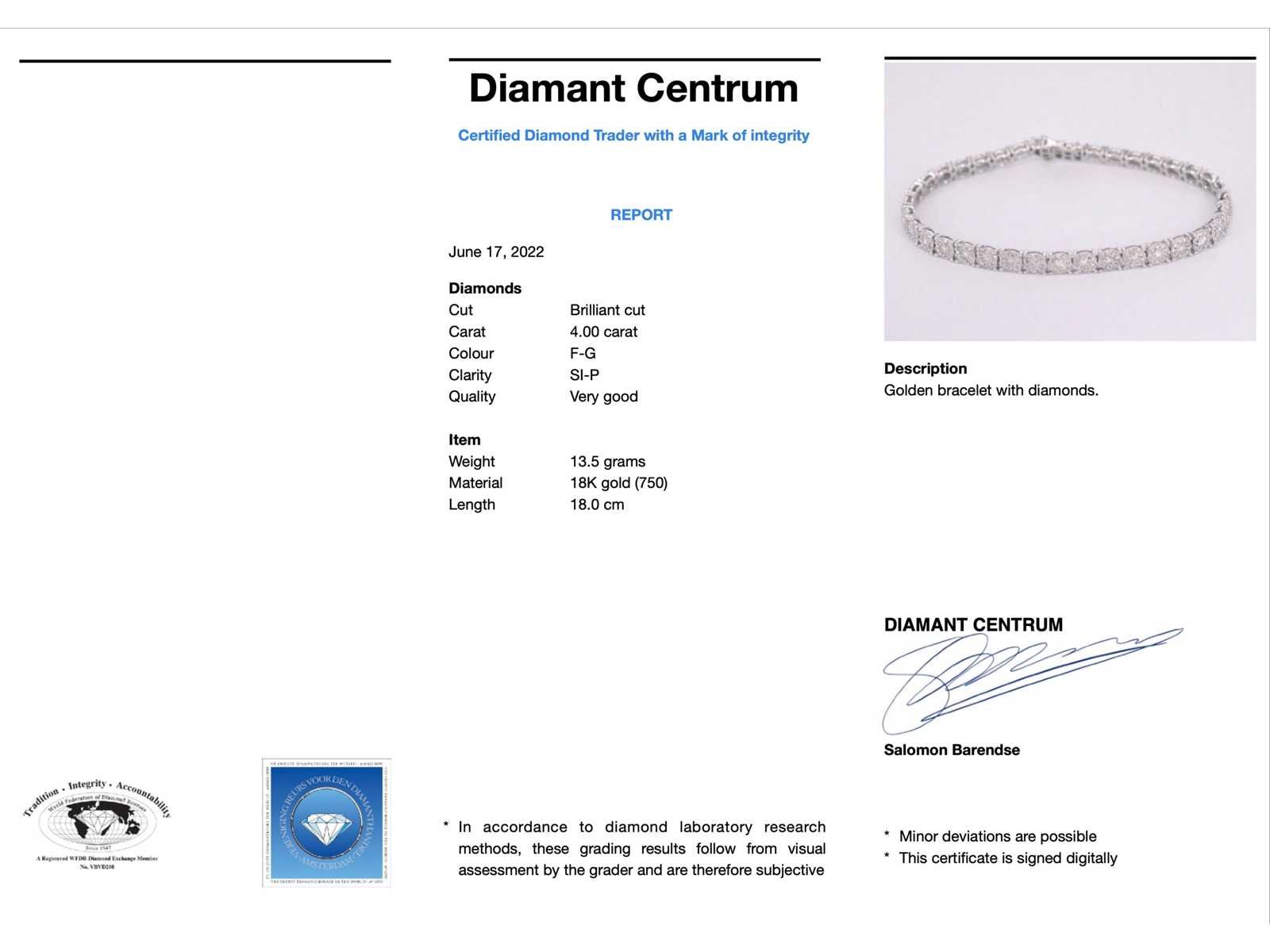 Samenvatting van gegevens Witgouden tennisarmband met diamanten 4.00 carat Diamant: Natuurlijk; Slijpvorm: Briljant geslepen; Gewicht (carat): 4.00 carat; Kleur: F-G; Zuiverheid: SI-P; Slijpkwaliteit: Zeer mooi; Juweel: Armband; Gewicht: 13.5 gram; Afmetingen/lengte: 18 cm; Materiaal: 18K goud (750); Conditie: Nieuw; Verpakking: Luxe sieradendoos; Toelichting: De kwaliteit is overgenomen van het rapport behorend bij item. De waardebepaling is een beoordeling van een gecertificeerde diamantair, gebaseerd op consumentenprijzen.; Consumentenprijs: € 19.180,- Within 14 days Materiaal: Goud Voornaamste diamant: Natuurlijk Kleur diamant: F-G Gewicht diamant: 4.00ct Slijpvorm diamant: Briljant geslepen Slijpkwaliteit diamant: Zeer mooi Zuiverheidsgraad diamant: SI-P Totaal gewicht: 13.5g Keurmerk: 750 Lage schatting: 15344€ Hoge schatting: 19180€