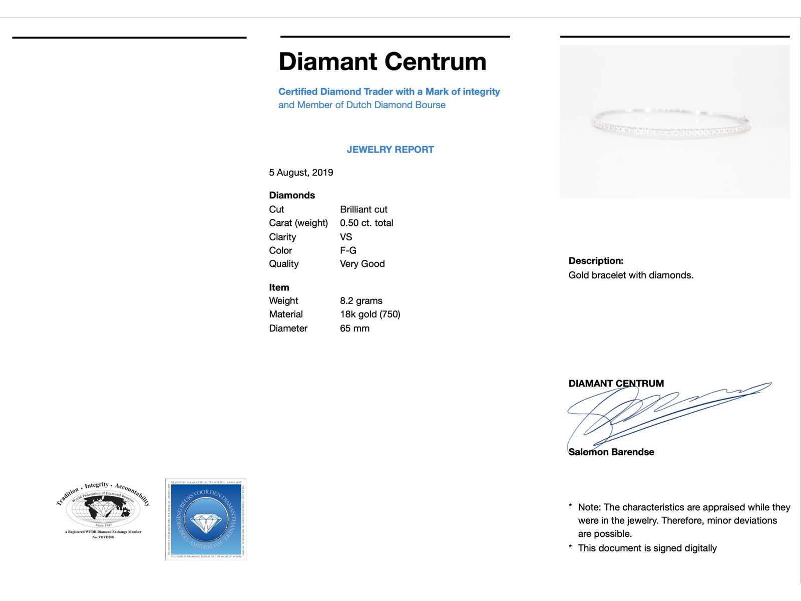 Samenvatting van gegevens Witgouden armband met diamanten Aantal: 33 stuks; Slijpvorm: Briljant geslepen; Gewicht (carat): 0.50 carat; Kleur: F-G; Zuiverheid: VS; Slijpkwaliteit: Zeer mooi; Juweel: Armband; Gewicht: 8.2 gram; Afmetingen/lengte: Diameter: 60 mm; Materiaal: 18K goud (750) witgoud; Conditie: Nieuw; Verpakking: Luxe sieradendoos; Toelichting: De kwaliteit is overgenomen van het rapport behorend bij item. De waardebepaling is een beoordeling van een gecertificeerde diamantair, gebaseerd op consumentenprijzen.; Consumentenprijs: € 10.903,- Within 14 days Materiaal: Goud Kleur diamant: F-G Gewicht diamant: 0.50ct Slijpvorm diamant: Briljant geslepen Slijpkwaliteit diamant: Zeer mooi Zuiverheidsgraad diamant: VS Totaal gewicht: 8.2g Keurmerk: 750 Lage schatting: 8722€ Hoge schatting: 10903€