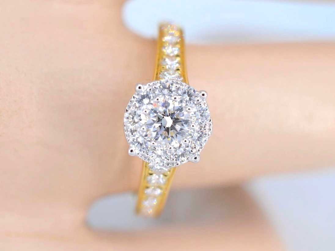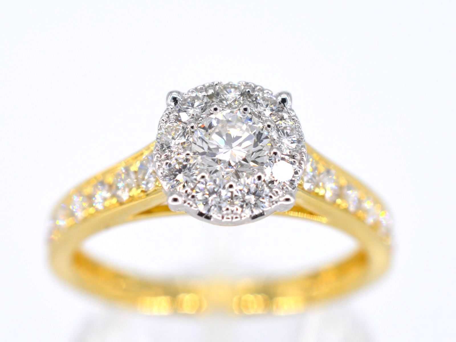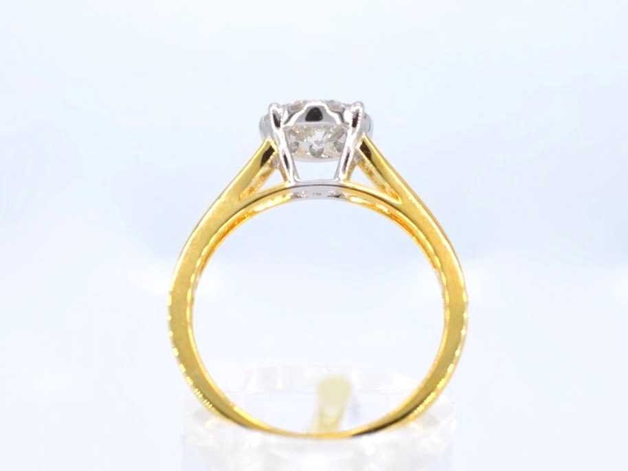 Samenvatting van gegevens Gouden entourage ring met briljant geslepen diamanten van 1.00 carat Diamant: Natuurlijk; Slijpvorm: Briljant geslepen; Gewicht (carat): 1.00 carat; Kleur: F-G; Zuiverheid: VS; Slijpkwaliteit: Zeer mooi; Juweel: Ring; Gewicht: 3.1 gram; Ringmaat (op maat gemaakt*): 53 (17 mm); Materiaal: 18K goud (750); Conditie: Nieuw; Verpakking: Luxe sieradendoos; Toelichting: De kwaliteit is overgenomen van het rapport behorend bij item. De waardebepaling is een beoordeling van een gecertificeerde diamantair, gebaseerd op consumentenprijzen.; Consumentenprijs: € 6.965,- Within 14 days Materiaal: Goud Voornaamste diamant: Natuurlijk Gewicht diamant: 1.00ct Totaal gewicht: 3.1g Keurmerk: 750 Lage schatting: 5572€ Hoge schatting: 6965€ Kleur diamant: F-G Slijpvorm diamant: Briljant geslepen Slijpkwaliteit diamant: Zeer mooi Zuiverheidsgraad diamant: VS