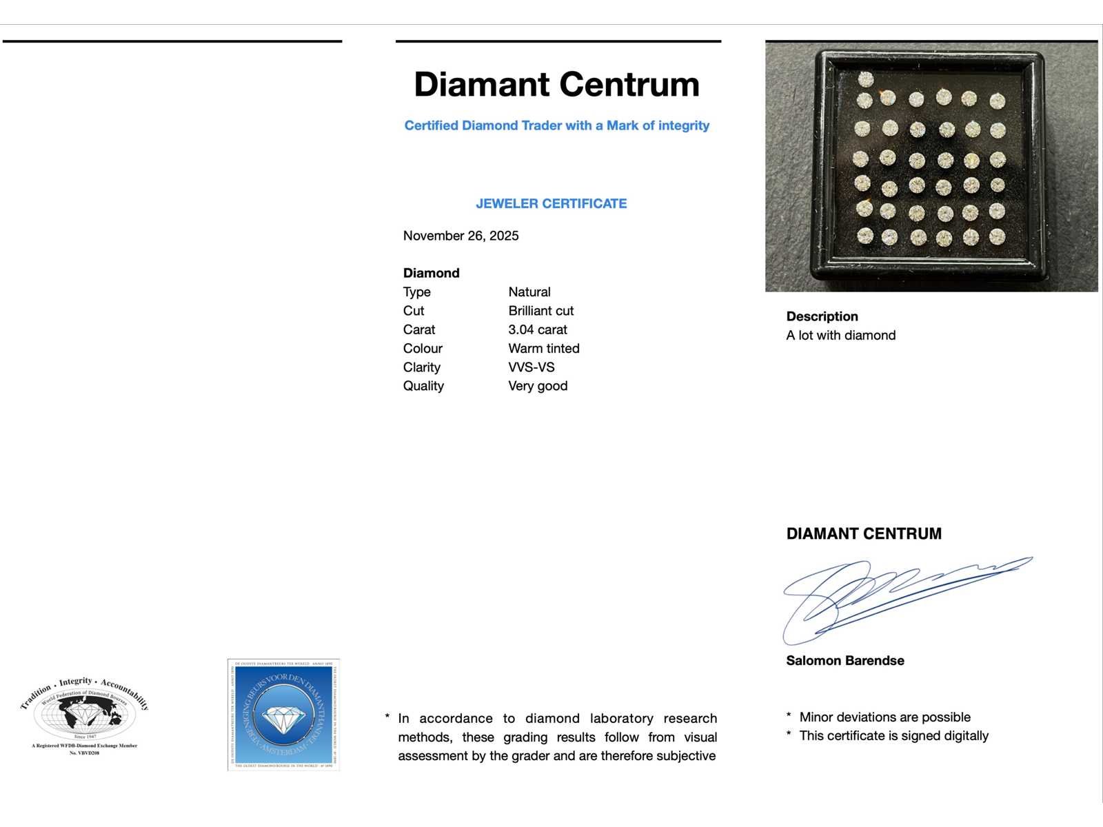 Samenvatting van gegevens Diamant - 3.04 carat echte natuurlijke briljant geslepen diamant Diamant: Natuurlijk; Slijpvorm: Briljant geslepen; Gewicht (carat): 3.04 carat; Kleur: Warm getint; Zuiverheid: VVS-VS; Slijpkwaliteit: Very good; Conditie: Nieuw; Verpakking: Edelsteendoos; Toelichting: De kwaliteit is overgenomen van het rapport behorend bij item. De waardebepaling is een beoordeling van een gecertificeerde diamantair, gebaseerd op consumentenprijzen.; Consumentenprijs: € 7.350,- Within 14 days Voornaamste diamant: Natuurlijk Kleur diamant: Warm getint Gewicht diamant: 3.04ct Slijpvorm diamant: Briljant geslepen Slijpkwaliteit diamant: Very good Zuiverheidsgraad diamant: VVS-VS Lage schatting: 5880€ Hoge schatting: 7350€