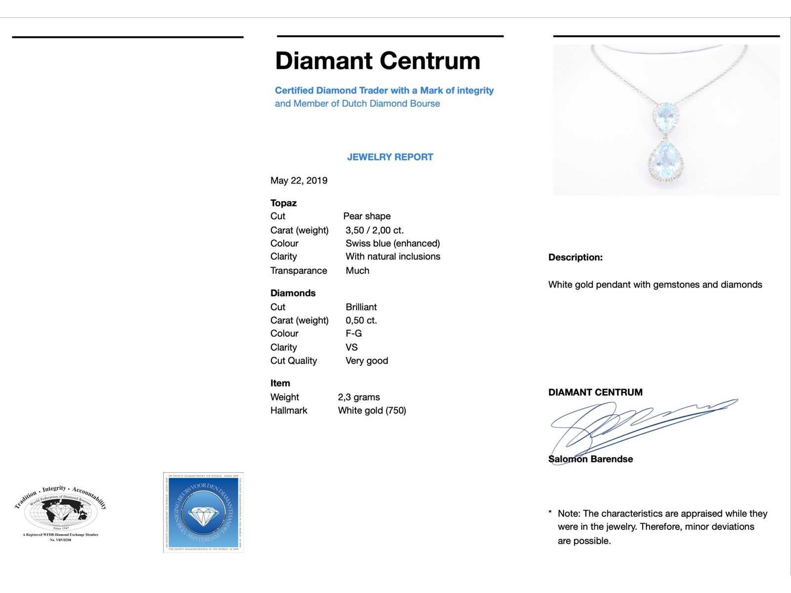 Samenvatting van gegevens Witgouden entourage hanger bezet met topaas en diamanten Diamant: Natuurlijk; Slijpvorm: Briljant geslepen; Gewicht (carat): 0.50 carat; Kleur: F-G; Zuiverheid: VS; Slijpkwaliteit: Zeer mooi; Edelsteen: Topaas; Aantal: 1 stuk; Slijpvorm: Druppel vorm; Gewicht (carat): 3.50 carat; Kleur: Swiss Blue; Edelsteen (secundair): Topaas; Aantal: 1 stuk; Slijpvorm: Peer shape; Gewicht (carat): 2.00 carat; Kleur: Swiss Blue; Juweel: Hanger (excl. ketting); Gewicht: 2.1 gram; Afmetingen/lengte: 2.3 cm; Materiaal: 18K goud (750); Conditie: Nieuw; Verpakking: Luxe sieradendoos; Toelichting: De kwaliteit is overgenomen van het rapport behorend bij item. De waardebepaling is een beoordeling van een gecertificeerde diamantair, gebaseerd op consumentenprijzen.; Consumentenprijs: € 4.270,- Within 14 days Materiaal: Goud Voornaamste diamant: Natuurlijk Kleur diamant: F-G Gewicht diamant: 0.50ct Slijpvorm diamant: Briljant geslepen Slijpkwaliteit diamant: Zeer mooi Zuiverheidsgraad diamant: VS Edelsteen: Topaas Kleur edelsteen: Swiss Blue Slijpvorm edelsteen: Druppel vorm Totaal gewicht: 2.1g Keurmerk: 750 Lage schatting: 3416€ Hoge schatting: 4270€