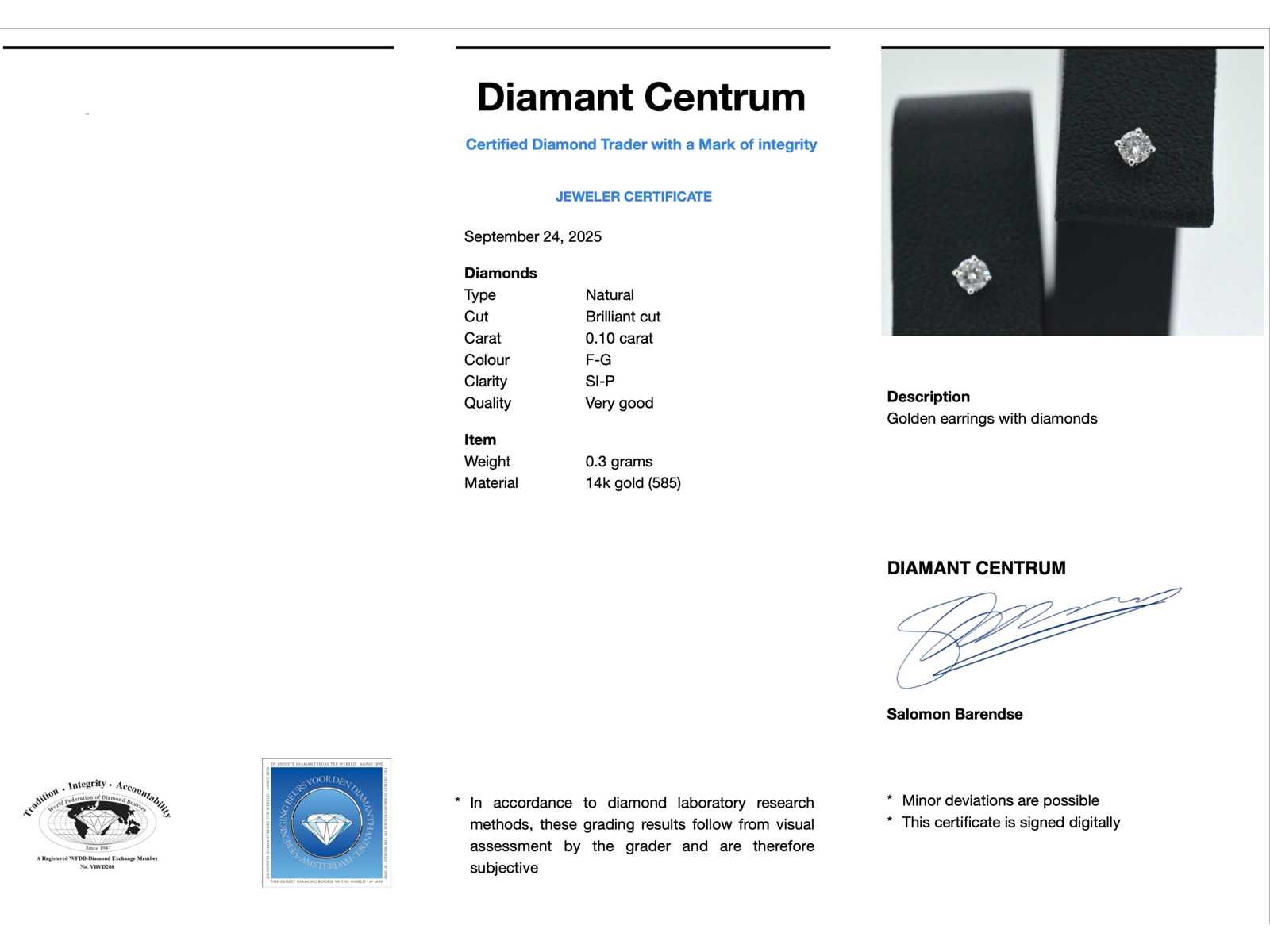 Samenvatting van gegevens Witgouden oorbellen met diamant Diamant: Natuurlijk; Aantal: 2 stuks; Slijpvorm: Briljant geslepen; Gewicht (carat): 0.10 carat; Kleur: F-G; Zuiverheid: SI-P; Slijpkwaliteit: Zeer mooi; Juweel: Oorbellen; Gewicht: 0.3 gram; Materiaal: 14 karaat (585); Conditie: Nieuw; Verpakking: Luxe sieradendoos; Toelichting: De kwaliteit is overgenomen van het rapport behorend bij item. De waardebepaling is een beoordeling van een gecertificeerde diamantair, gebaseerd op consumentenprijzen.; Consumentenprijs: € 665,- Within 14 days Voornaamste diamant: Natuurlijk Kleur diamant: F-G Gewicht diamant: 0.10ct Slijpvorm diamant: Briljant geslepen Slijpkwaliteit diamant: Zeer mooi Zuiverheidsgraad diamant: SI-P Totaal gewicht: 0.3g Keurmerk: 585 Lage schatting: 532€ Hoge schatting: 665€