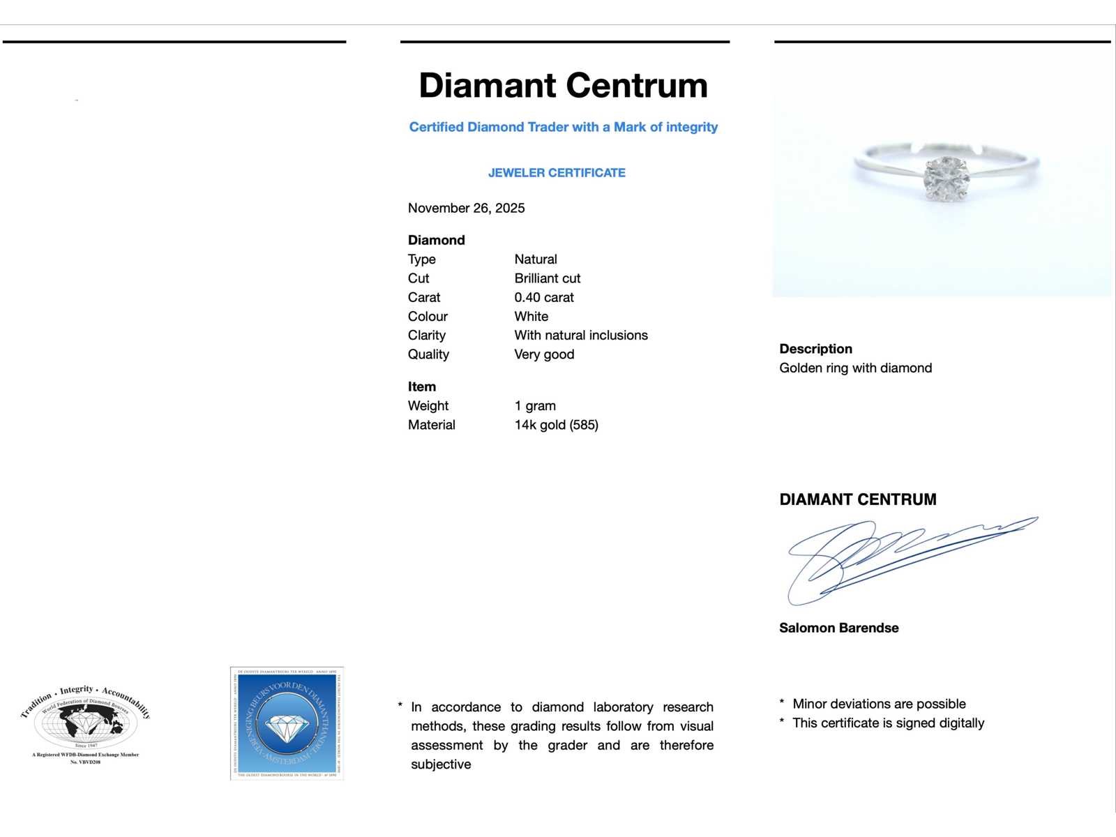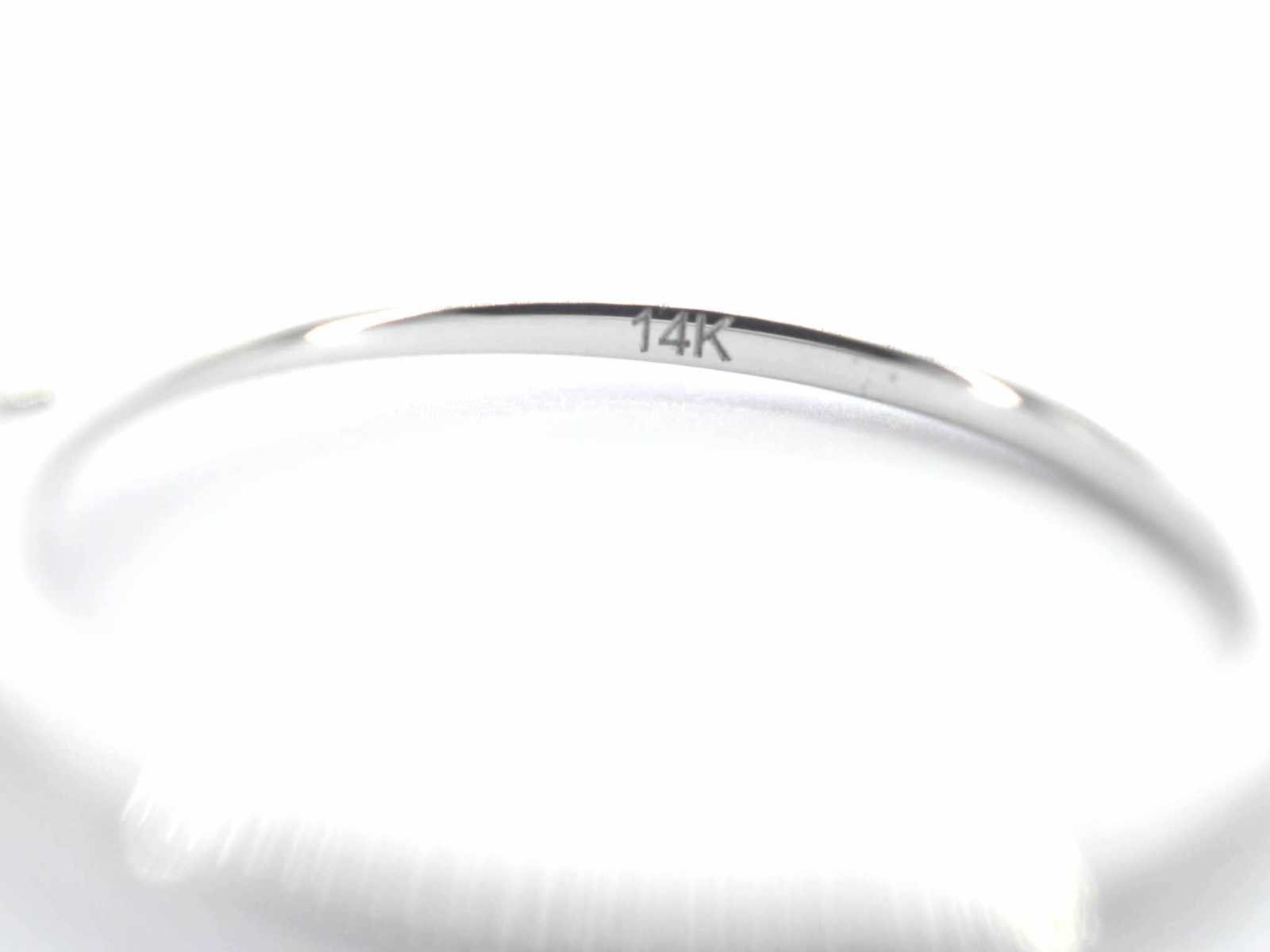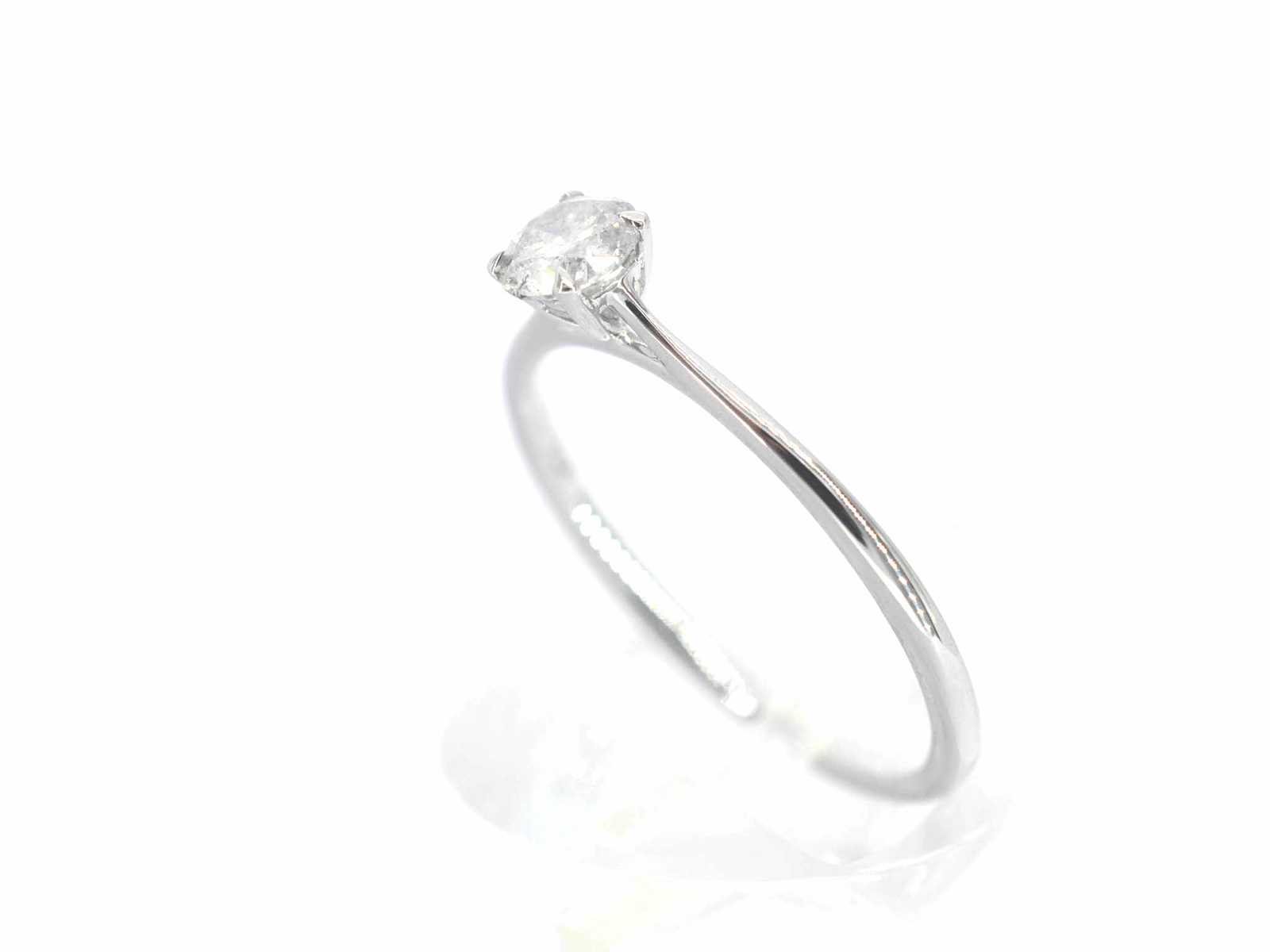 Samenvatting van gegevens Witgouden ring solitair met natuurlijke briljant geslepen diamanten Diamant: Natuurlijk; Aantal: 1 stuk; Slijpvorm: Briljant geslepen; Gewicht (carat): 0.40 carat; Kleur: Wit; Zuiverheid: Met natuurlijke insluitsels; Slijpkwaliteit: Zeer mooi; Juweel: Ring; Gewicht: 1 gram; Ringmaat (op maat gemaakt*): 54 (17.25 mm); Materiaal: 14k goud (585); Conditie: Nieuw; Verpakking: Luxe sieradendoos; Toelichting: De kwaliteit is overgenomen van het rapport behorend bij item. De waardebepaling is een beoordeling van een gecertificeerde diamantair, gebaseerd op consumentenprijzen.; Consumentenprijs: € 1.500,- Within 14 days Materiaal: Goud Voornaamste diamant: Natuurlijk Gewicht diamant: 0.40ct Totaal gewicht: 1g Keurmerk: 585 Lage schatting: 1200€ Hoge schatting: 1500€ Kleur diamant: Wit Slijpvorm diamant: Briljant geslepen Slijpkwaliteit diamant: Zeer mooi Zuiverheidsgraad diamant: Met natuurlijke insluitsels