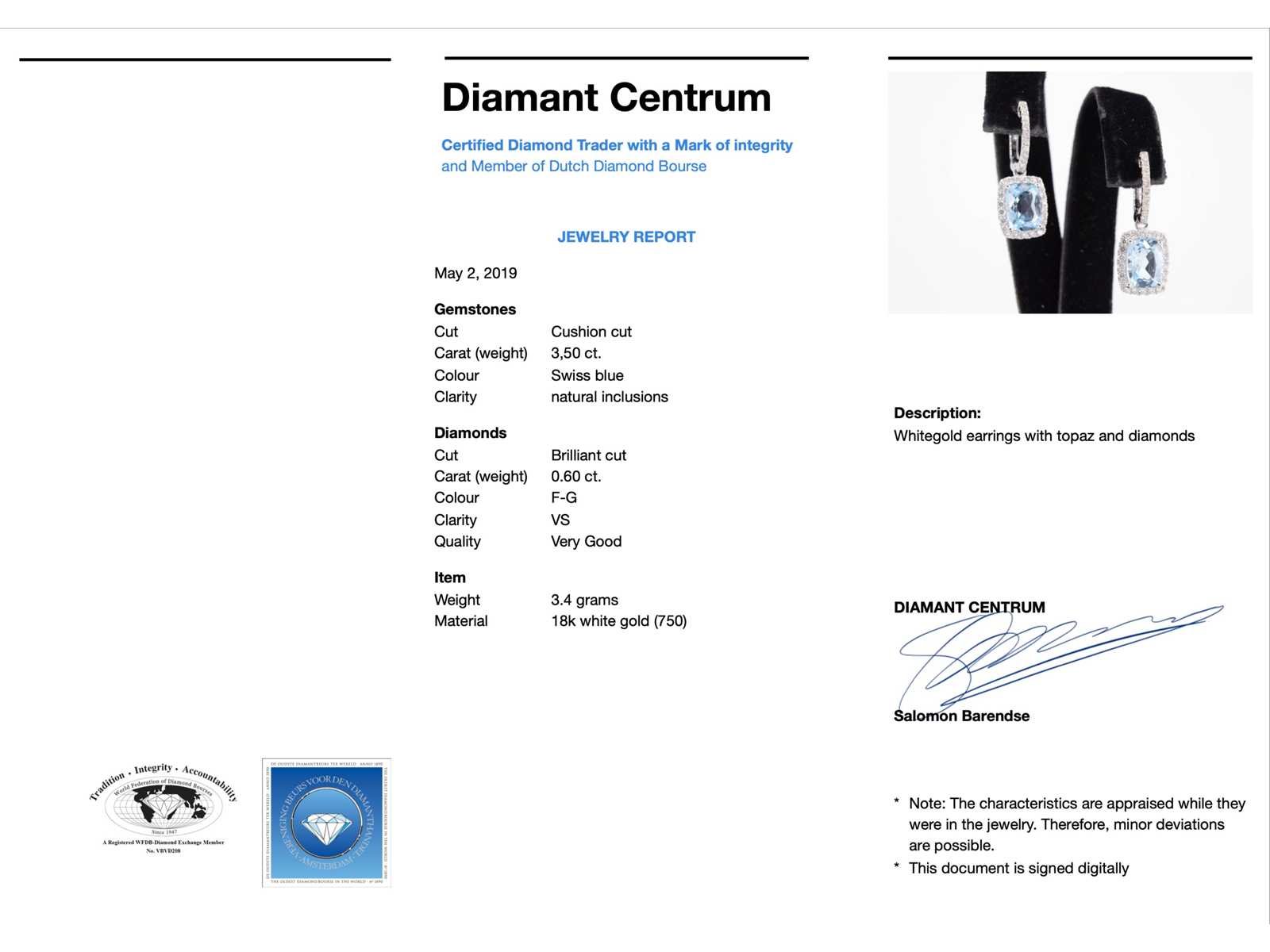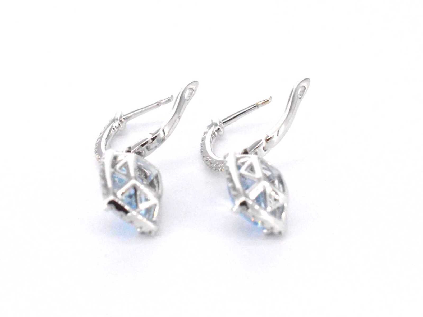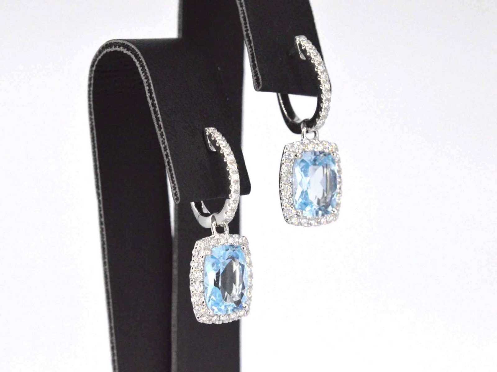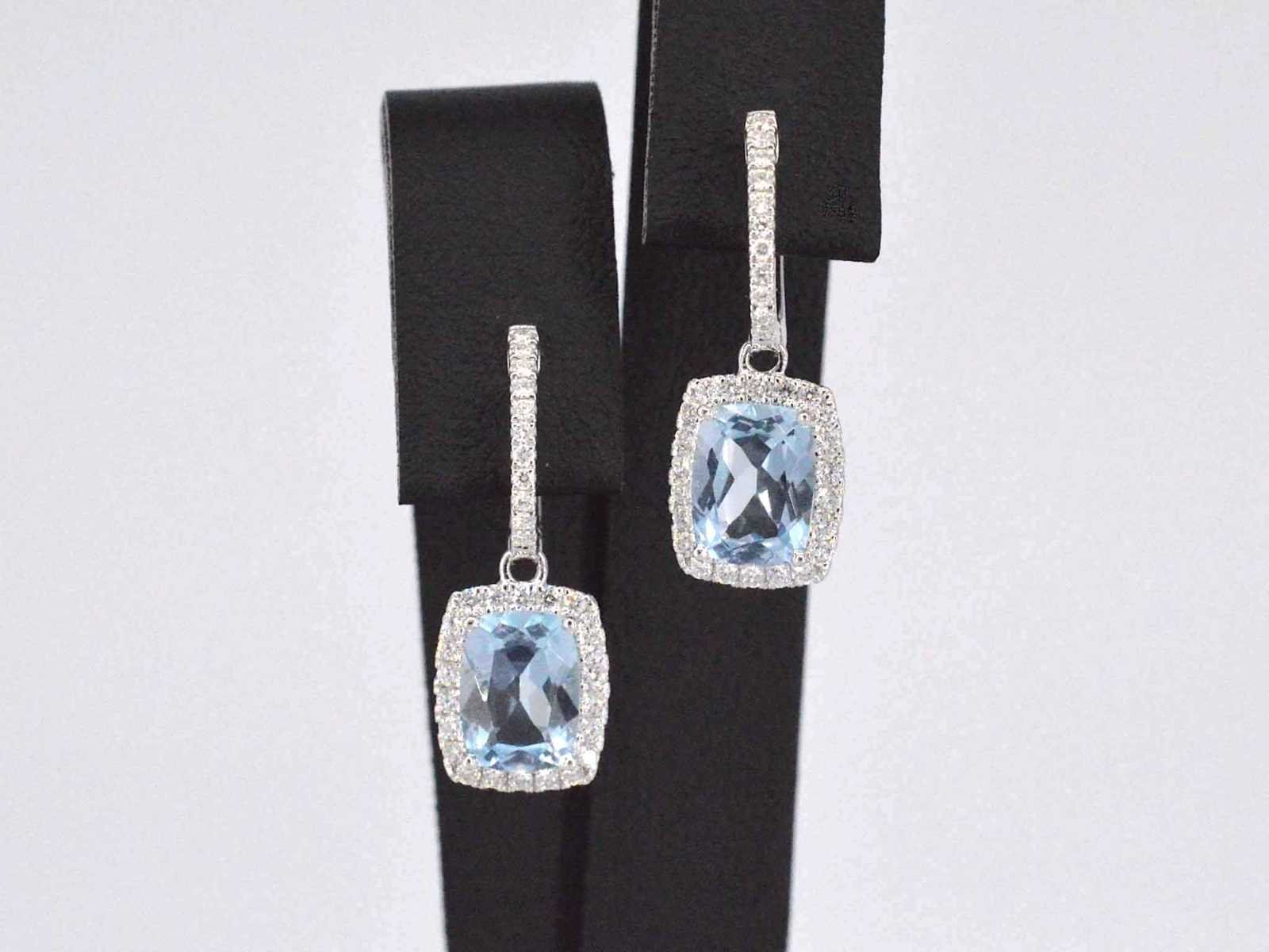 Samenvatting van gegevens Witgouden entourage oorbellen met grote topazen en diamanten Diamant: Natuurlijk; Slijpvorm: Briljant geslepen; Gewicht (carat): 0.60 carat; Kleur: F-G; Zuiverheid: VS; Slijpkwaliteit: Zeer mooi; Edelsteen: Topaas; Slijpvorm: Kussenvormig; Gewicht (carat): 3.50 carat; Kleur: Swiss blue; Juweel: Oorbellen; Gewicht: 3.4 gram; Afmetingen/lengte: 25 x 9 mm; Materiaal: 18 karaat (750 ); Conditie: Nieuw; Verpakking: Luxe sieradendoos; Toelichting: De kwaliteit is overgenomen van het rapport behorend bij item. De waardebepaling is een beoordeling van een gecertificeerde diamantair, gebaseerd op consumentenprijzen.; Consumentenprijs: € 6.545,- Within 14 days Voornaamste diamant: Natuurlijk Kleur diamant: F-G Gewicht diamant: 0.60ct Slijpvorm diamant: Briljant geslepen Slijpkwaliteit diamant: Zeer mooi Zuiverheidsgraad diamant: VS Edelsteen: Topaas Kleur edelsteen: Swiss blue Slijpvorm edelsteen: Kussenvormig Totaal gewicht: 3.4g Keurmerk: 750 Lage schatting: 5236€ Hoge schatting: 6545€