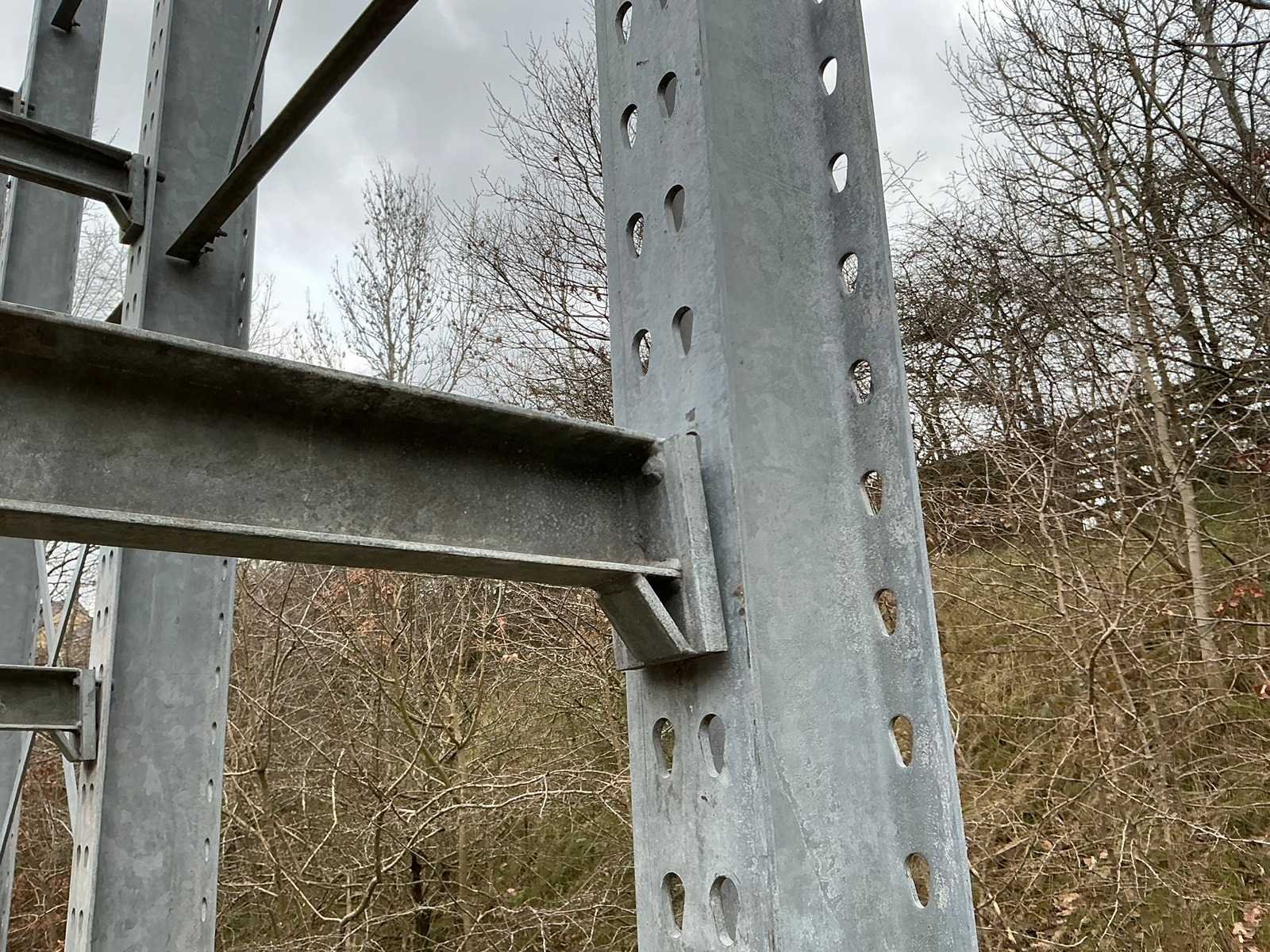 Dit kavel heeft 14 staanders en 42 armen; Reeds gedemonteerd; wordt gedemonteerd uitgeleverd; staander; armen in hoogte verstelbaar; kolomhoogte 5000mm; gegalvaniseerd; armlengte 1240mm; draaglast 1000kg per arm; Sectie afm. h: 5000mm Aantal staanders: 14 Aantal liggers: 42