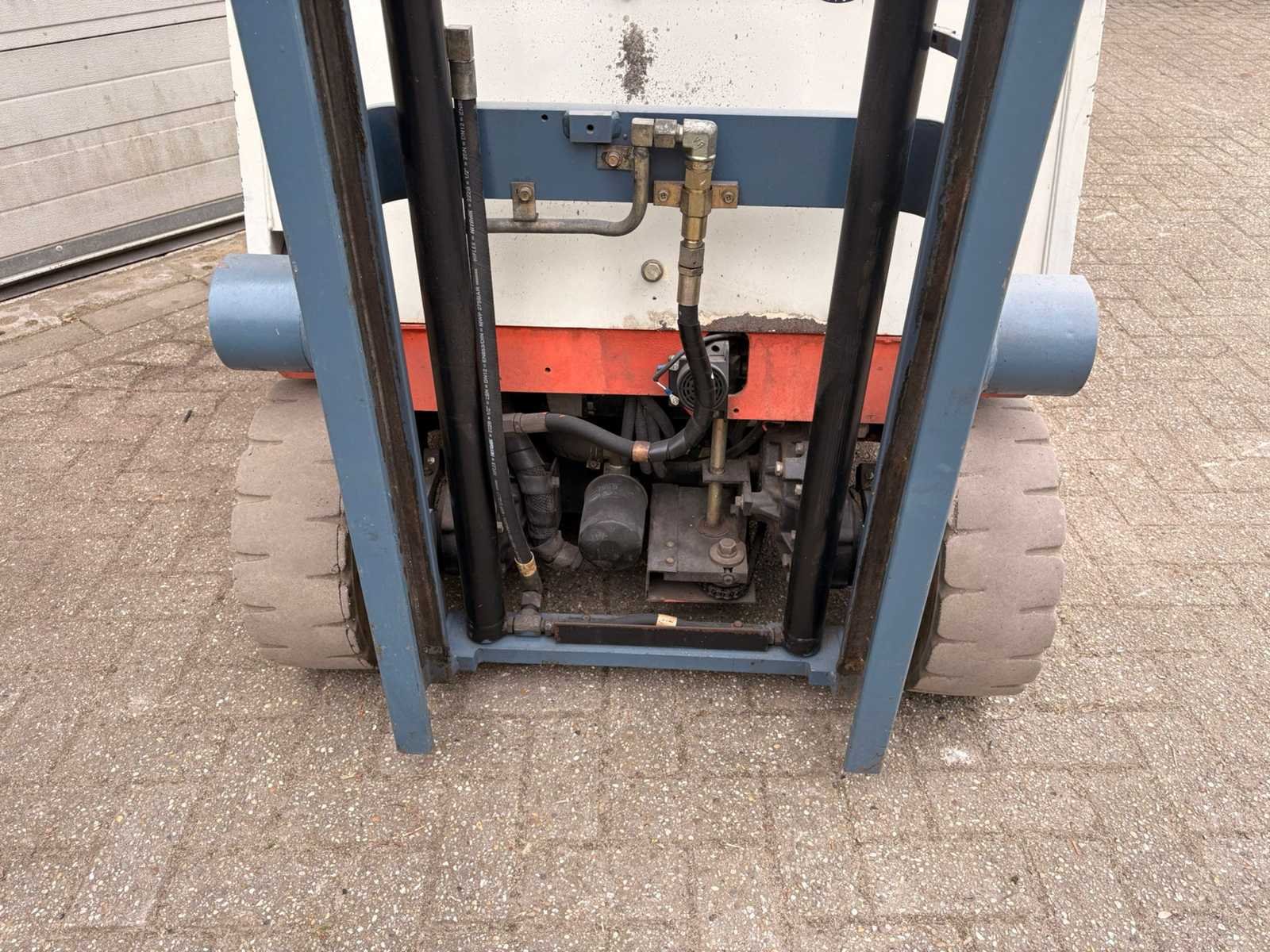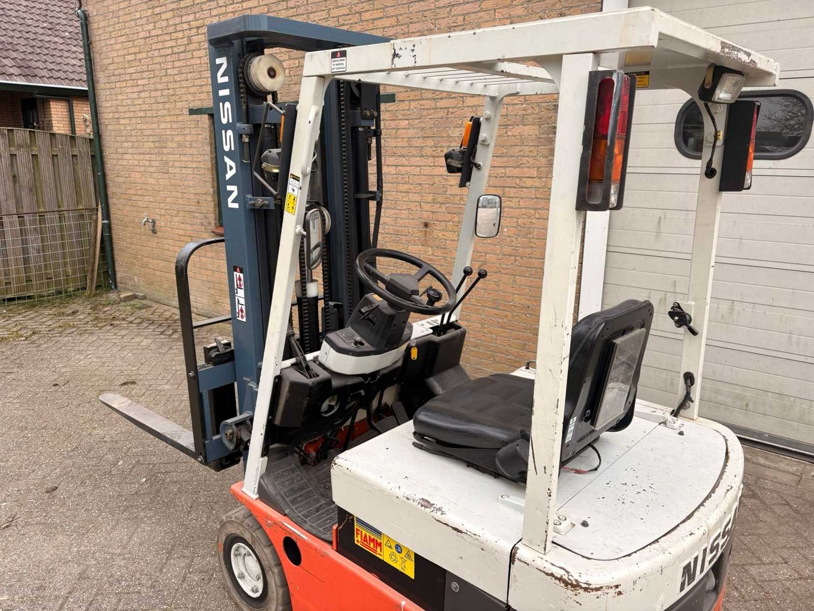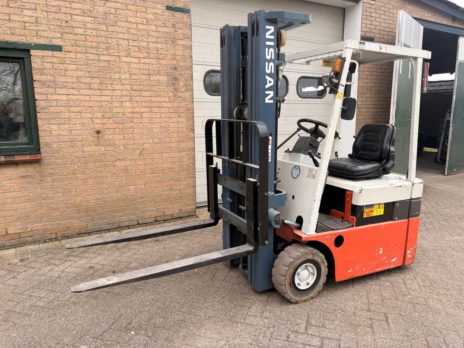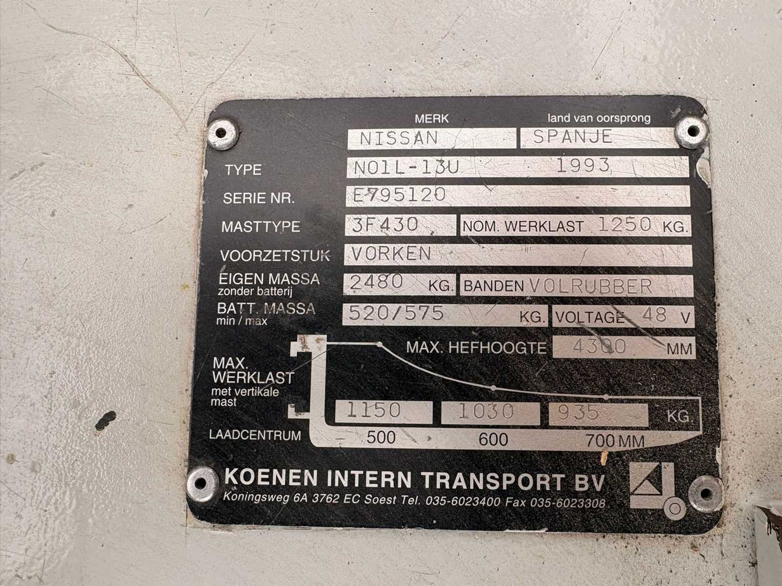 Merk: Nissan Type: N01L-13U Bouwjaar: 1993 Serienummer: E795120 Brandstof: Elektrisch Mast: Triplex mast Aantal wielen: 3 Afgelezen urenstand: 8663 Accu lader: true Triple mast: true Lepellengte: 1200mm Hefhoogte: 4300mm Vol rubber banden: true