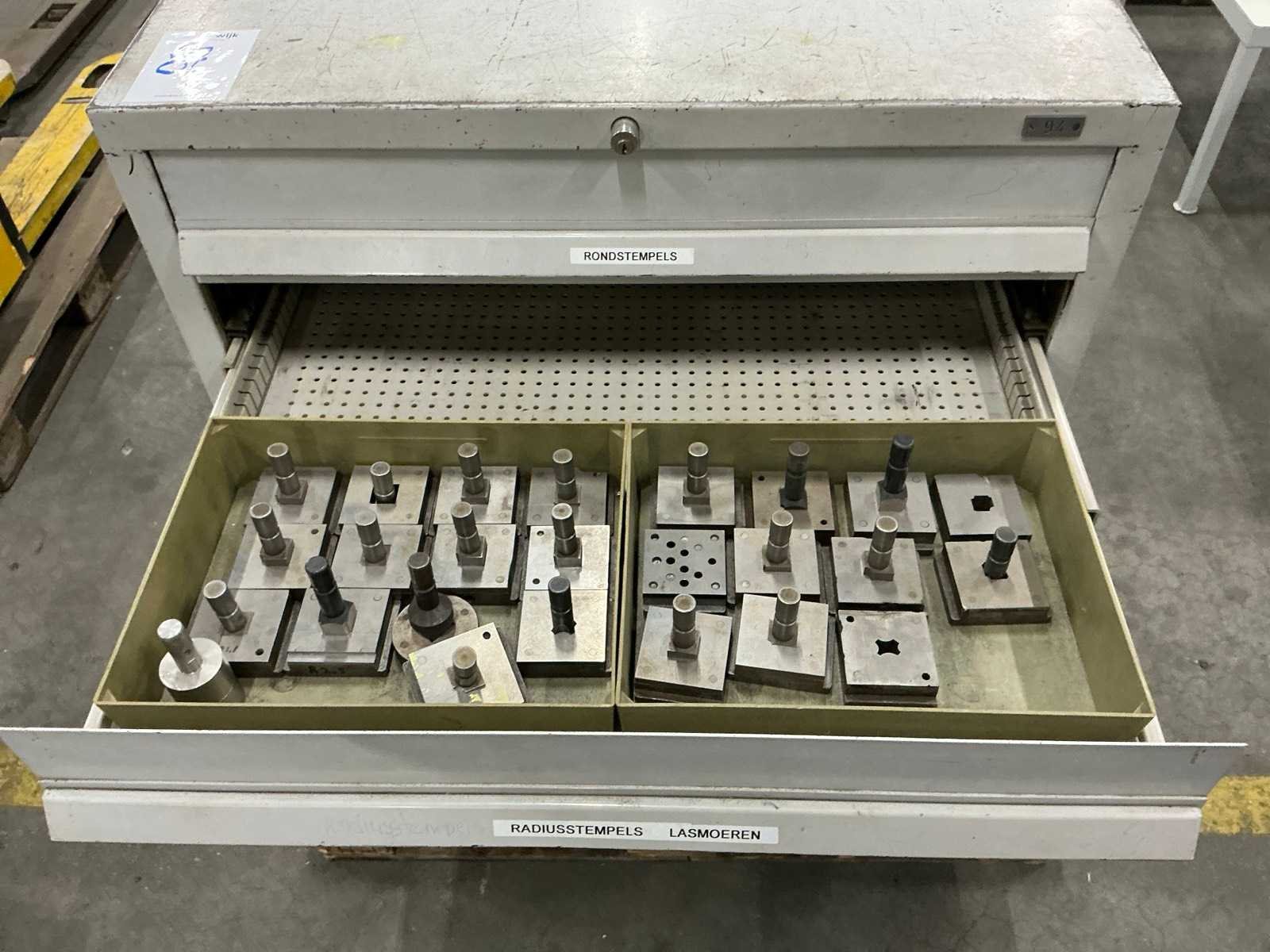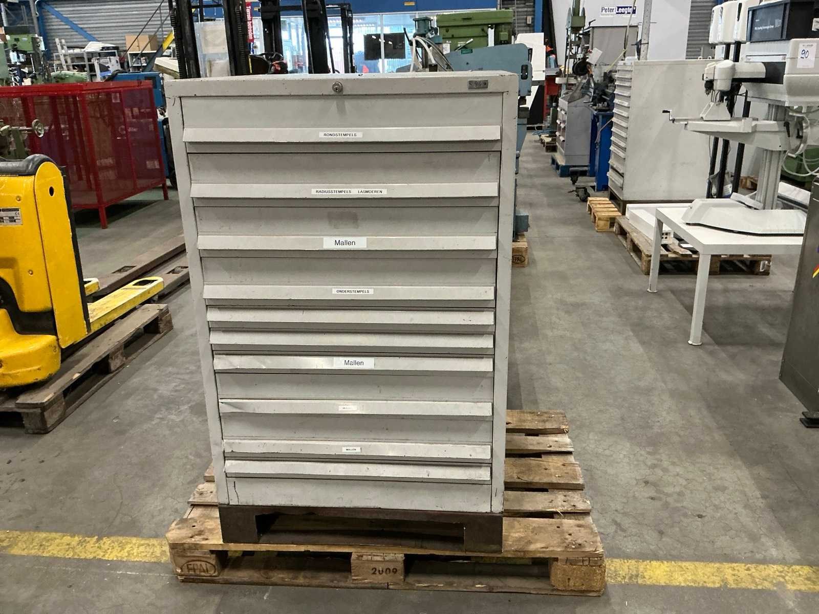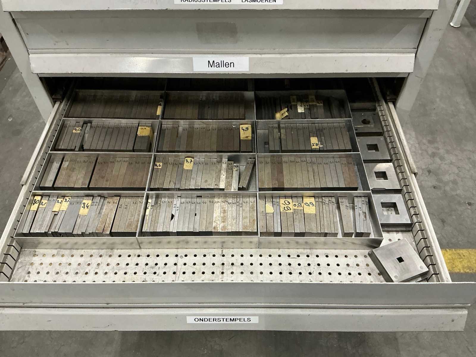 10 lades waarvan 4 lades gevuld; waaronder rondstempels; radiusstempels en eindmaten; mallen; zonder sleutel Totale afmeting L: 780mm Totale afmeting Breedte: 760mm Totale afmeting Hoogte: 1200mm