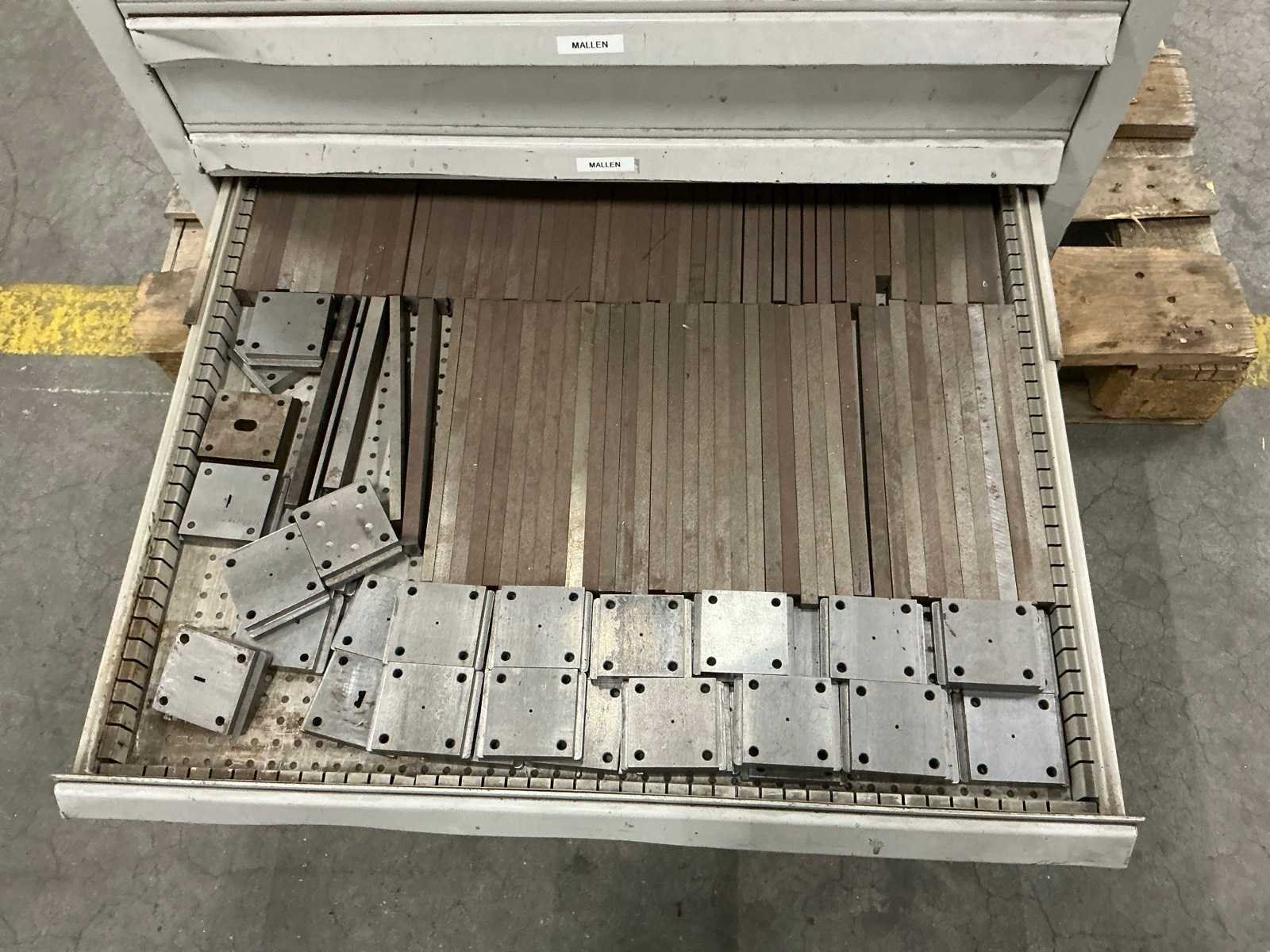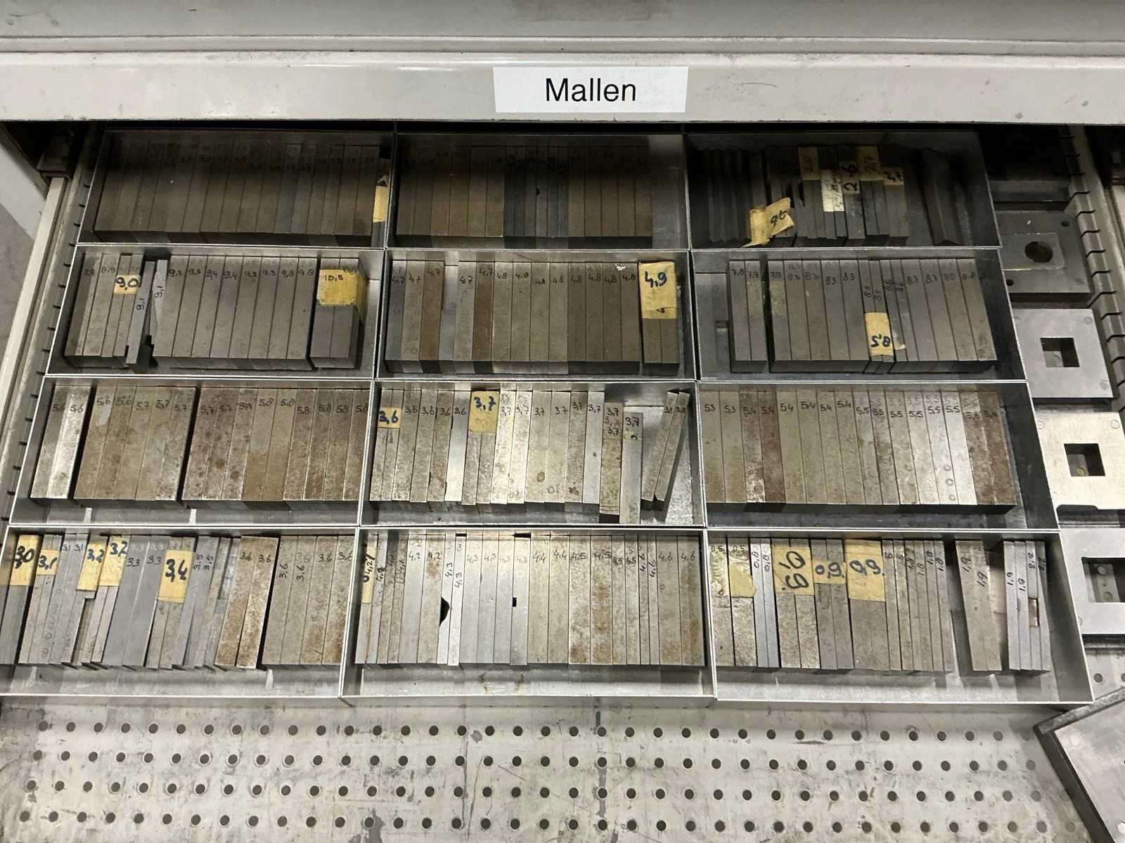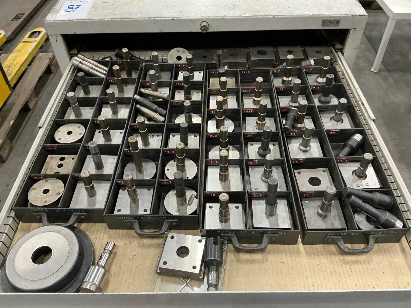 10 lades waarvan 4 lades gevuld; waaronder rondstempels; radiusstempels en eindmaten; mallen; zonder sleutel Totale afmeting L: 780mm Totale afmeting Breedte: 760mm Totale afmeting Hoogte: 1200mm