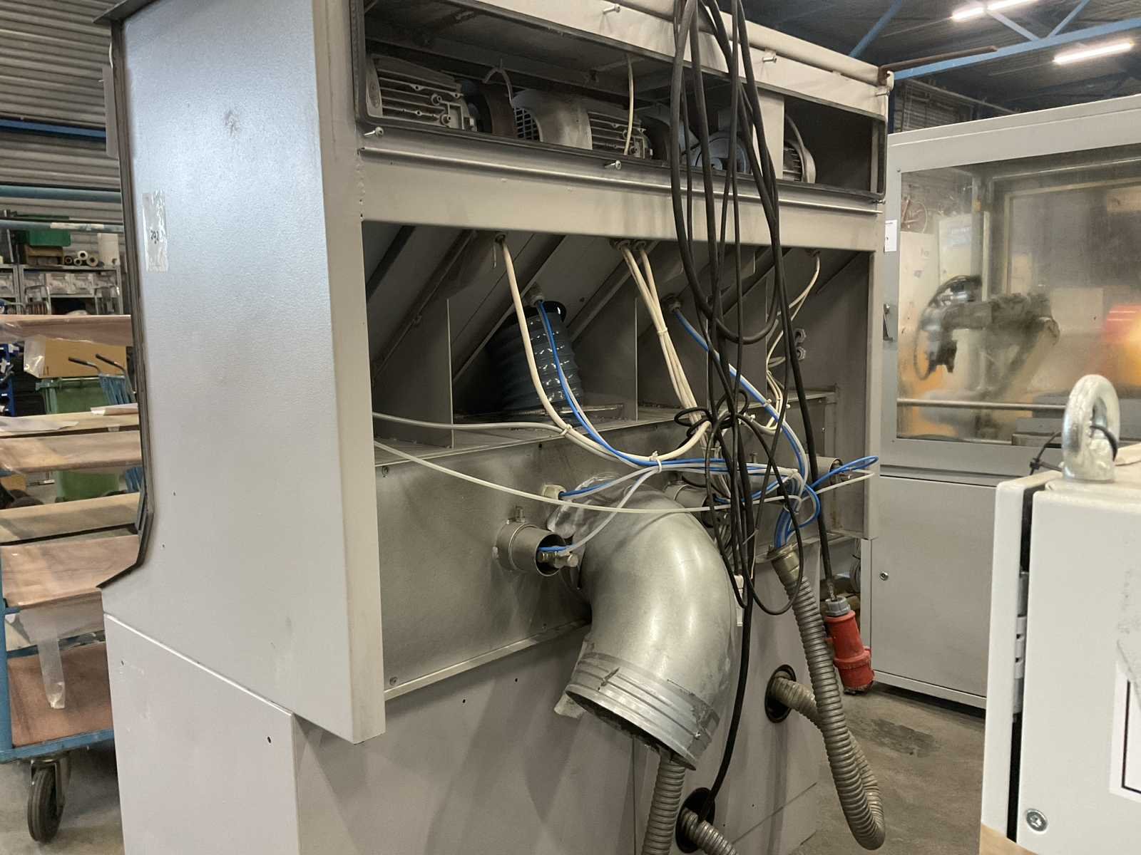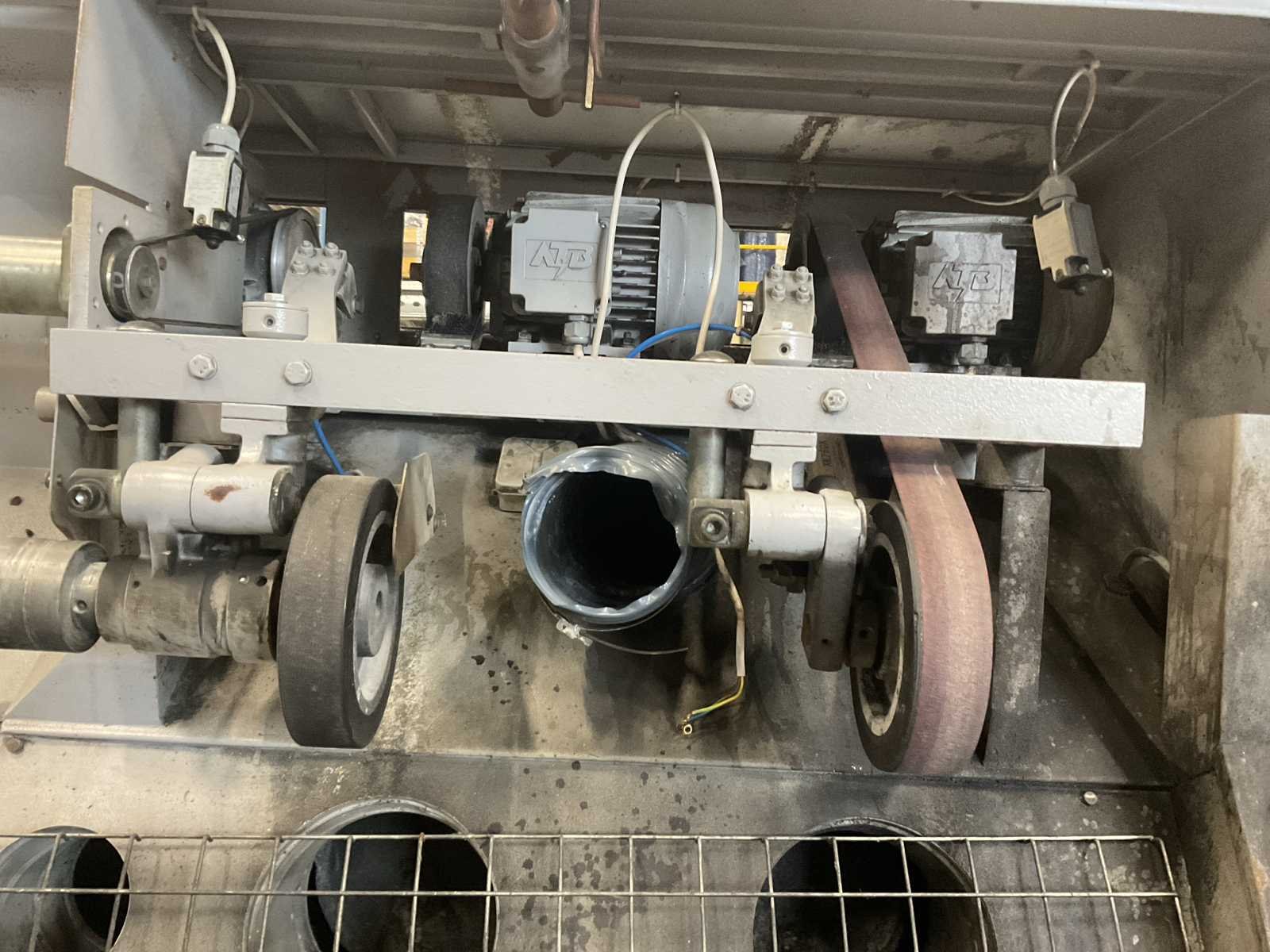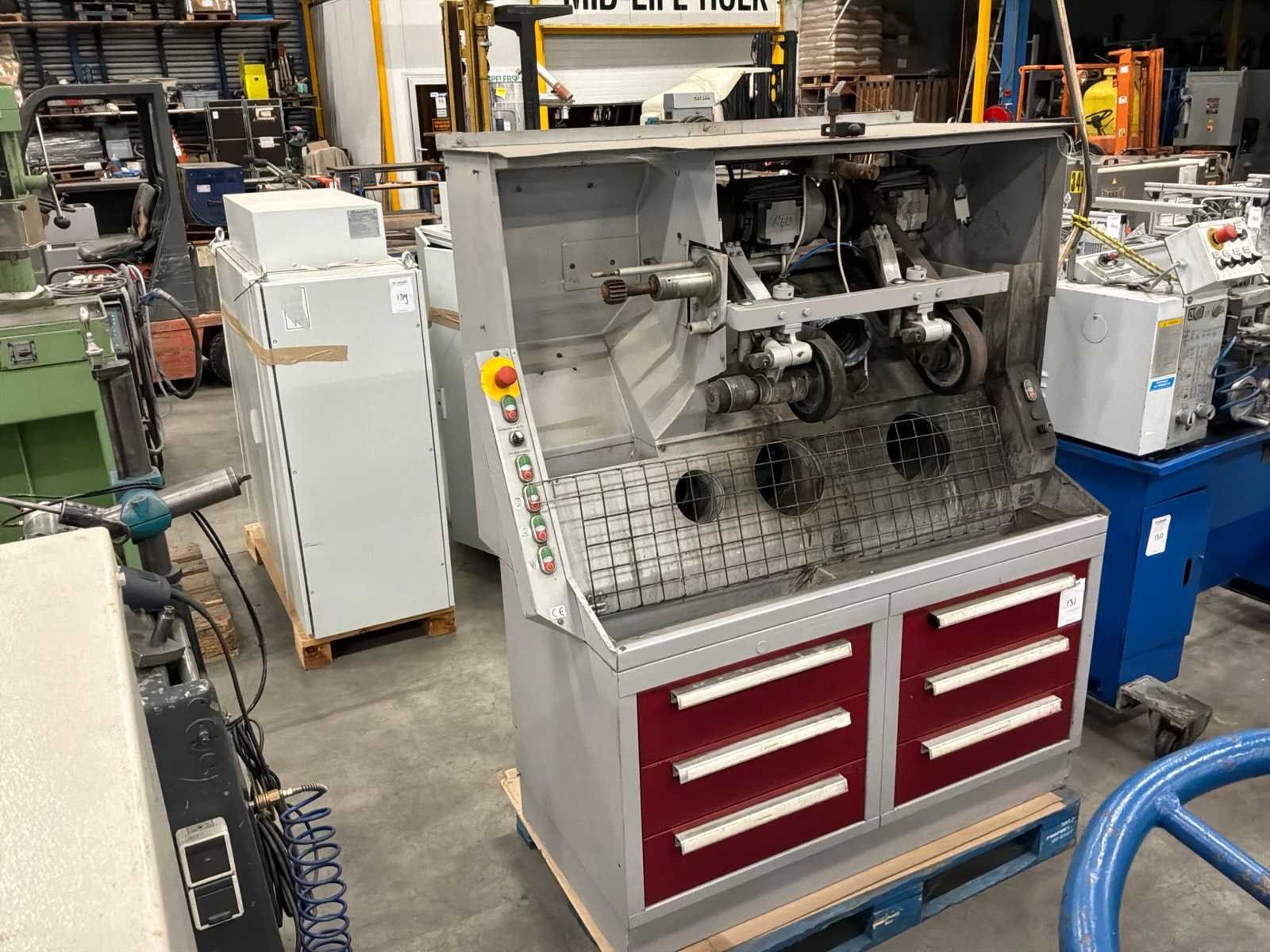 (2x) elektrisch aangedreven schuur-/polijstband; maximale werkbreedte 40 mm; voorzien van afzuigslang; gemonteerd op ladenkast Aansluiting: 400V Totale afmeting L: 1350mm Totale afmeting Breedte: 750mm Totale afmeting Hoogte: 1700mm