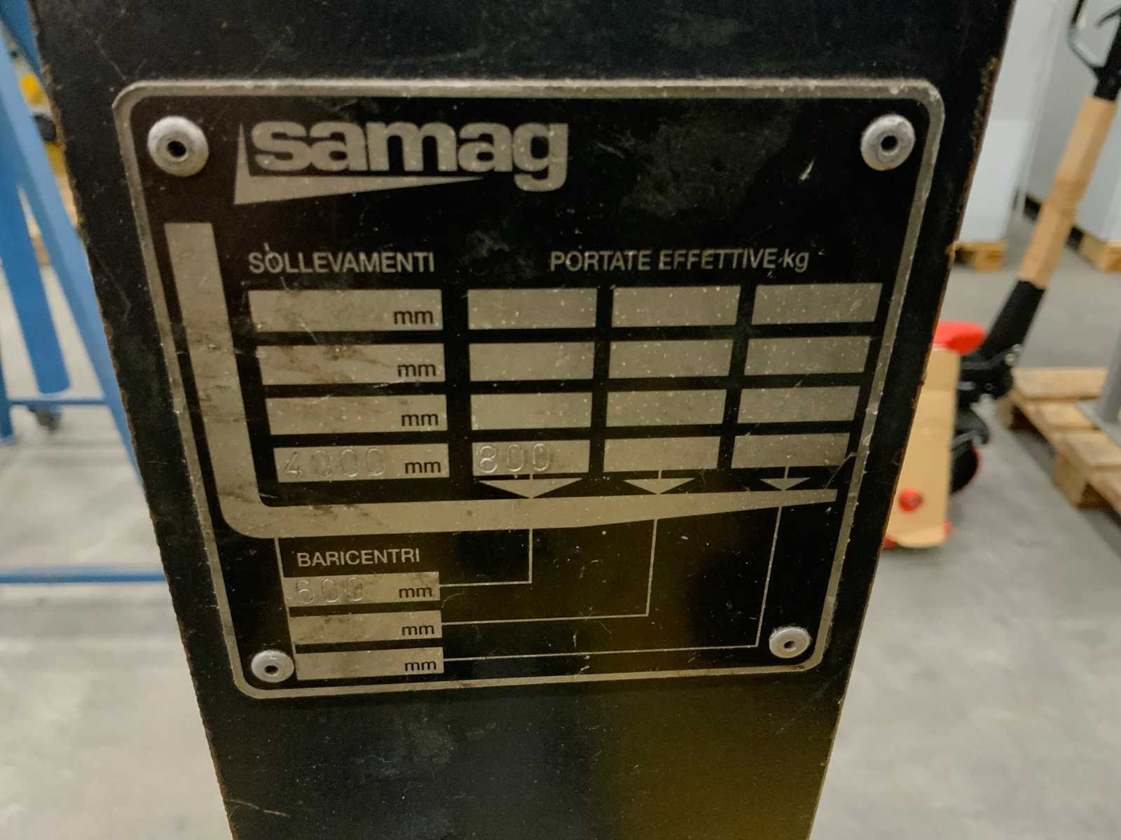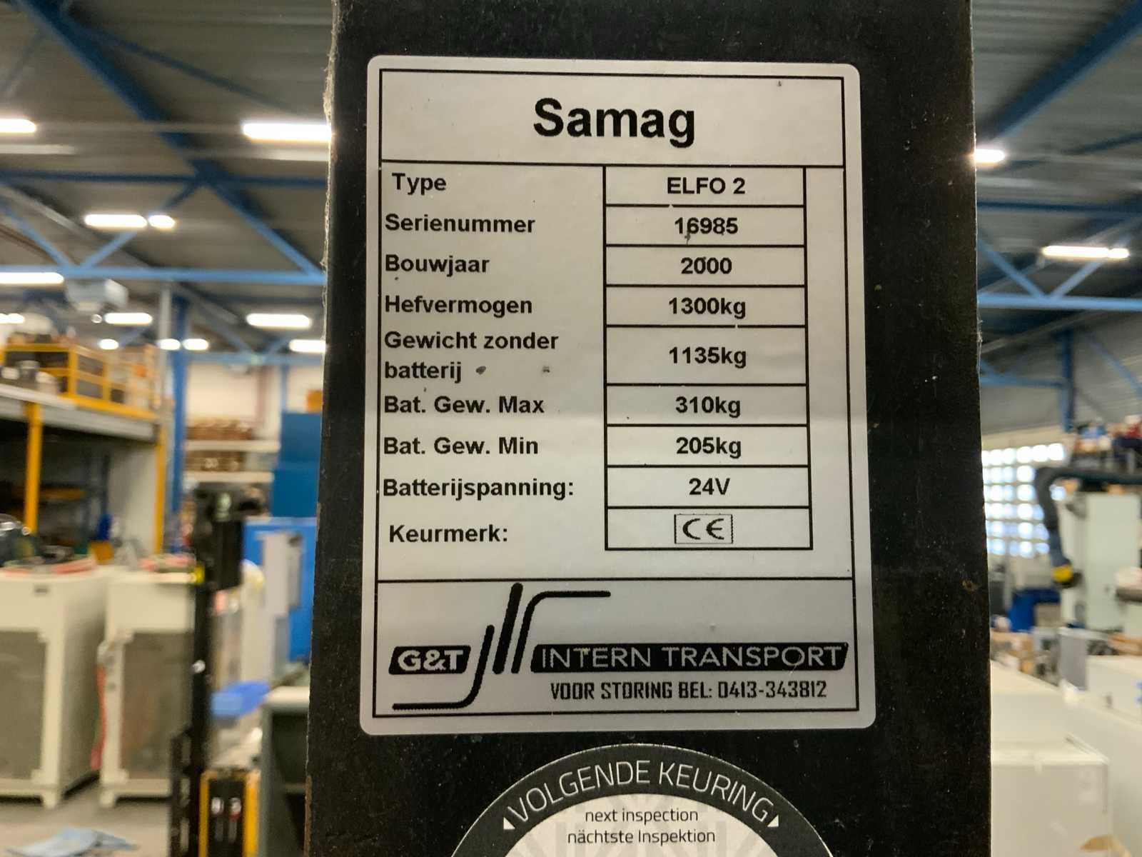 Merk: Samag Type: Elfo 2 Bouwjaar: 2000 Serienummer: 16985 Accu lader: true Triple mast: true Hefvermogen: 1300kg Lepellengte: 1150mm Hefhoogte: 4000mm Totale afmeting L: 2000mm Totale afmeting Breedte: 870mm Totale afmeting Hoogte: 2530mm Elektrisch: true