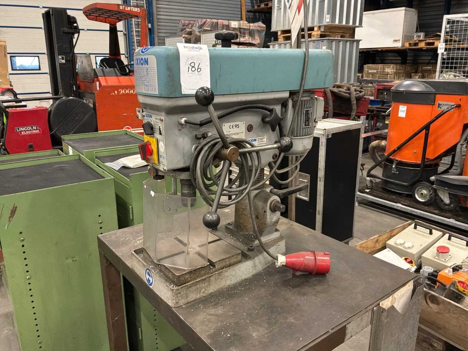 Gemonteerd op profielstaal tafel; Merk: Ixion Type: BT6 Serienummer: 180530 Boorcapaciteit: 14mm Aantal snelheden: 8 Snelheid van n =: 630rpm Snelheid tot n =: 7100rpm Boordiepte: 60mm Uitlading: 165mm Opname mc: 2 Tafel afmeting l: 200mm Tafel afmeting b: 200mm Aansluiting: 380V Afmeting l: 800mm Afmeting b: 600mm Afmeting h: 2480mm