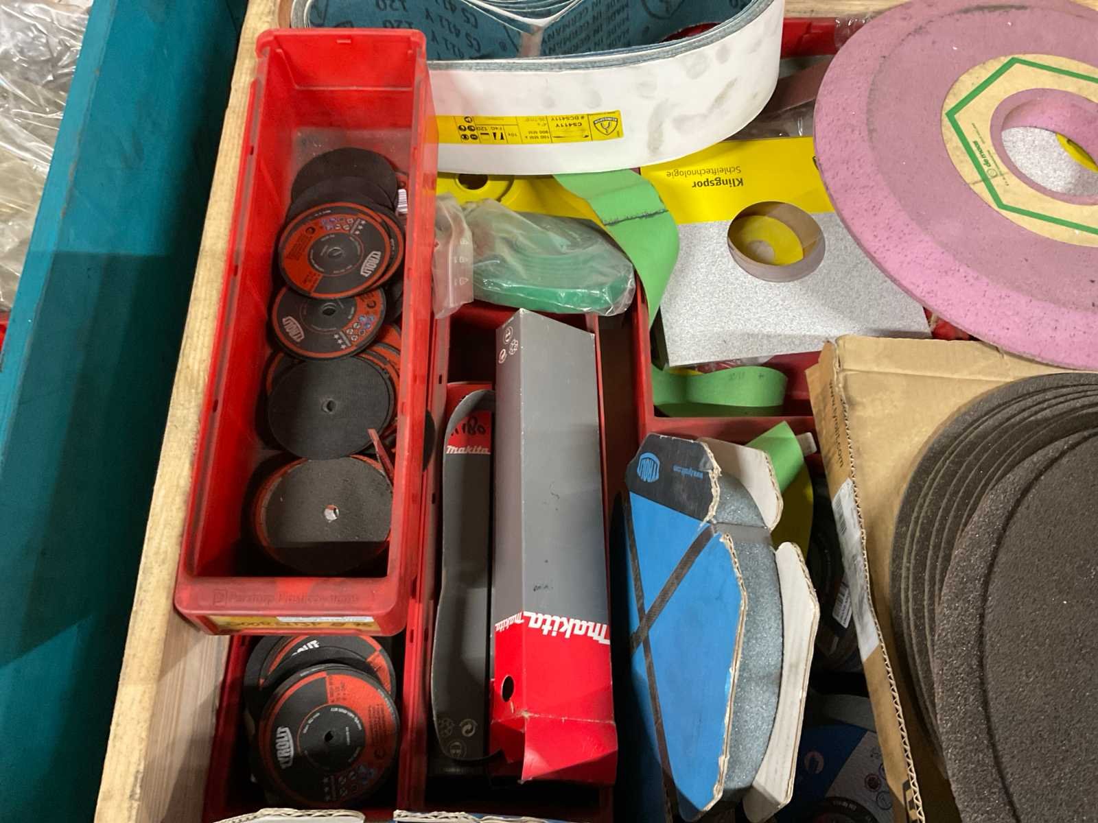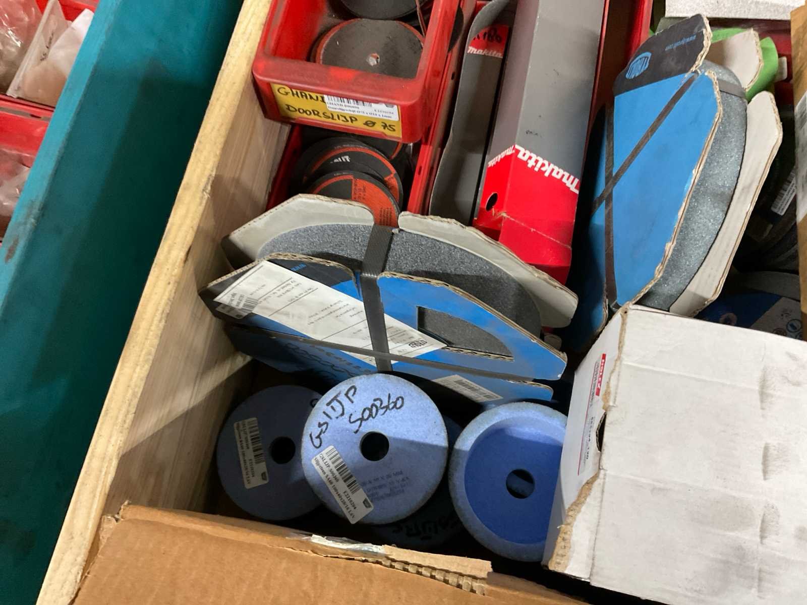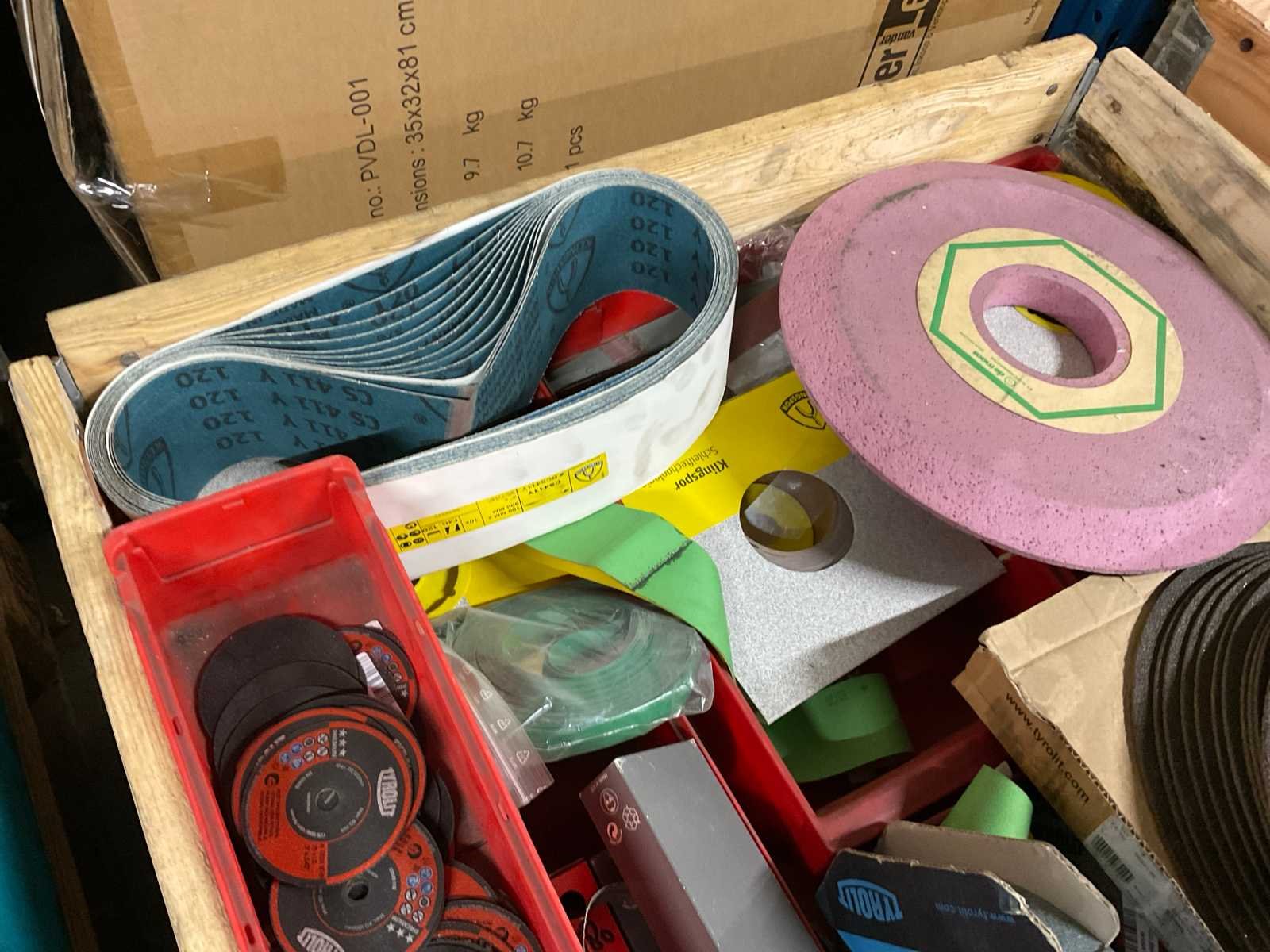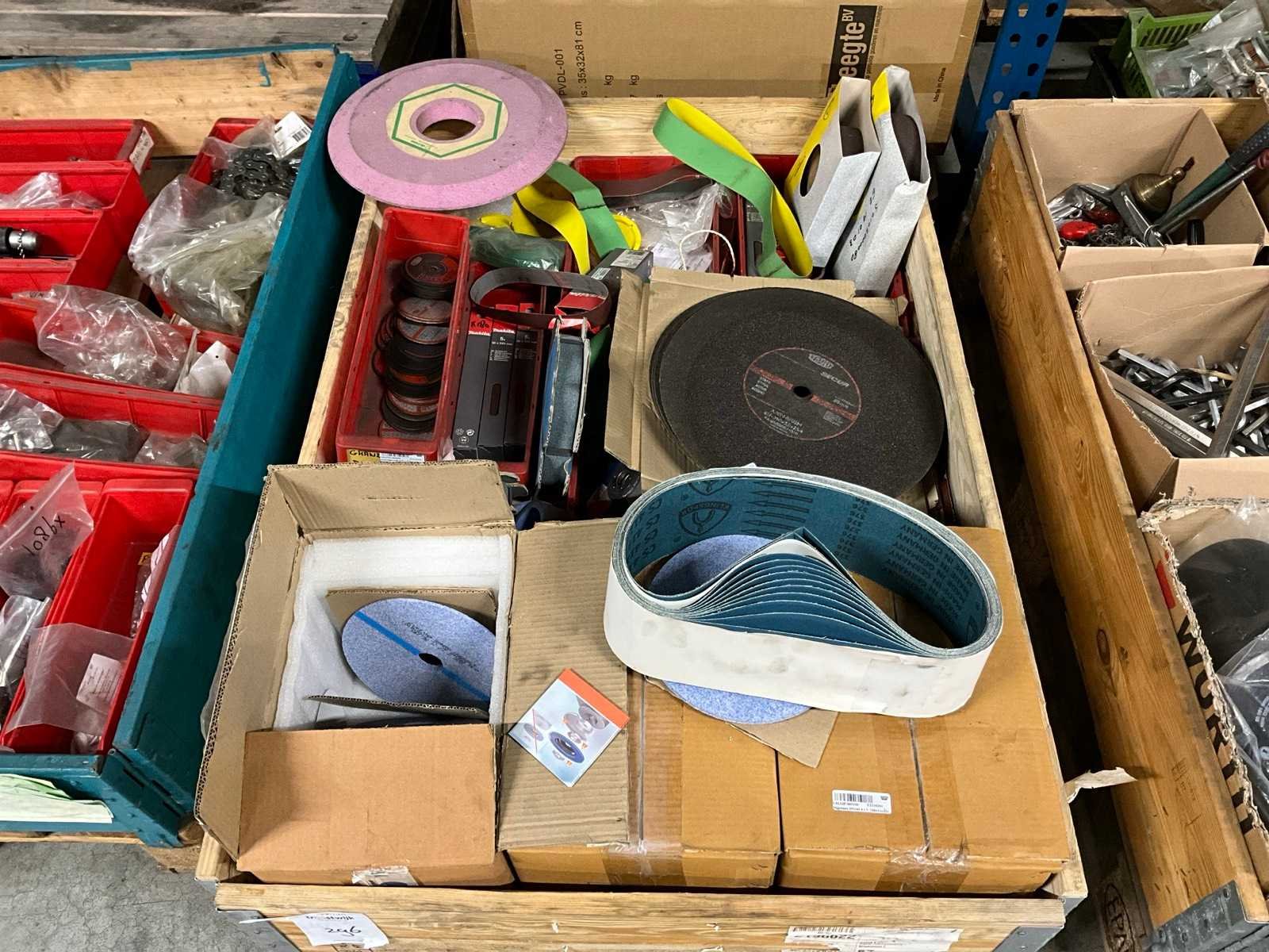 Waaronder diverse slijpschijven, slijpstenen, kettingen, schuurband, kunststof afdopmaterialen en kunststof ton ø circa 50 cm hoogte circa 70 cm; zonder palletbox;