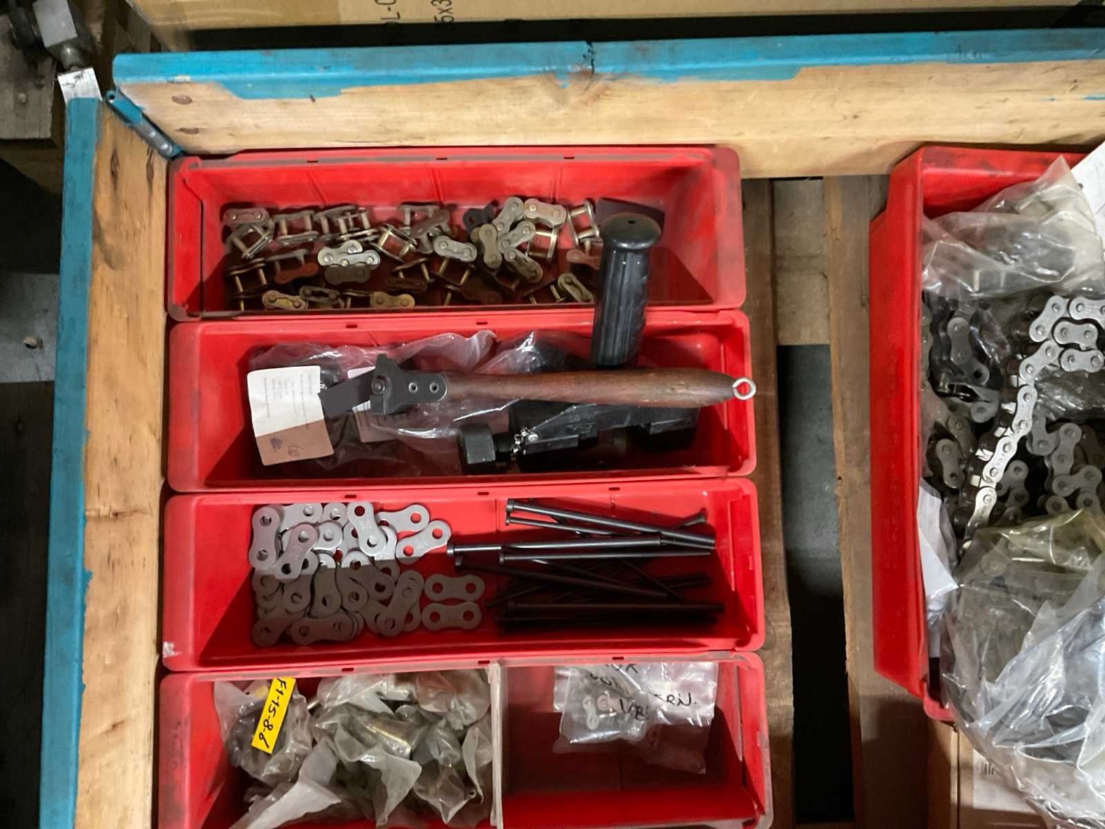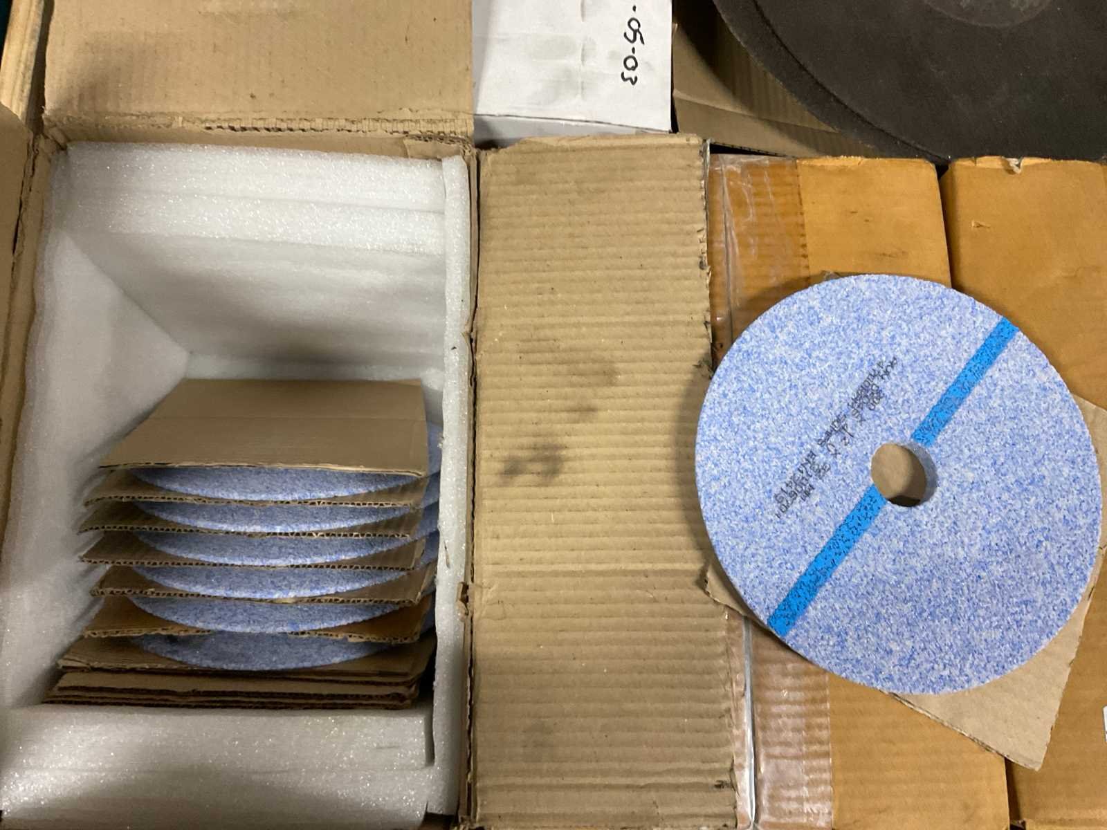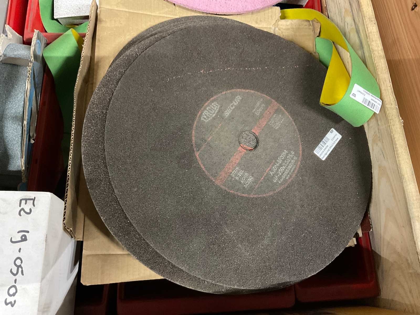Waaronder diverse slijpschijven, slijpstenen, kettingen, schuurband, kunststof afdopmaterialen en kunststof ton ø circa 50 cm hoogte circa 70 cm; zonder palletbox;