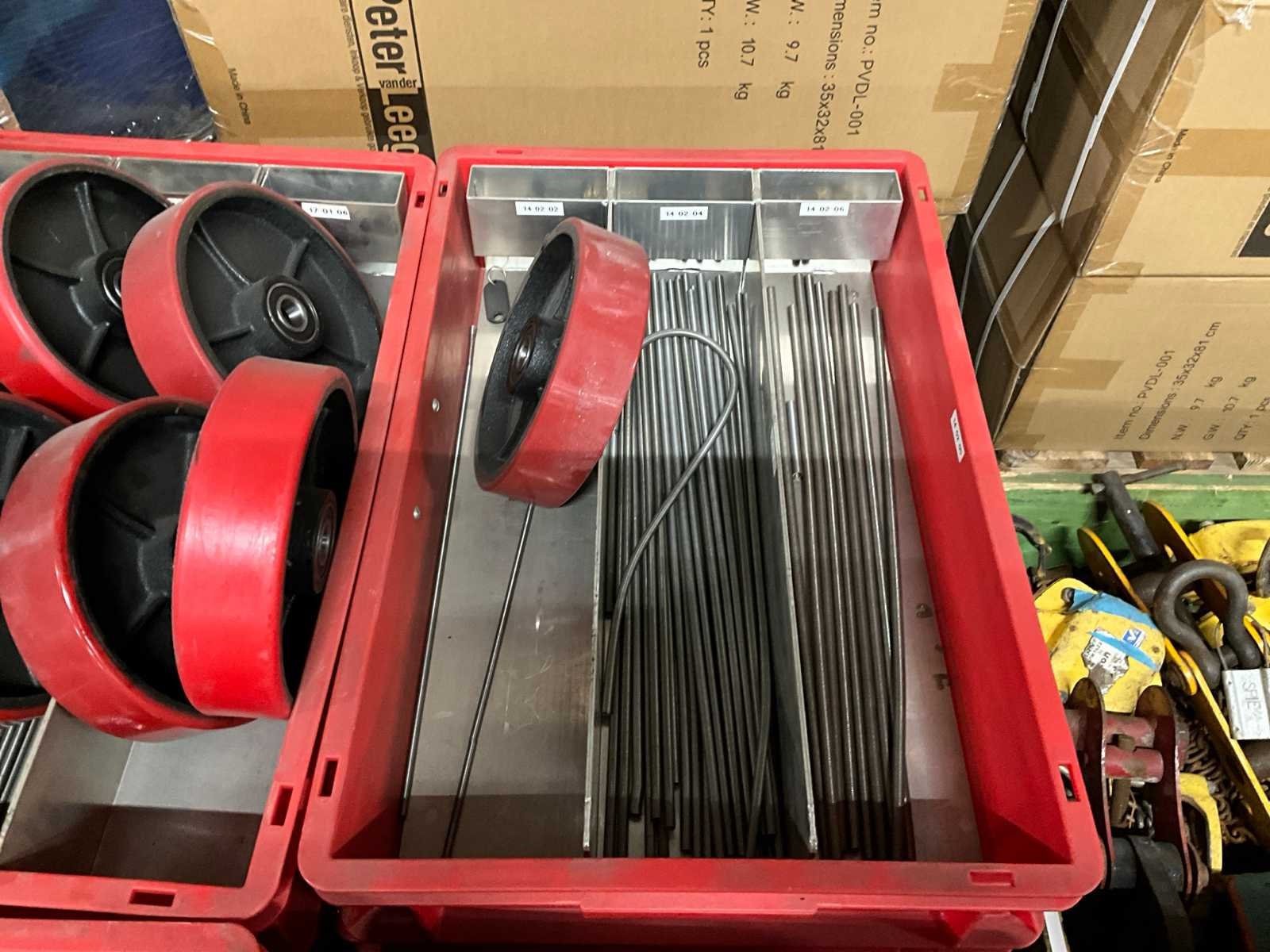 Onderdelen bestaande uit diverse veren; wielen; Let op! niet elke krat is gevuld; zonder pallet; Afmeting l: 600mm Afmeting b: 400mm Afmeting h: 100mm