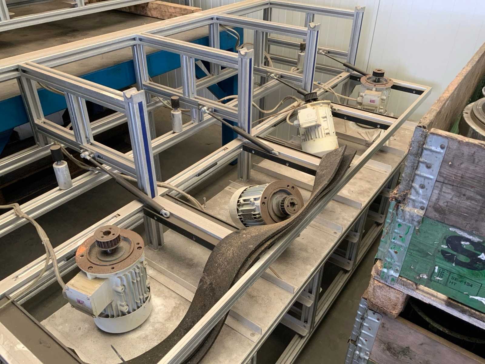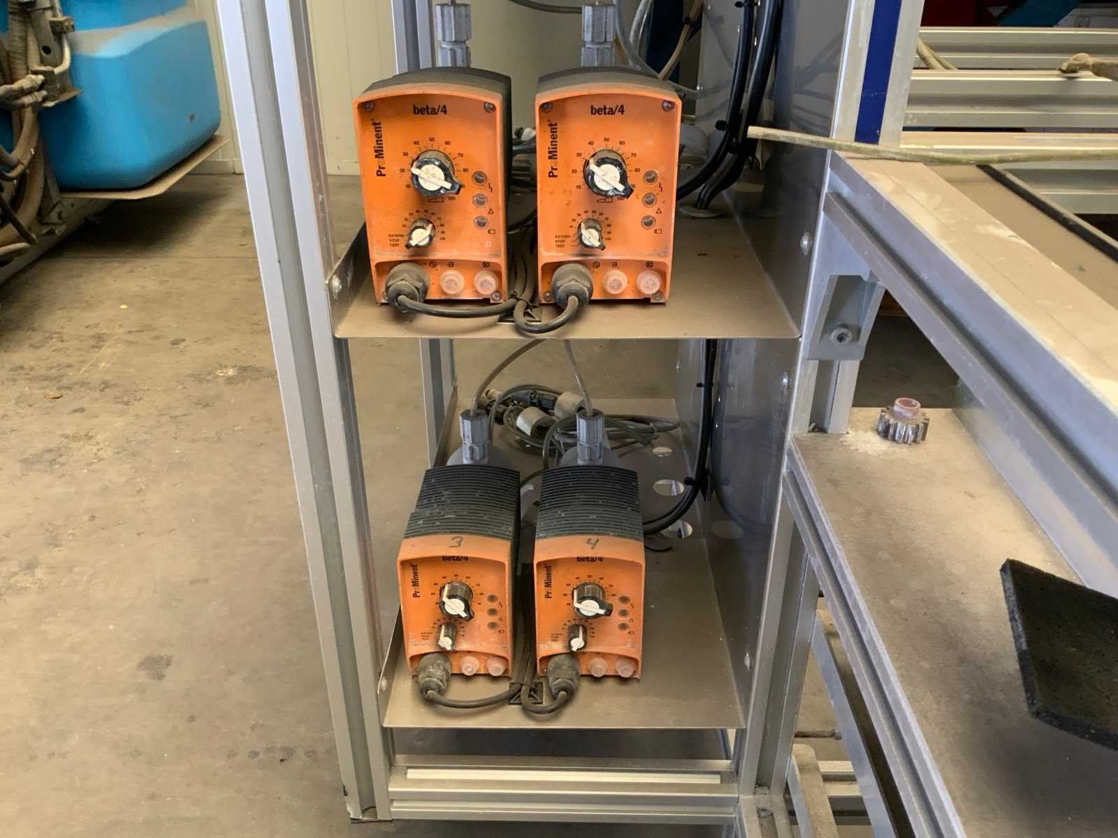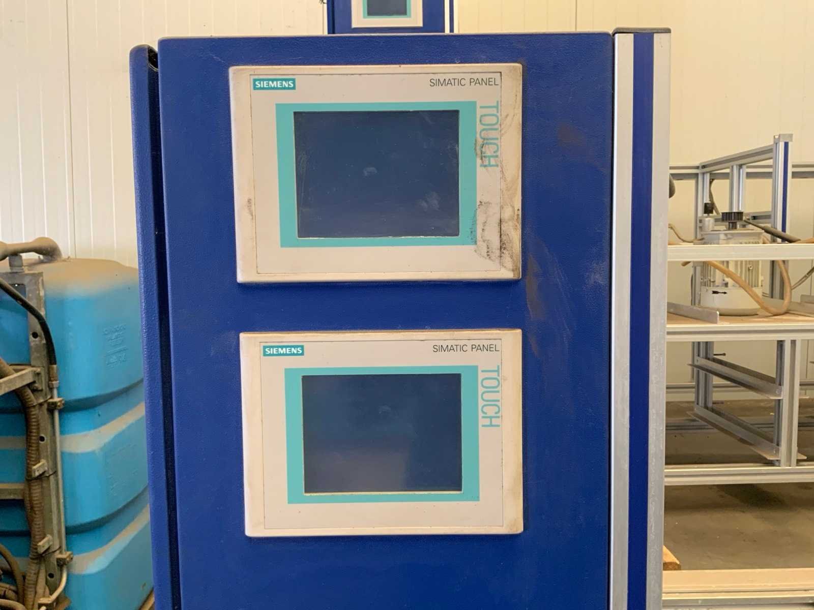 Voorzien van 4 ontbraam / polijsttrommels met deksel, op motor, vermogen: 1 KW, 4 ProMinent beta/4 doseerpompjes, 2 SIEMENS SIMATIC Toch operator panelen op aluminium frame Merk: Otec Type: CF 4x18 Afmeting l: 2430mm Afmeting b: 1200mm Afmeting h: 1760mm