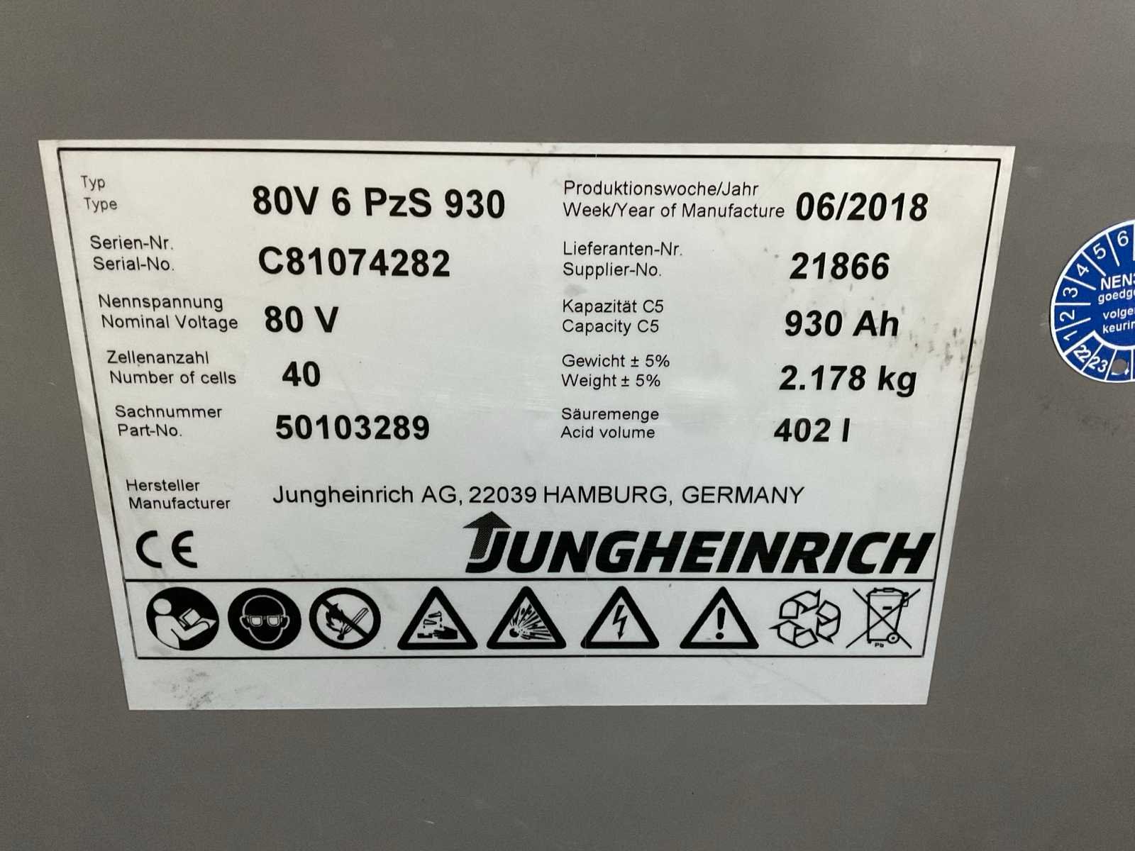2018 jungheinrich 80 volt 930 ah accupakket