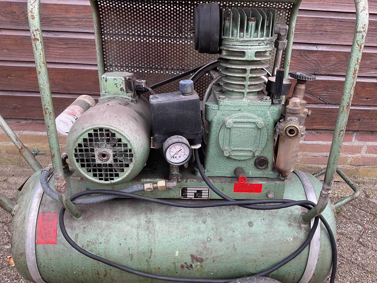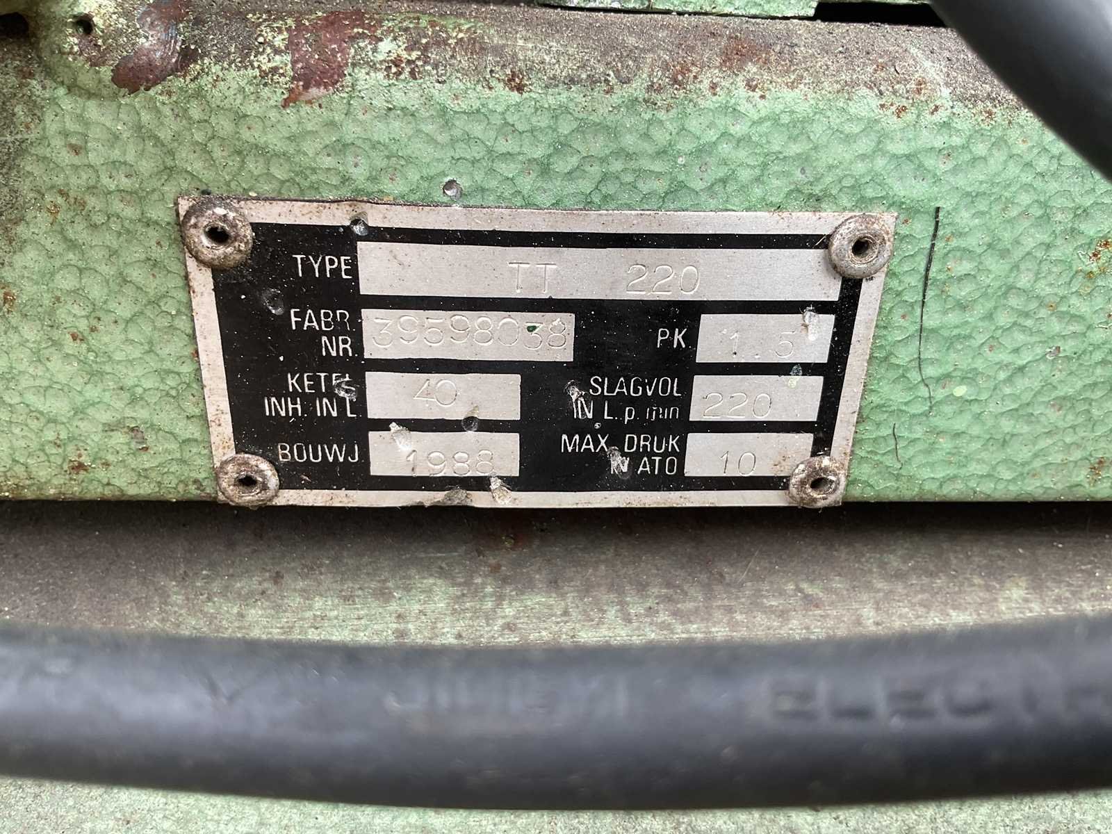 Merk: Creemers Type: TT220 Bouwjaar: 1988 Capaciteit.: 10bar Luchtstroom: 220l/min Vermogen: 1,5kW Buffertank inhoud: 40l Aansluiting: 240V Totale afmeting L: 1000mm Totale afmeting Breedte: 400mm Totale afmeting Hoogte: 750mm