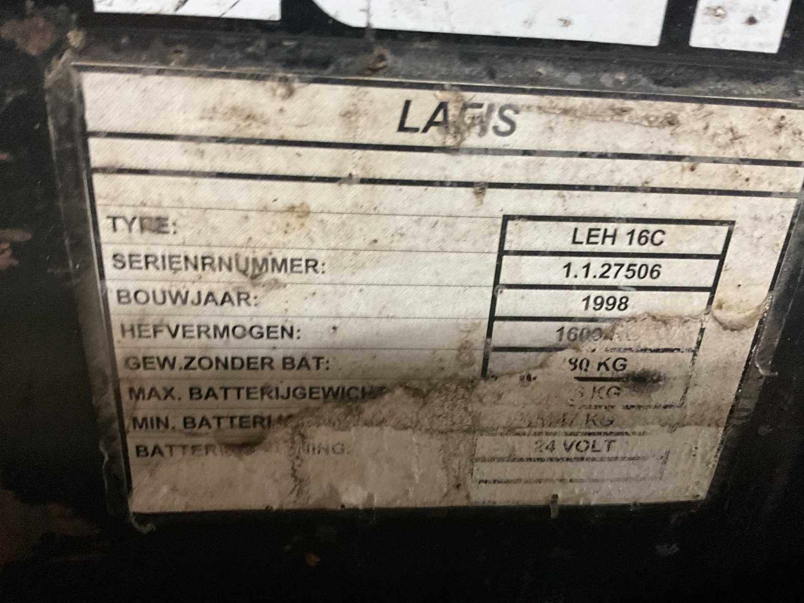 Accu slecht Merk: Lafis Type: LEH 16C Bouwjaar: 1998 Hefvermogen: 1600kg Lepellengte: 1190mm