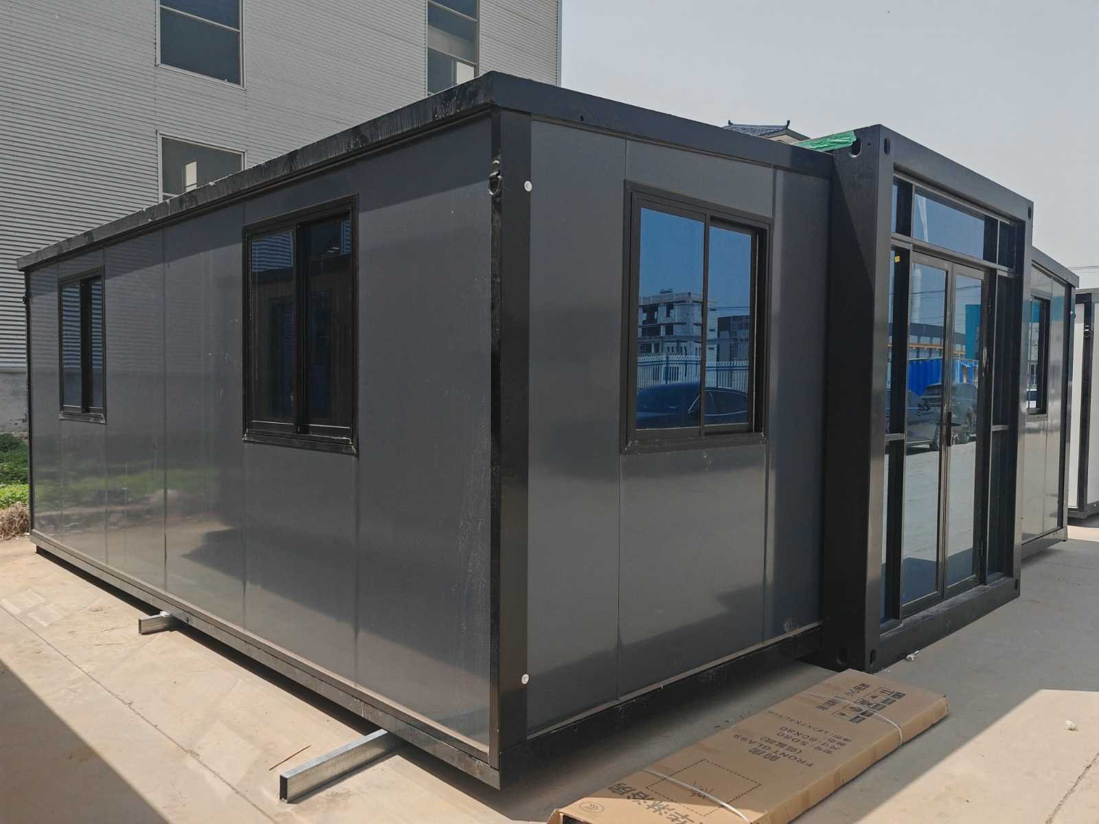 2026 rhino houses 36,5 m2 zwart 2 slaapkamers, badkamer en keuken mobiele woonunit / tiny house met luifel / balkon