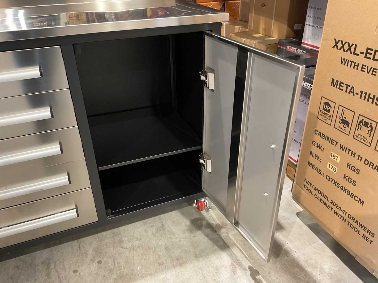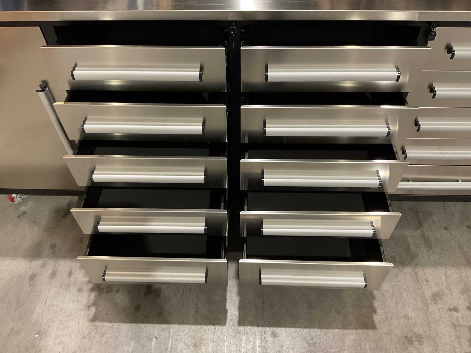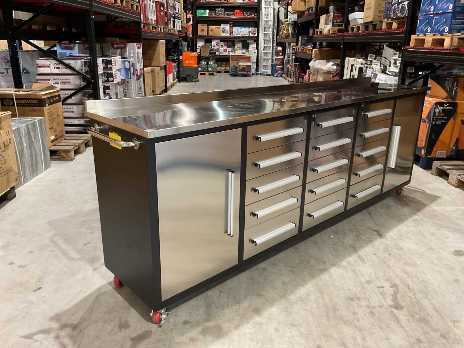 Voorzien van Gepoedercoat staal werkbank met RVS lades en deuren; 5cm opstaande rand. Merk: Rhino-Cross-Workbench Model: RVS Product type: 10FT-15D-2-01C Breedte: 30000mm Lengte: 600mm Hoogte: 1075mm Materiaal: RVS