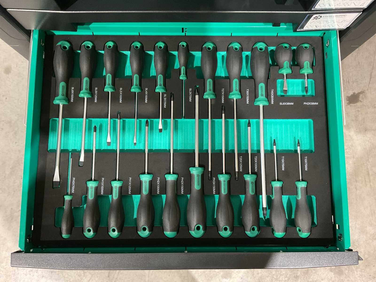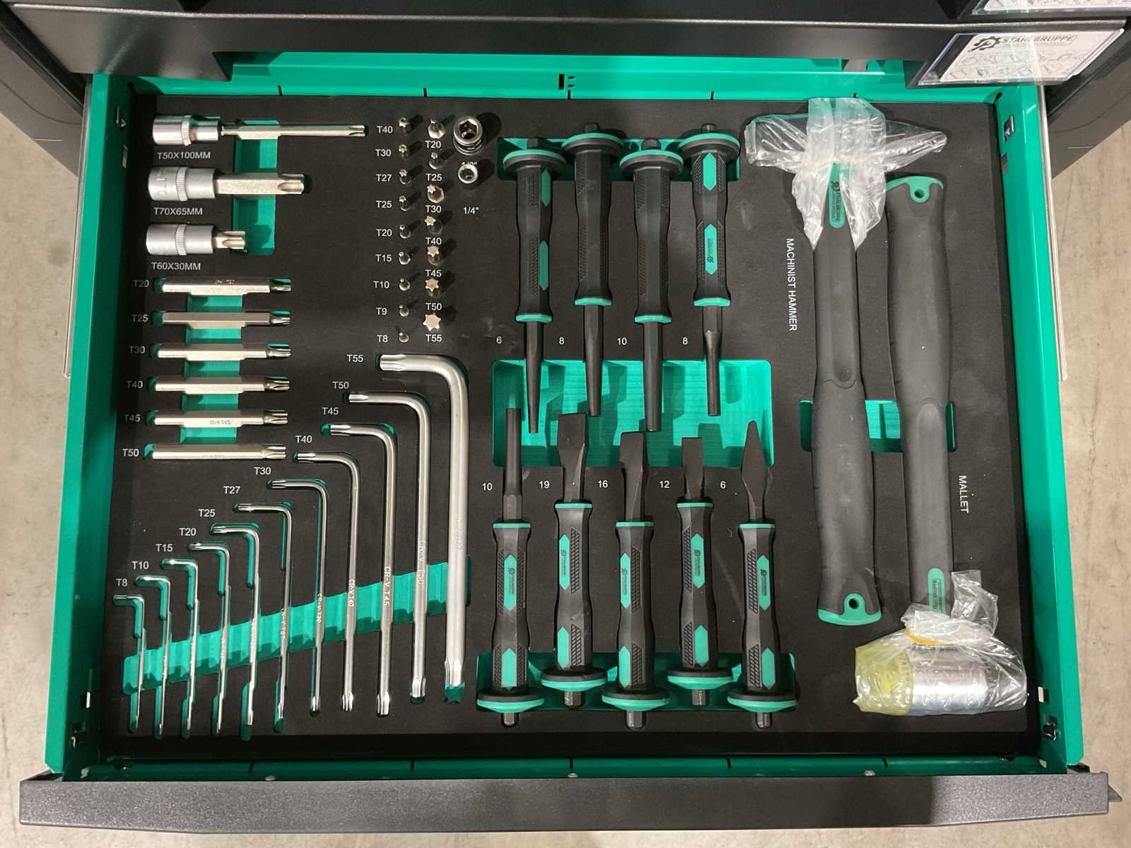 Voorzien van 7 lades waarvan 5 gevuld met gereedschap; professioneel chroom-vanadium gereedschap; heavy duty gereedschapswagen; stevig werkblad; 4 wielen; stevig handvat; ongebruikt in doos (transport afmetingen 80x50x105 cm) Merk: Stahlgruppe Type: SG9 Bouwjaar: 2025 Aantal laden: 7 Met inhoud: true Eigen gewicht: 78kg Totale afmeting L: 800mm Totale afmeting Breedte: 500mm Totale afmeting Hoogte: 1050mm