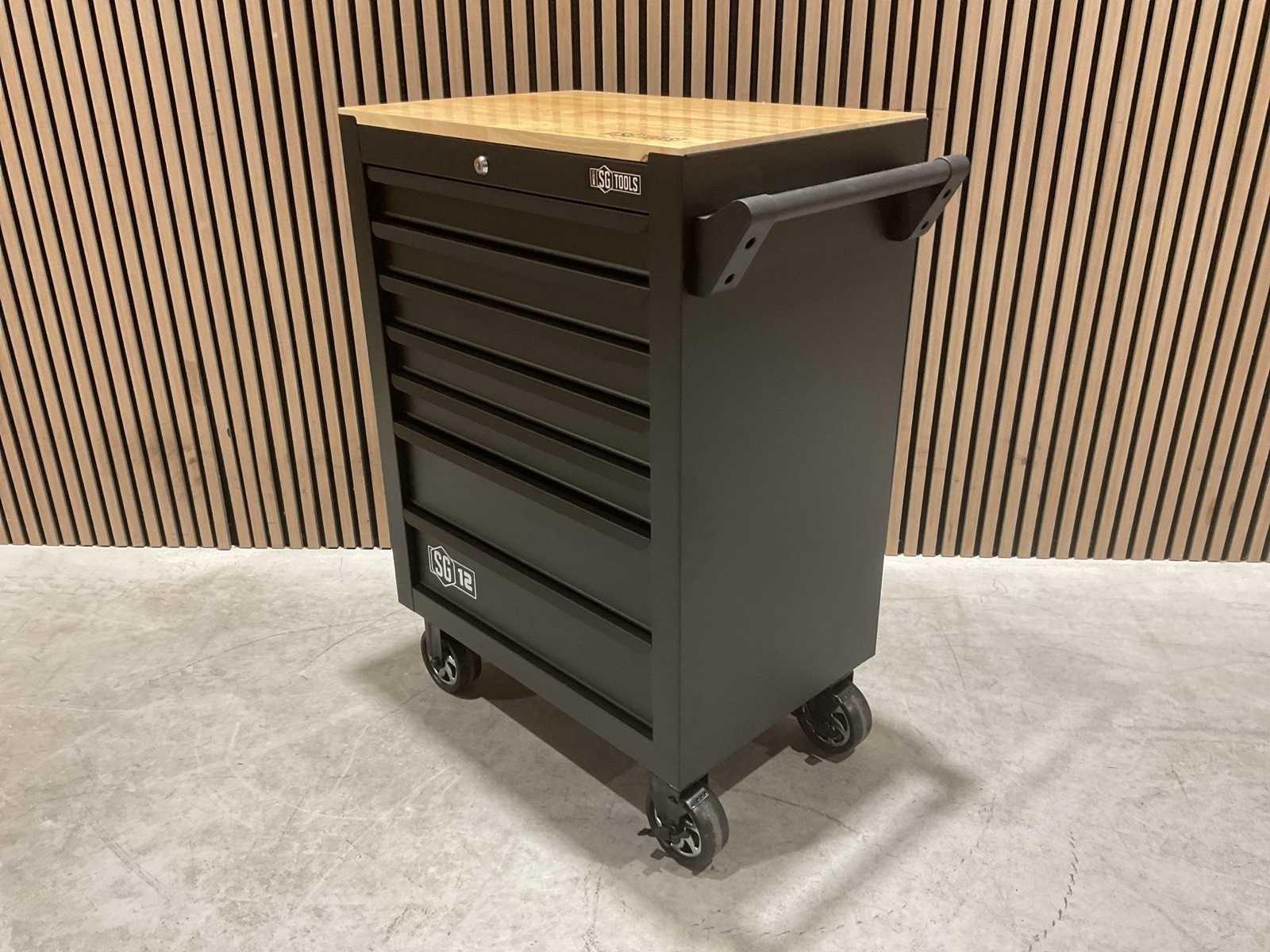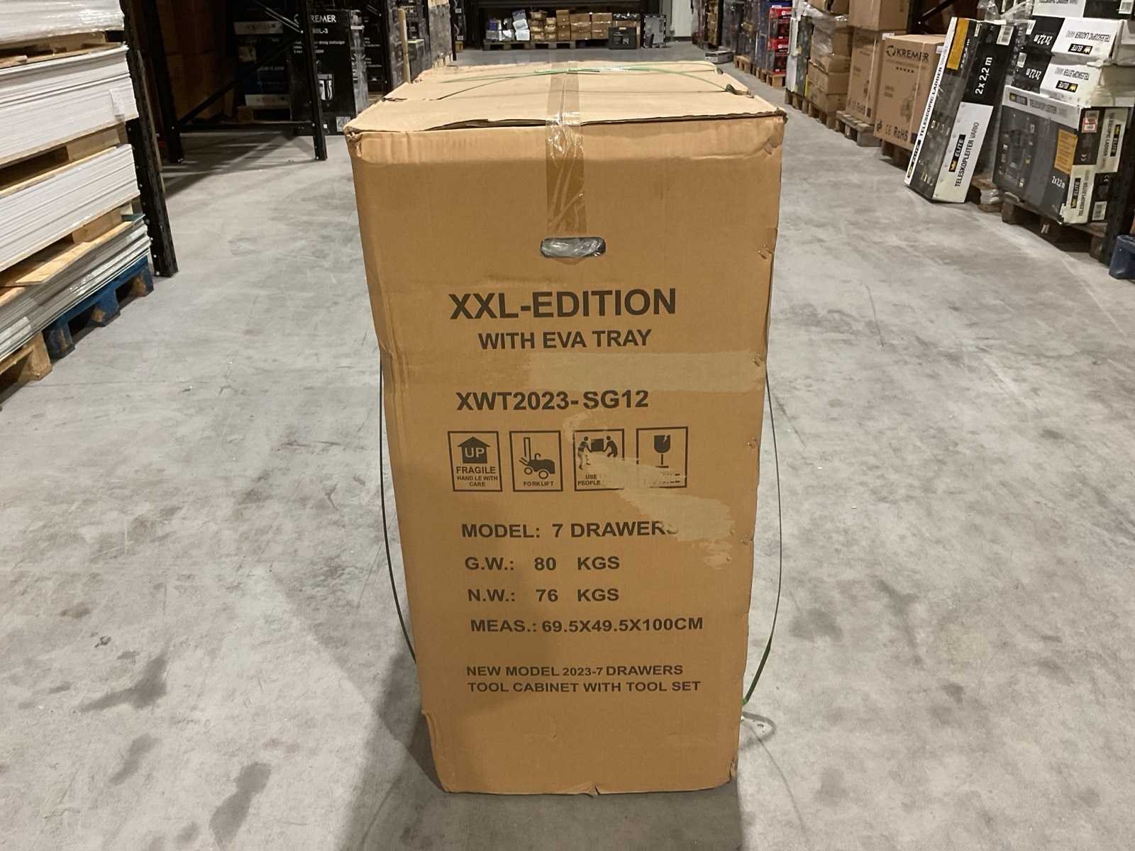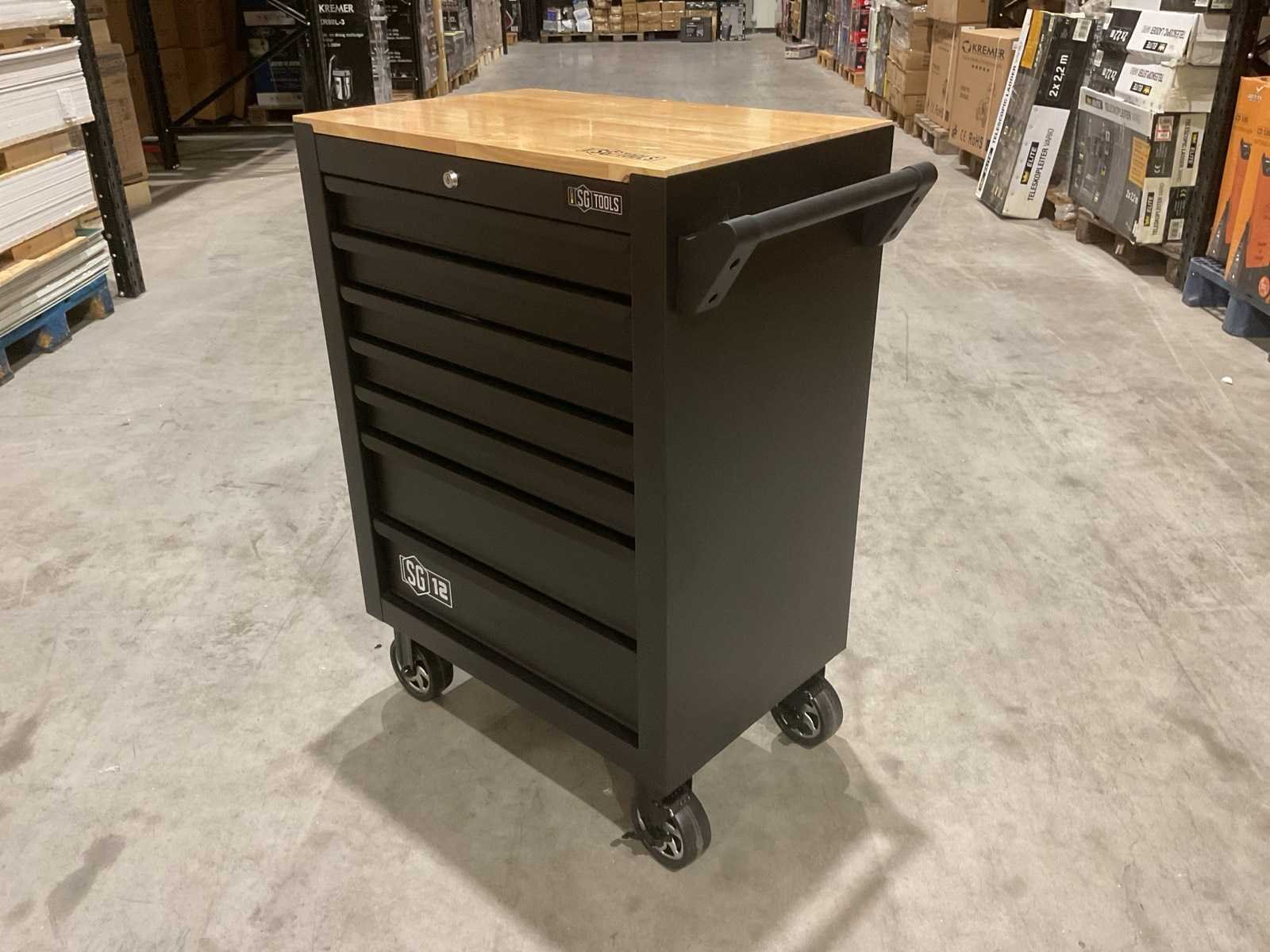 Voorzien van Lades: 7 lades, waarvan 6 gevuld; Aantal tools/onderdelen: 278 stuks; Wielen: 4 wielen, waarvan 2 zwenkwielen met rem; Afwerking: mat zwart, milieuvriendelijke poedercoating; Transport gewicht: 80kg; afmetingen 70x50x101cm; ongebruikt in doos Merk: SG TOOLS Type: XWT2023-SG12 Met inhoud: true Eigen gewicht: 76kg Totale afmeting L: 695mm Totale afmeting Breedte: 495mm Totale afmeting Hoogte: 100mm