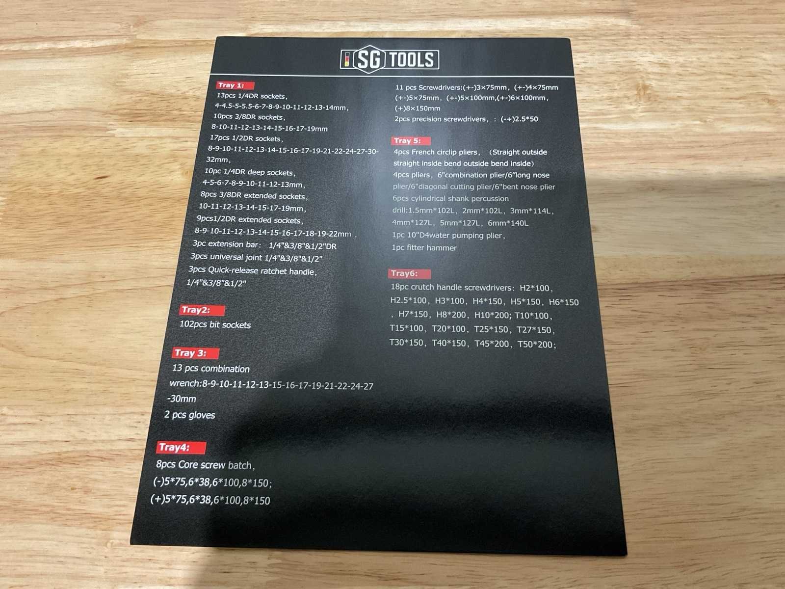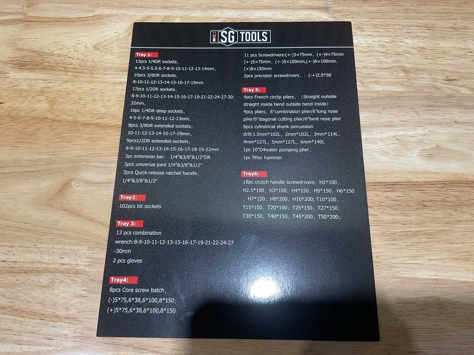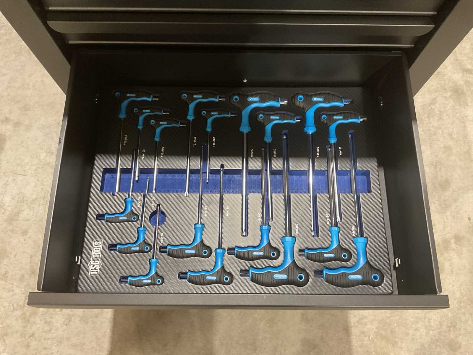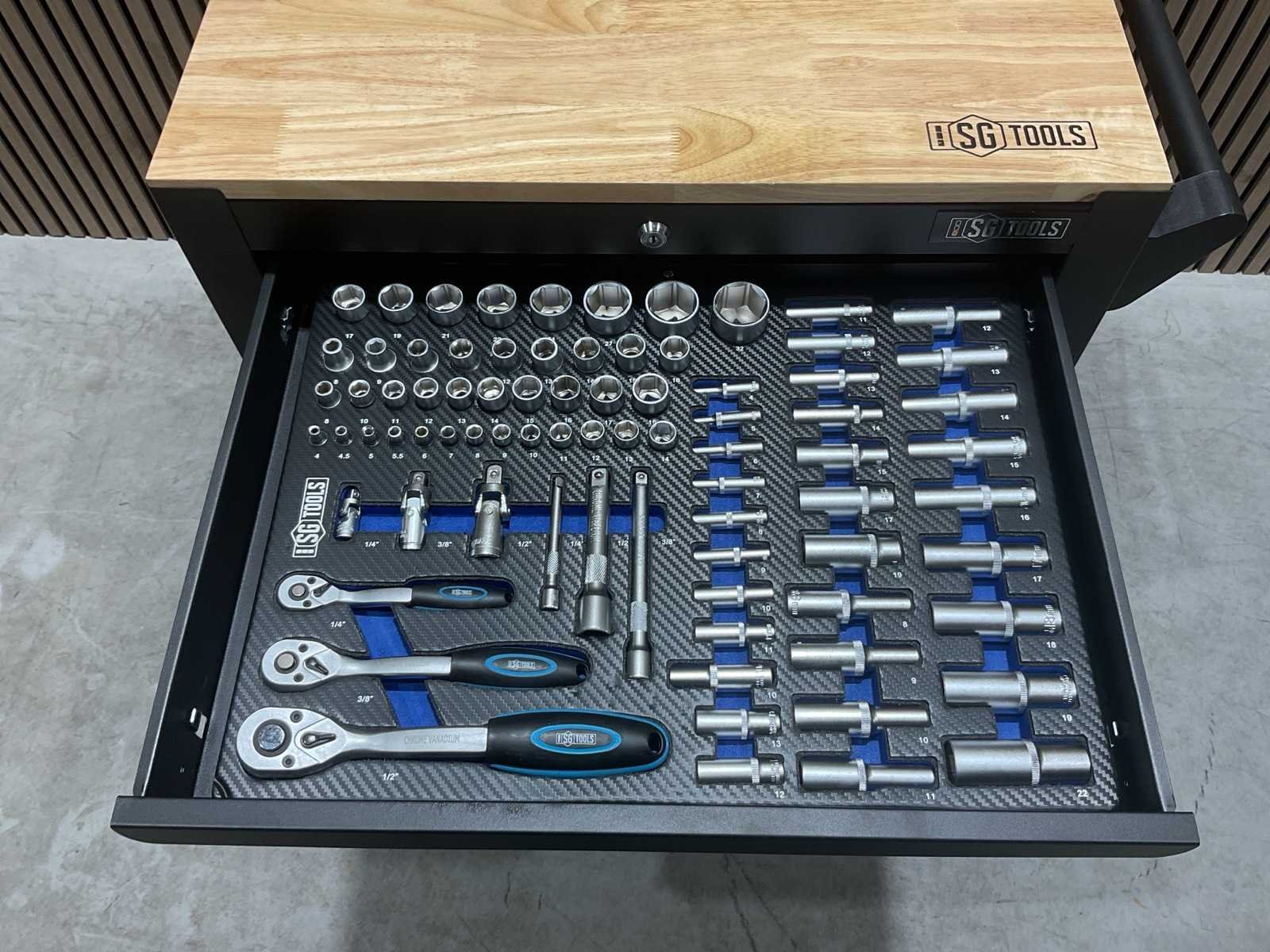 Voorzien van Lades: 7 lades, waarvan 6 gevuld; Aantal tools/onderdelen: 278 stuks; Wielen: 4 wielen, waarvan 2 zwenkwielen met rem; Afwerking: mat zwart, milieuvriendelijke poedercoating; Transport gewicht: 80kg; afmetingen 70x50x101cm; ongebruikt in doos Merk: SG TOOLS Type: XWT2023-SG12 Met inhoud: true Eigen gewicht: 76kg Totale afmeting L: 695mm Totale afmeting Breedte: 495mm Totale afmeting Hoogte: 100mm