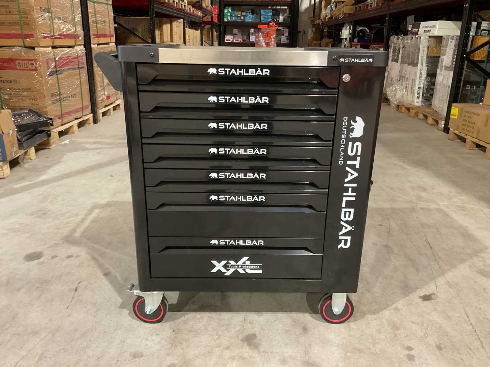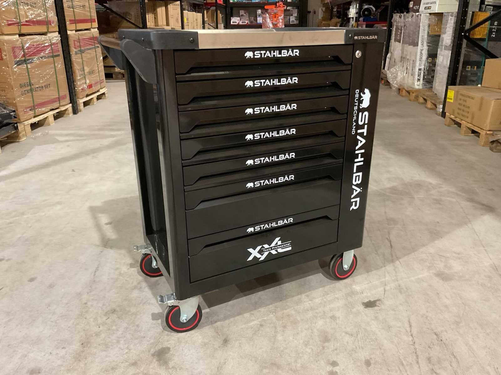 Voorzien van 7 lades waarvan 7 gevuld met gereedschap; professioneel chroom-vanadium gereedschap; heavy duty gereedschapswagen; stevig werkblad; 4 wielen; stevig handvat; ongebruikt in doos (transport afmetingen 80x50x85 cm) Merk: Stahlbär Type: Deutschland 7/7 Bouwjaar: 2025 Aantal laden: 7 Met inhoud: true Eigen gewicht: 78kg Totale afmeting L: 800mm Totale afmeting Breedte: 500mm Totale afmeting Hoogte: 850mm