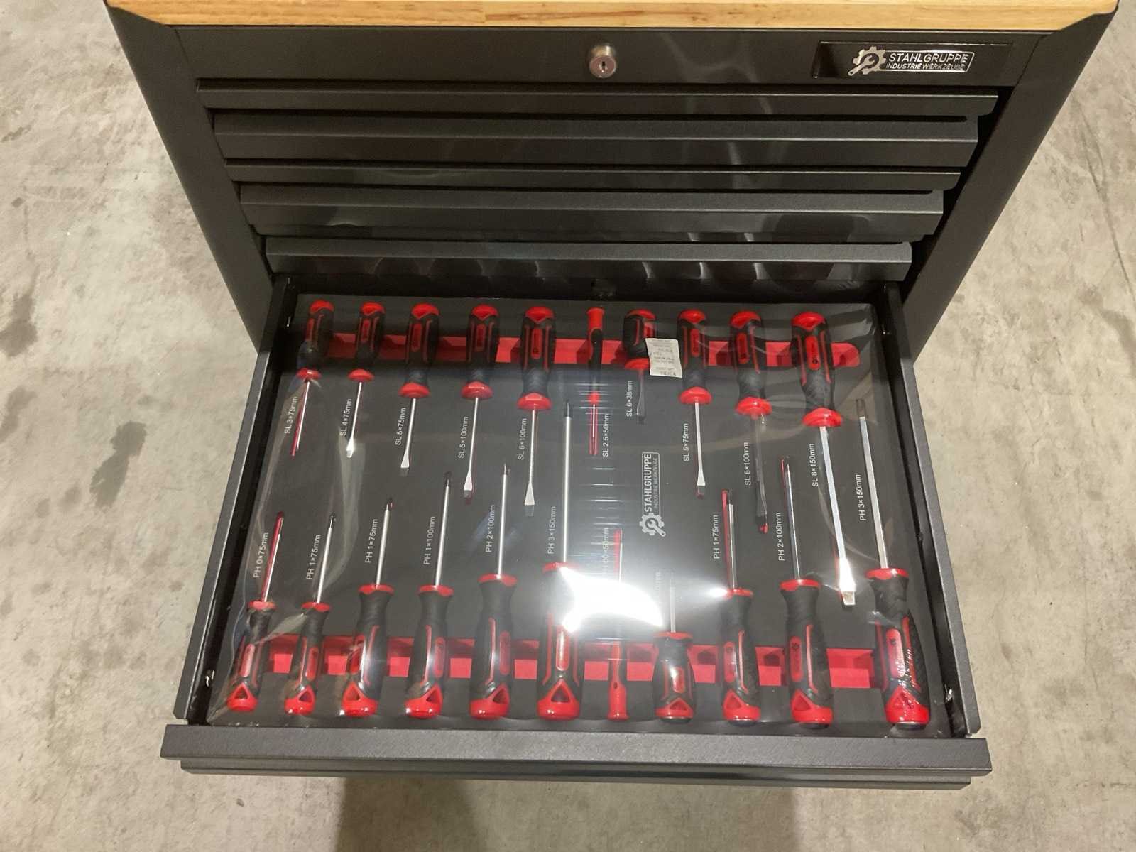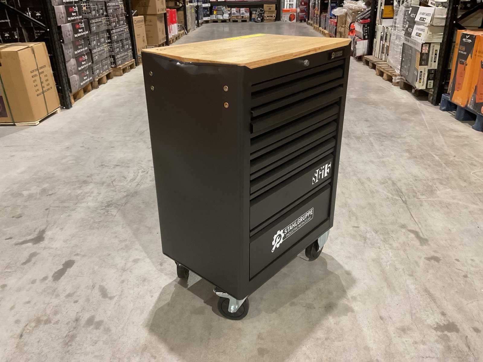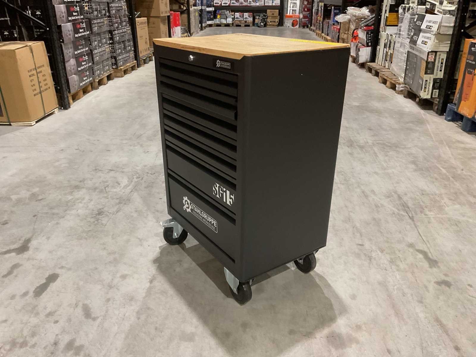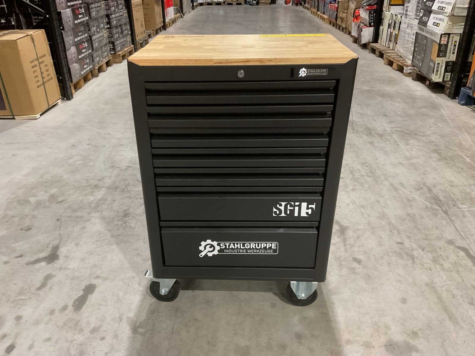 Voorzien van 7 lades waarvan 6 gevuld met gereedschap; professioneel chroom-vanadium gereedschap; heavy duty gereedschapswagen; houten werkblad; 4 wielen; stevig handvat; (transport afmetingen 70x50x105 cm); Let op transports schade Merk: Stahlgruppe Type: SG15 Bouwjaar: 2025 Aantal laden: 7 Met inhoud: true Eigen gewicht: 77kg Totale afmeting L: 68mm Totale afmeting Breedte: 48mm Totale afmeting Hoogte: 104mm