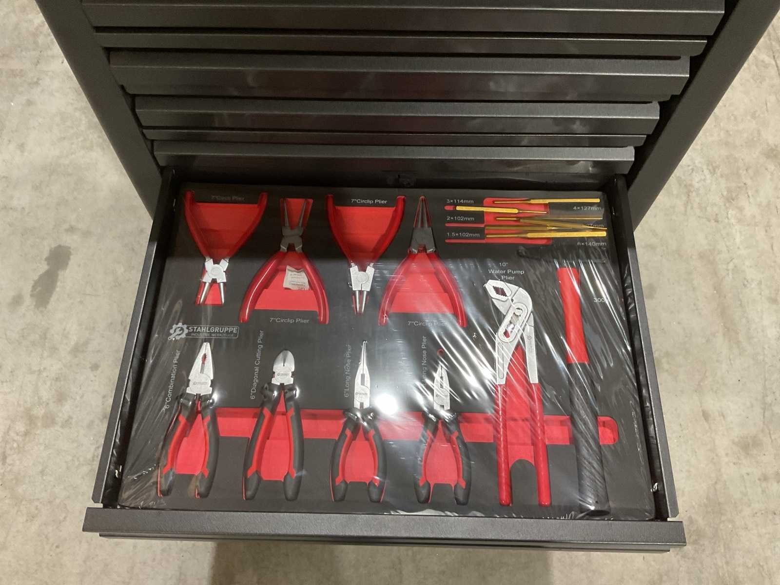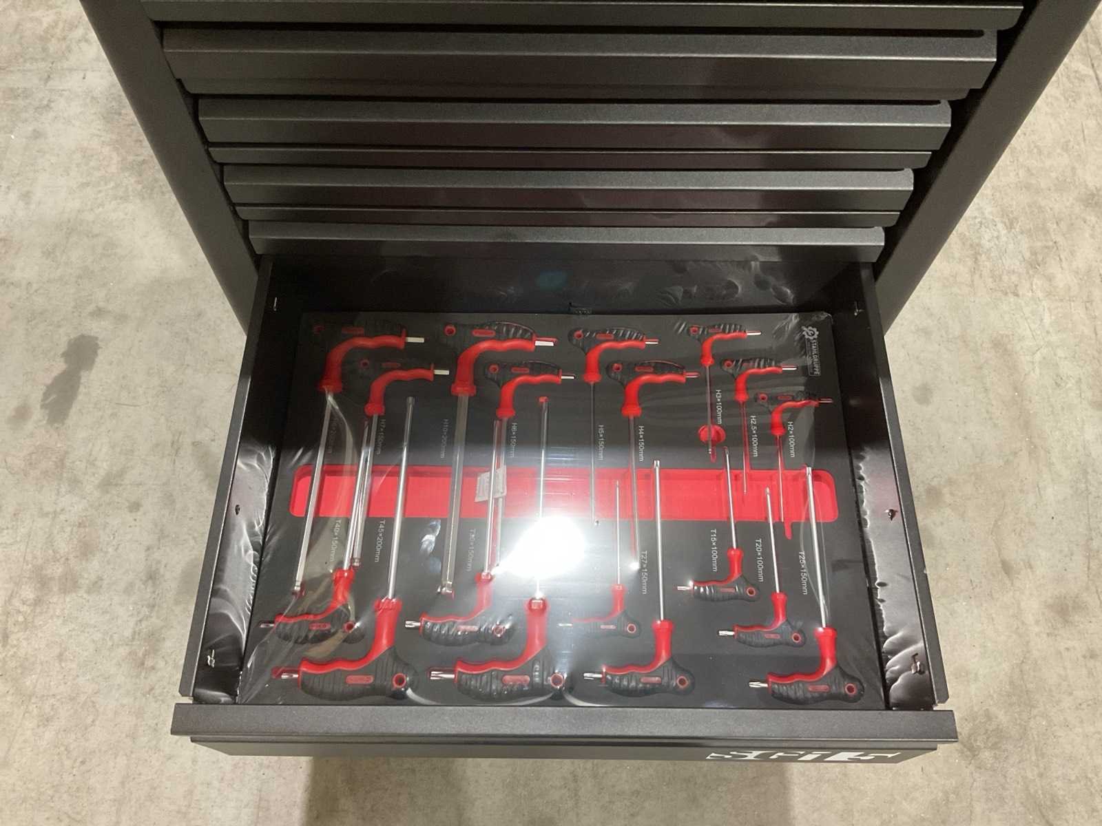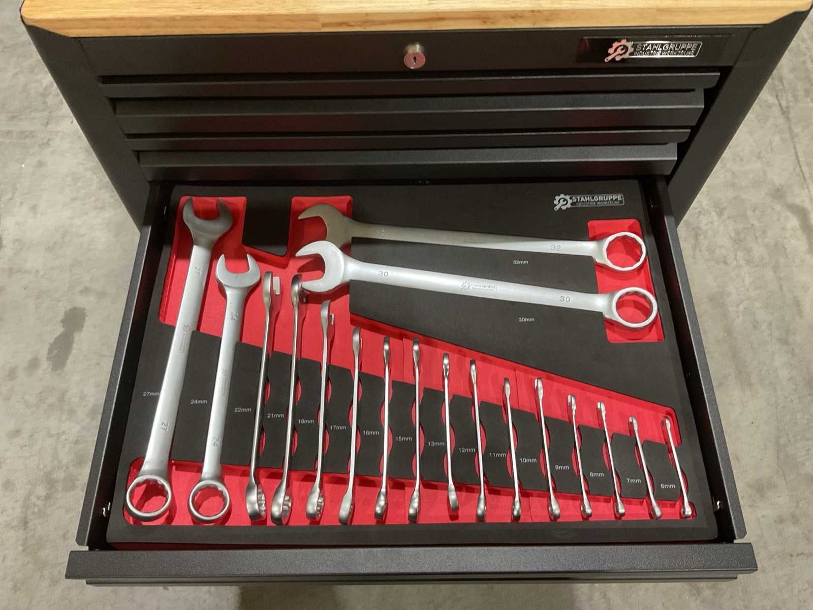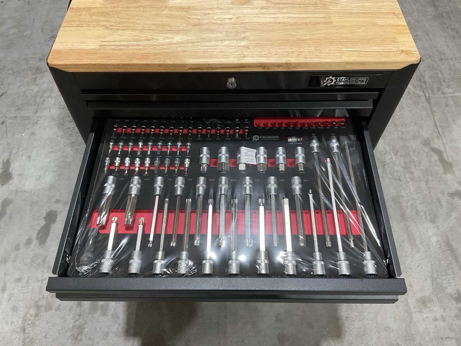 Voorzien van 7 lades waarvan 6 gevuld met gereedschap; professioneel chroom-vanadium gereedschap; heavy duty gereedschapswagen; houten werkblad; 4 wielen; stevig handvat; (transport afmetingen 70x50x105 cm); Let op transports schade Merk: Stahlgruppe Type: SG15 Bouwjaar: 2025 Aantal laden: 7 Met inhoud: true Eigen gewicht: 77kg Totale afmeting L: 68mm Totale afmeting Breedte: 48mm Totale afmeting Hoogte: 104mm