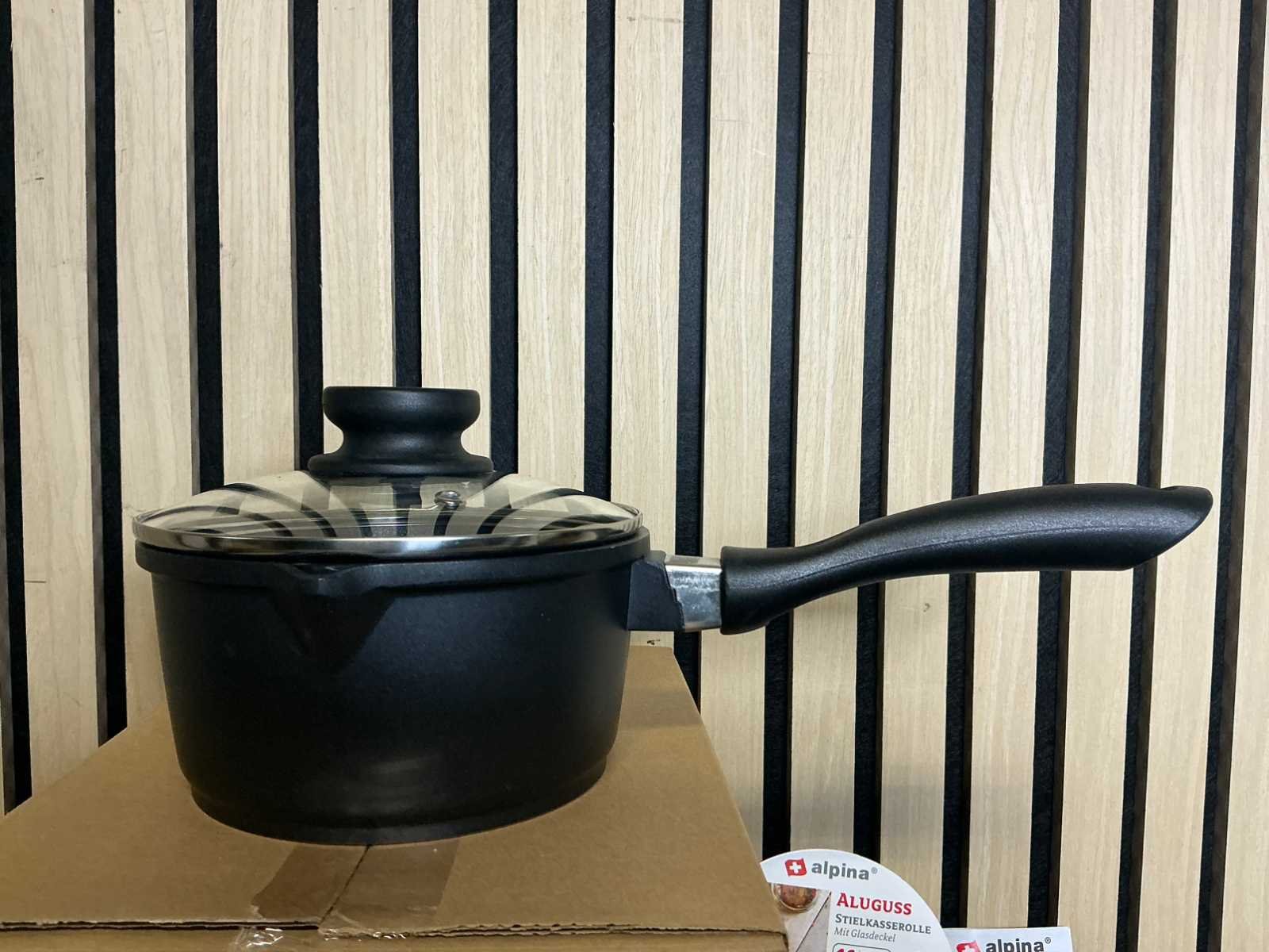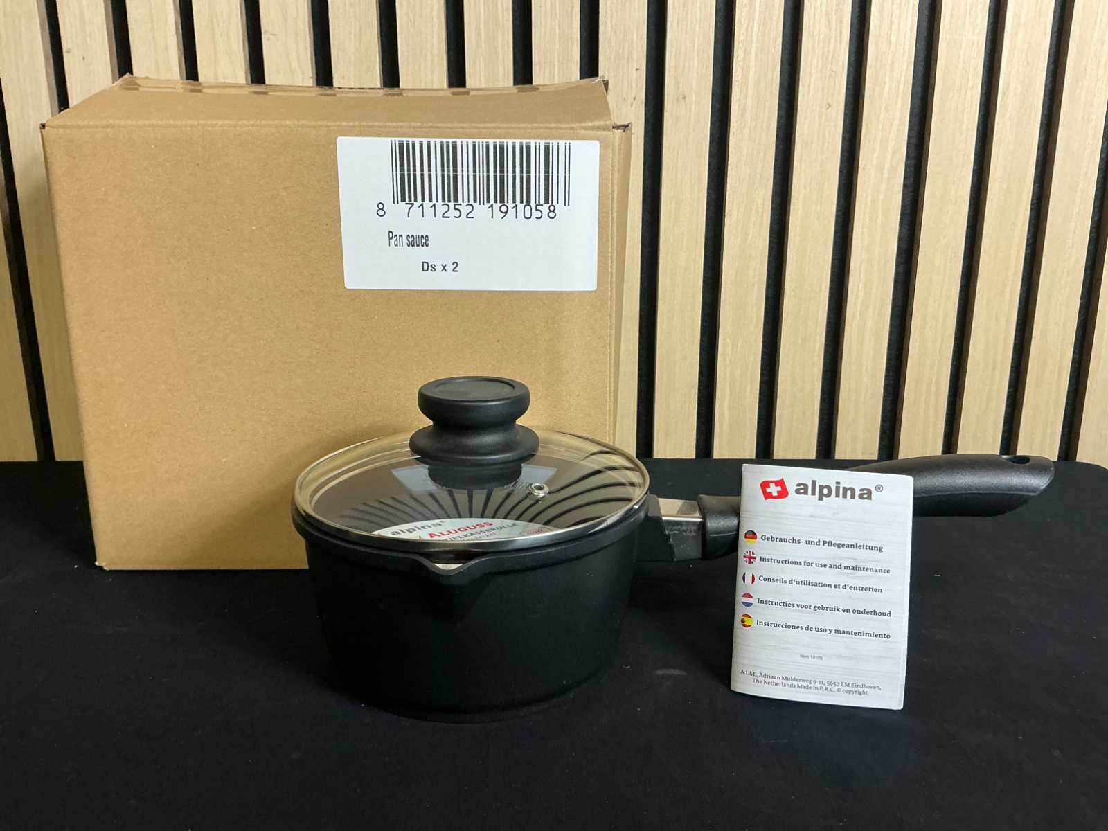 Product zit ongebruikt in de originele verpakking Afmetingen: Ø 16 cm x 8,5 cm Inhoud: 1,3 liter Vaatwasmaschinebestendig Geschikt voor alle soorten warmtebronnen Merk: Alpina Kleur: Zwart